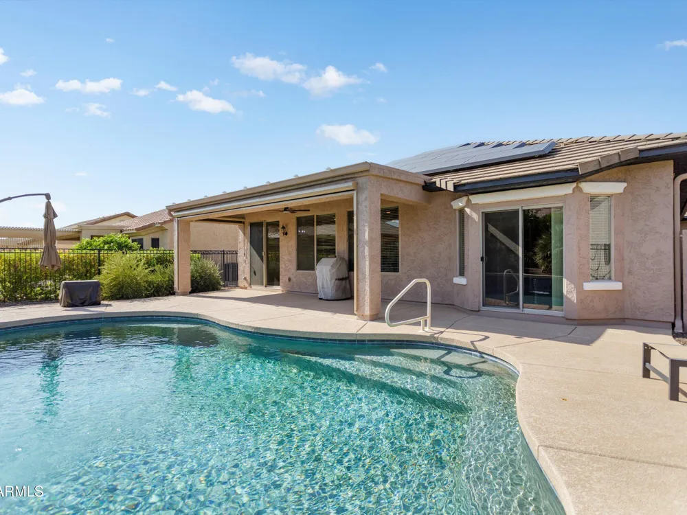 LOOK NO FURTHER, THIS REMODELED GALA MODEL WITH OWNED SOLAR, HEATED/COOLED POOL, LOADED WITH UPGRADES, IS A MUST SEE! Enter this open concept floor plan w/contemporary tile flooring throughout. The Inviting living area offers plenty of room for dining and features a huge picture window, flooding the space with natural light. The remodeled kitchen is a chefs delight with newer appliances upgraded cabinets, custom backsplash and miles of sleek quartz counters. The owner's suite is complete with sliding glass door and updated adjoining bath and walk in closet. The 2nd bedroom offers privacy and adjacent remodeled bath w/step in shower. The den can be used as an office or for hobbies. Step outside to your private desert oasis with an extended patio overlooking the sparkling pool.