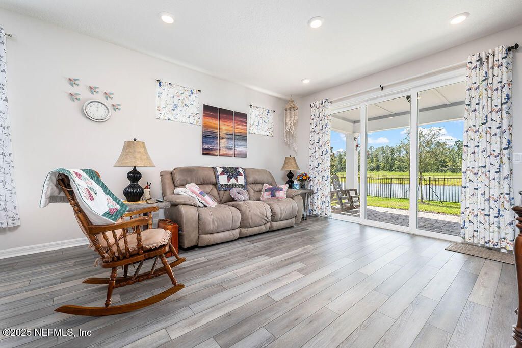 Elevate your lifestyle in this nearly new 55+ Residence with picturesque water views in the Exclusive GATED Grand Oaks Community! Discover a world of possibilities with incredible upgrades and natural lighting throughout! Enjoy such features as high ceilings, and stunning LVP with carpet only the bedrooms! Be inspired by the gourmet kitchen with upgraded shaker style cabinets, soft close drawers, an expansive quartz island/breakfast bar, and all stainless steel appliances! Unwind in the open and inviting living room with breathtaking backyard views, PLUS, a private office/flex space awaits your creativity! Retreat to the serene primary bedroom with walk-in closet pocket doors that lead to the luxurious en suite with quartz countertop vanity and tiled walk-In shower with grab bar! Step outside to the expansive covered lanai perfect for entertaining or simply relaxing enjoying your morning coffee watching all the hummingbirds! Enjoy a Leisurely Stroll to the World-Class Amenity Center, including pickleball, bocce ball courts, outdoor firepit and fireplace, community garden, fitness center, a resort-style pool and more! Book your showing today! OCCUPIED and MUST HAVE CONFIRMED APPOINTMENT ** NO SIGN IN YARD