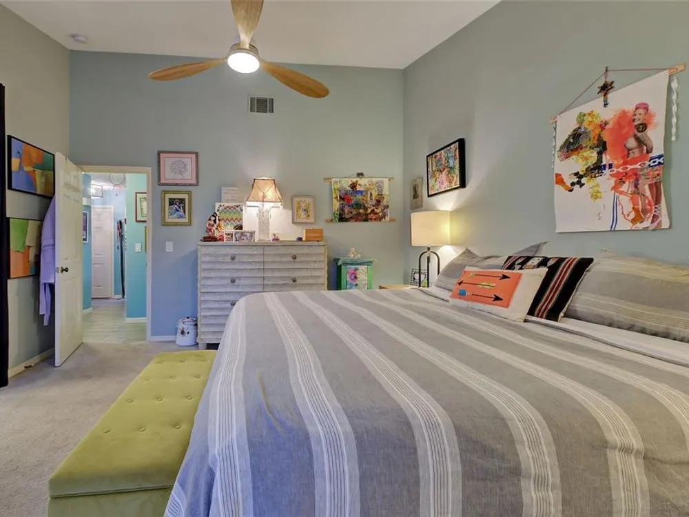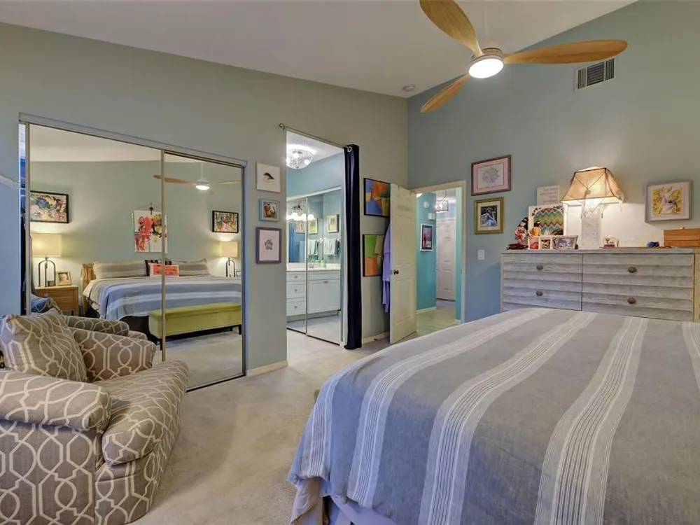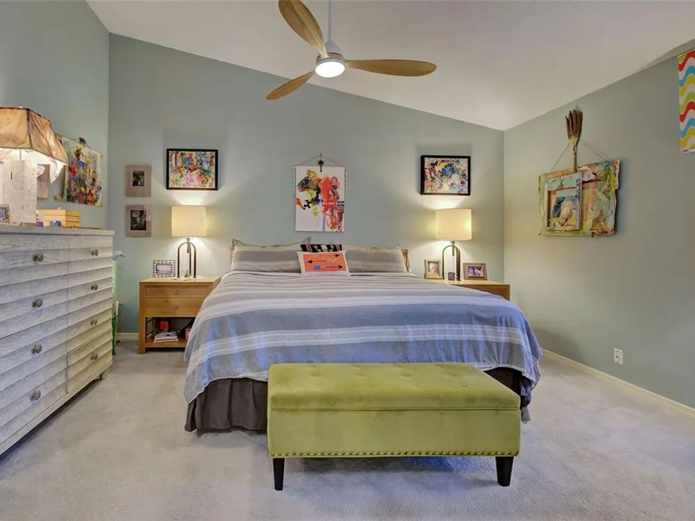 - Cathedral Ceiling(s), Ceiling Fan(s), Eat-in Kitchen, High Ceilings, L-Shaped Dining Room, Living/Dining Room, Main Level Primary, Solid Surface Counters, Stone Counters, Vaulted Ceiling(s), Walk-In Closet(s), Window Treatments