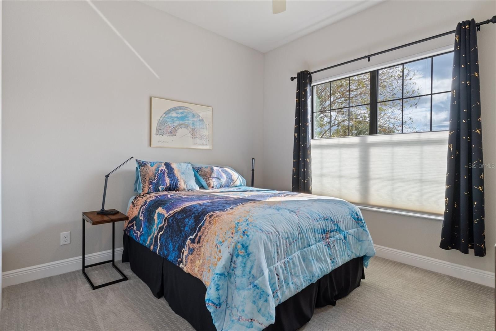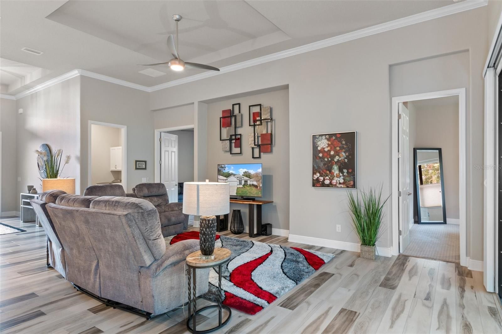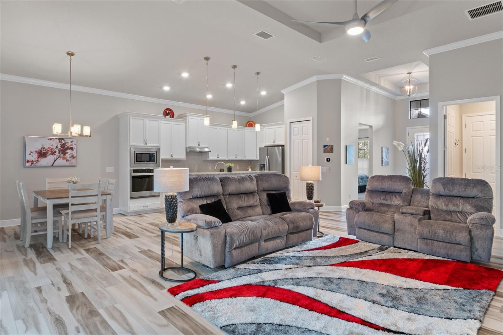 - Ceiling Fan(s), Crown Molding, Eat-in Kitchen, High Ceilings, Kitchen/Family Room Combo, Open Floorplan, Main Level Primary, Solid Surface Counters, Split Bedrooms, Stone Counters, Thermostat, Tray Ceiling(s), Walk-In Closet(s), Window Treatments