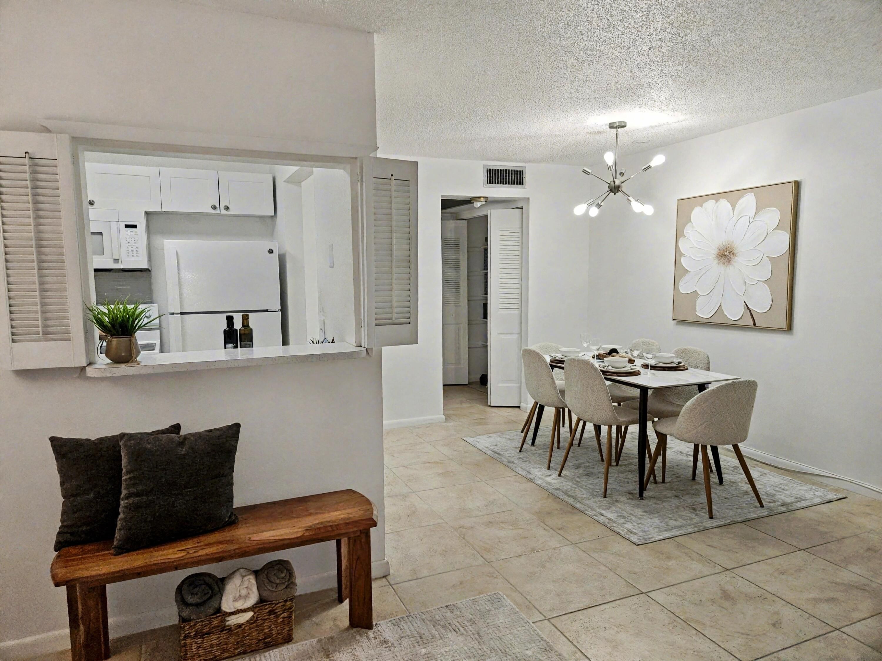 Step into this inviting first-floor corner condo and immediately feel at home. Designed for comfort and convenience, this stylish residence features central AC and hurricane-impact windows for year-round peace of mind. The open layout highlights sleek ceramic tile flooring, tastefully updated bathrooms, new lighting, and crisp white cabinetry complemented by a modern tile backsplash. Enjoy tranquil Florida evenings from your screened-in balcony with sunset views.