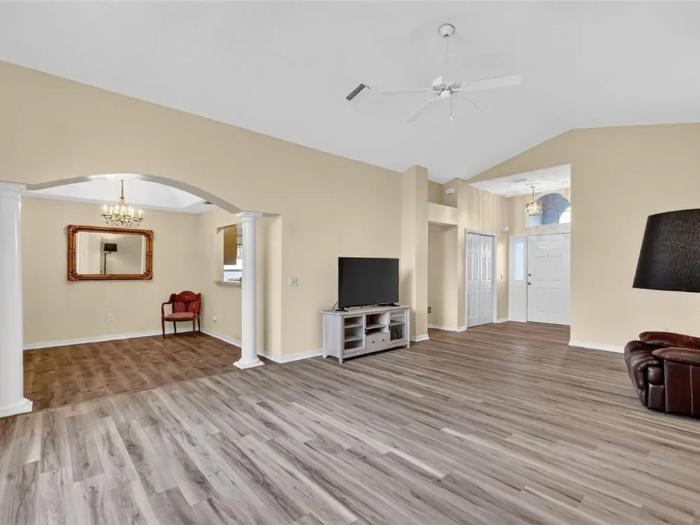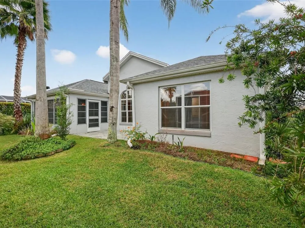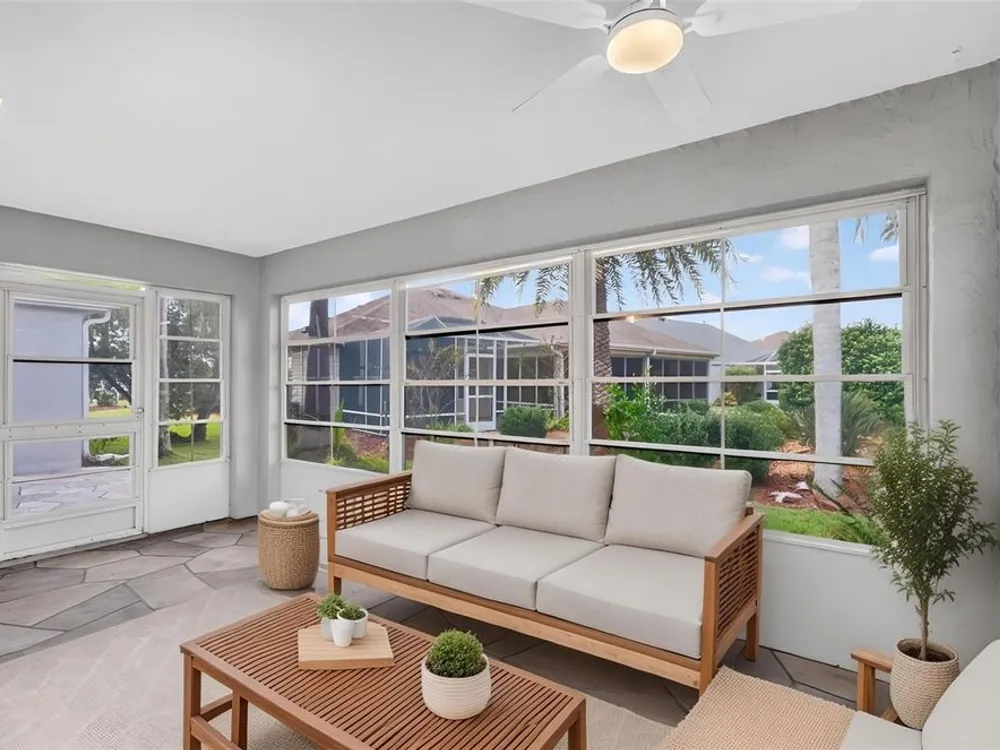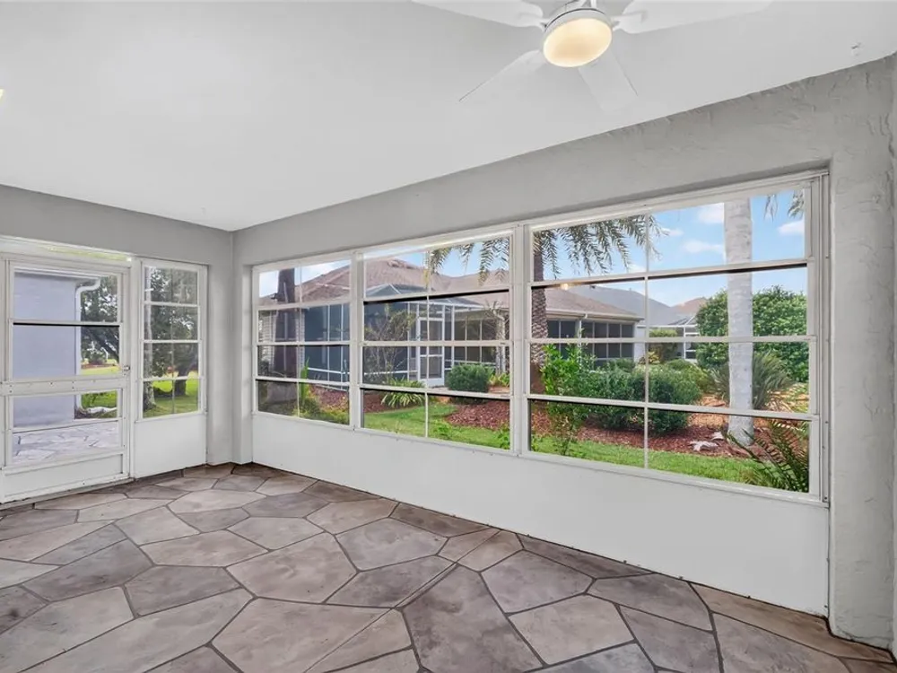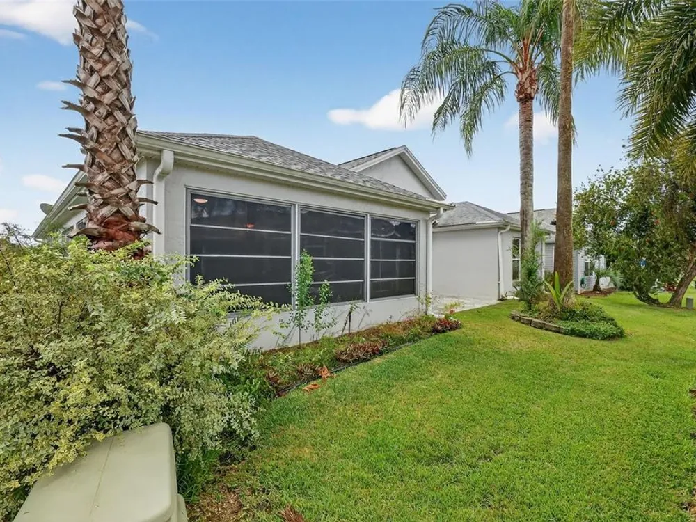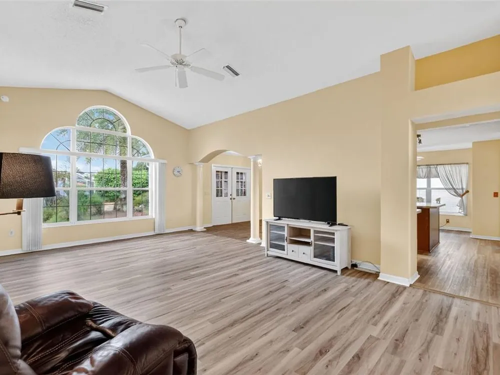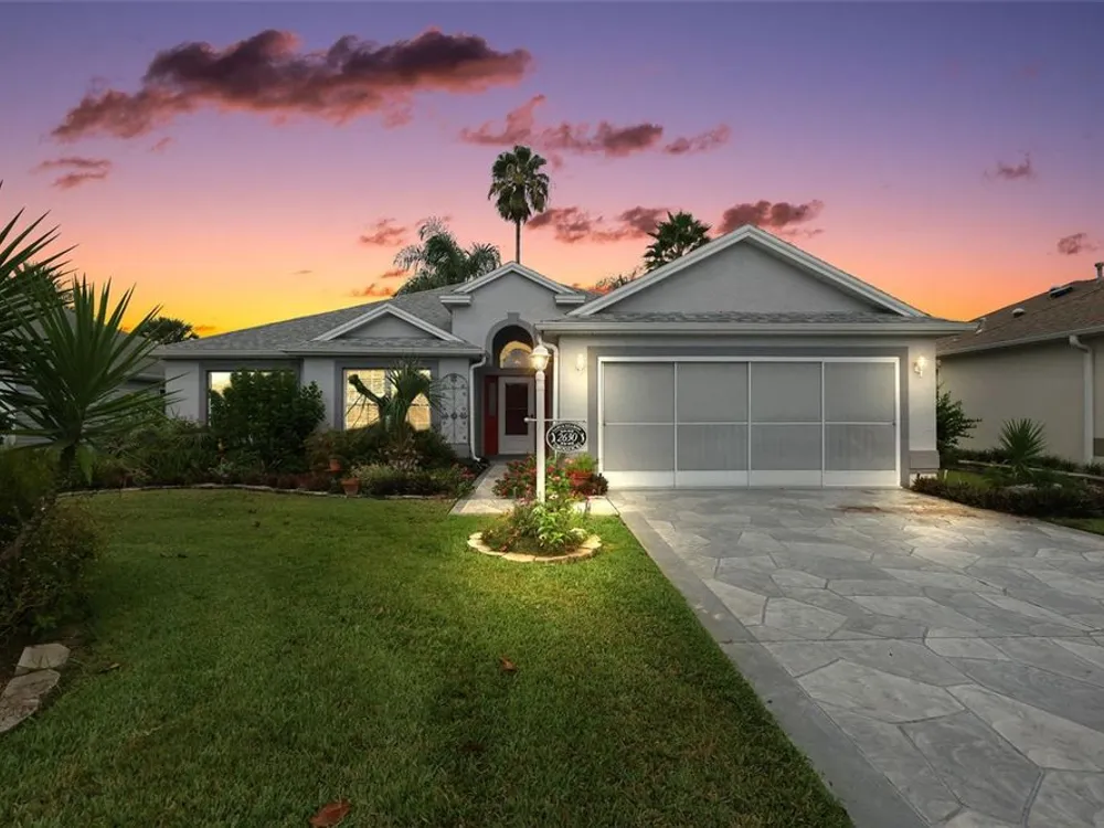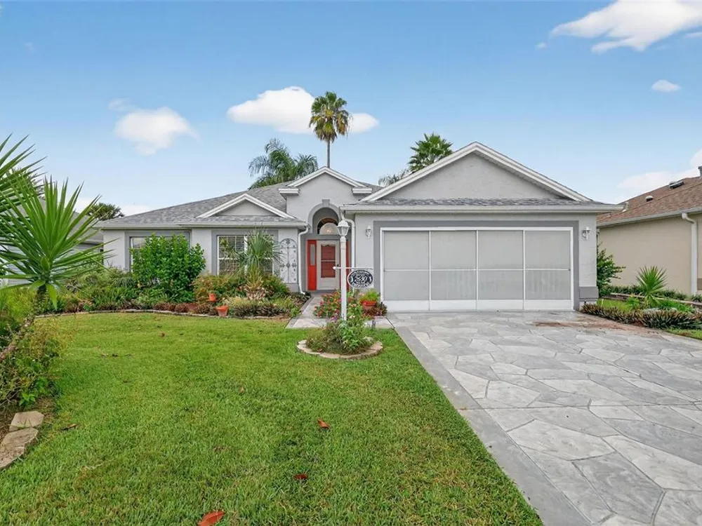 One or more photo(s) has been virtually staged. FANTASTIC 3/2 Cancun (Oleander) with ENCLOSED LANAI and REAR PATIO nestled in the highly desirable Village of Santiago! BOND PAID! CUSTOM PAINTED drive and walk ways; LUSH, TROPICAL landscaping; and an ARCHED front entry with DOUBLE side lites and half-round TRANSOM window welcome you in to the well-lit, GENEROUS foyer of this AMAZING home boasting a CONVENIENT ENTRY CLOSET! From the foyer, step into the IMPRESSIVE living room with its soaring VAULTED ceilings and FABULOUS Palladian window that floods the space with NATURAL LIGHT while serving as an architectural focal point. Adding to the beauty of the home is LUXURY VINYL PLANK flooring that can be found THROUGHOUT, offering both elegance and easy maintenance. Just off of the living room, you will find the FORMAL dining room boasting OPULENT columns, TRAY ceiling, pass-thru window to the kitchen, and a GORGEOUS antique crystal chandelier. There are also, DOUBLE French doors that lead to an ENCLOSED LANAI with an adjoining REAR PATIO. Both of theses areas showcase beautifully painted decorative floors and create the IDEAL SPACE for hosting gatherings or simply relaxing with friends and family! Back inside, the inviting kitchen boasts RICH WOOD cabinetry with PULLOUTS, TILED backsplash, STAINLESS appliances, GAS cooking, PANTRY closet, a LARGE CENTER ISLAND, and an adjacent DINETTE for casual dining. Two additional bedrooms and a second bathroom are CONVENIENTLY LOCATED near the front of the home, creating a PRIVATE guest wing and/or QUIET home office. Both bedrooms offer DOUBLE windows and built-in closets. Bathroom two features a STRIKING Bombay vanity, TILED tub and shower combination, and a hallway LINEN closet. The INTERIOR laundry room has additional shelving and leads to the 2-Car Garage with EPOXIED floors, sliding GARAGE SCREEN, attic access with stairs, shelving, extra refrigerator, and PLENTY of room for parking and STORAGE! DON'T MISS YOUR OPPORTUNITY to make this INCREDIBLE HOME in a GREAT LOCATION YOUR OWN! The Village of Santiago is CONVENIENTLY LOCATED between Lake Sumter Landing and Spanish Springs; close to El Santiago and Savannah Recreation Centers; The Scarlett O’Hara Theatre; Glenview Country Club; El Diablo Golf Course; The Villages Polo Club; additional recreation centers, golf, pickle ball, and swimming pools; the Villages Regional Hospital; and CR 446 and US HWY 27/441 with abundant shopping, restaurants, banks, and medical. PLEASE WATCH OUR WALKTHROUGH VIDEO of this WONDERFUL HOME, and CALL TODAY to schedule your Private Showing or Virtual Tour!