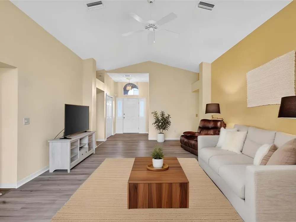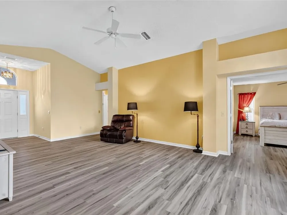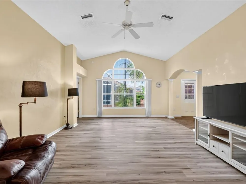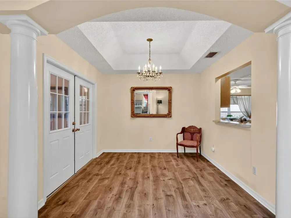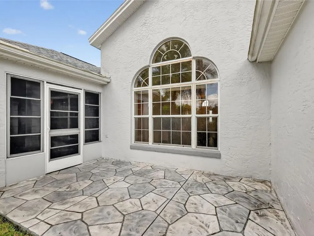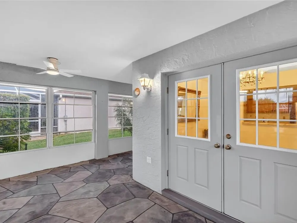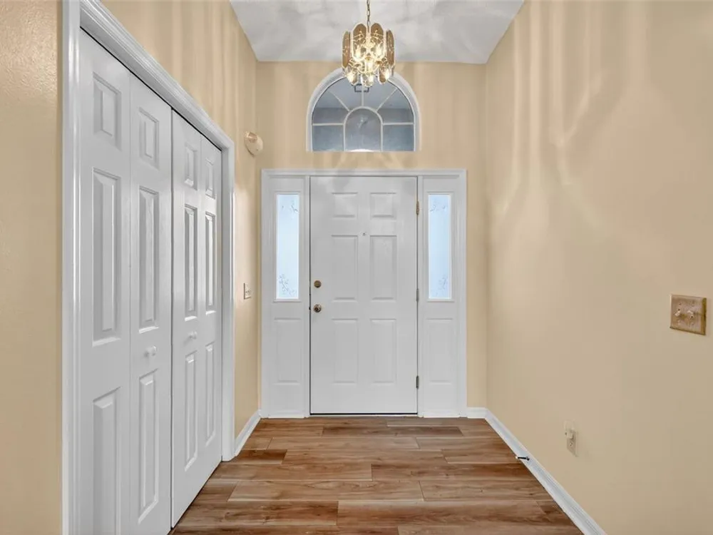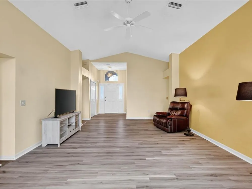One or more photo(s) has been virtually staged. FANTASTIC 3/2 Cancun (Oleander) with ENCLOSED LANAI and REAR PATIO nestled in the highly desirable Village of Santiago! BOND PAID! CUSTOM PAINTED drive and walk ways; LUSH, TROPICAL landscaping; and an ARCHED front entry with DOUBLE side lites and half-round TRANSOM window welcome you in to the well-lit, GENEROUS foyer of this AMAZING home boasting a CONVENIENT ENTRY CLOSET! From the foyer, step into the IMPRESSIVE living room with its soaring VAULTED ceilings and FABULOUS Palladian window that floods the space with NATURAL LIGHT while serving as an architectural focal point. Adding to the beauty of the home is LUXURY VINYL PLANK flooring that can be found THROUGHOUT, offering both elegance and easy maintenance. Just off of the living room, you will find the FORMAL dining room boasting OPULENT columns, TRAY ceiling, pass-thru window to the kitchen, and a GORGEOUS antique crystal chandelier. There are also, DOUBLE French doors that lead to an ENCLOSED LANAI with an adjoining REAR PATIO. Both of theses areas showcase beautifully painted decorative floors and create the IDEAL SPACE for hosting gatherings or simply relaxing with friends and family! Back inside, the inviting kitchen boasts RICH WOOD cabinetry with PULLOUTS, TILED backsplash, STAINLESS appliances, GAS cooking, PANTRY closet, a LARGE CENTER ISLAND, and an adjacent DINETTE for casual dining. Two additional bedrooms and a second bathroom are CONVENIENTLY LOCATED near the front of the home, creating a PRIVATE guest wing and/or QUIET home office. Both bedrooms offer DOUBLE windows and built-in closets. Bathroom two features a STRIKING Bombay vanity, TILED tub and shower combination, and a hallway LINEN closet. The INTERIOR laundry room has additional shelving and leads to the 2-Car Garage with EPOXIED floors, sliding GARAGE SCREEN, attic access with stairs, shelving, extra refrigerator, and PLENTY of room for parking and STORAGE! DON'T MISS YOUR OPPORTUNITY to make this INCREDIBLE HOME in a GREAT LOCATION YOUR OWN! The Village of Santiago is CONVENIENTLY LOCATED between Lake Sumter Landing and Spanish Springs; close to El Santiago and Savannah Recreation Centers; The Scarlett O’Hara Theatre; Glenview Country Club; El Diablo Golf Course; The Villages Polo Club; additional recreation centers, golf, pickle ball, and swimming pools; the Villages Regional Hospital; and CR 446 and US HWY 27/441 with abundant shopping, restaurants, banks, and medical. PLEASE WATCH OUR WALKTHROUGH VIDEO of this WONDERFUL HOME, and CALL TODAY to schedule your Private Showing or Virtual Tour!