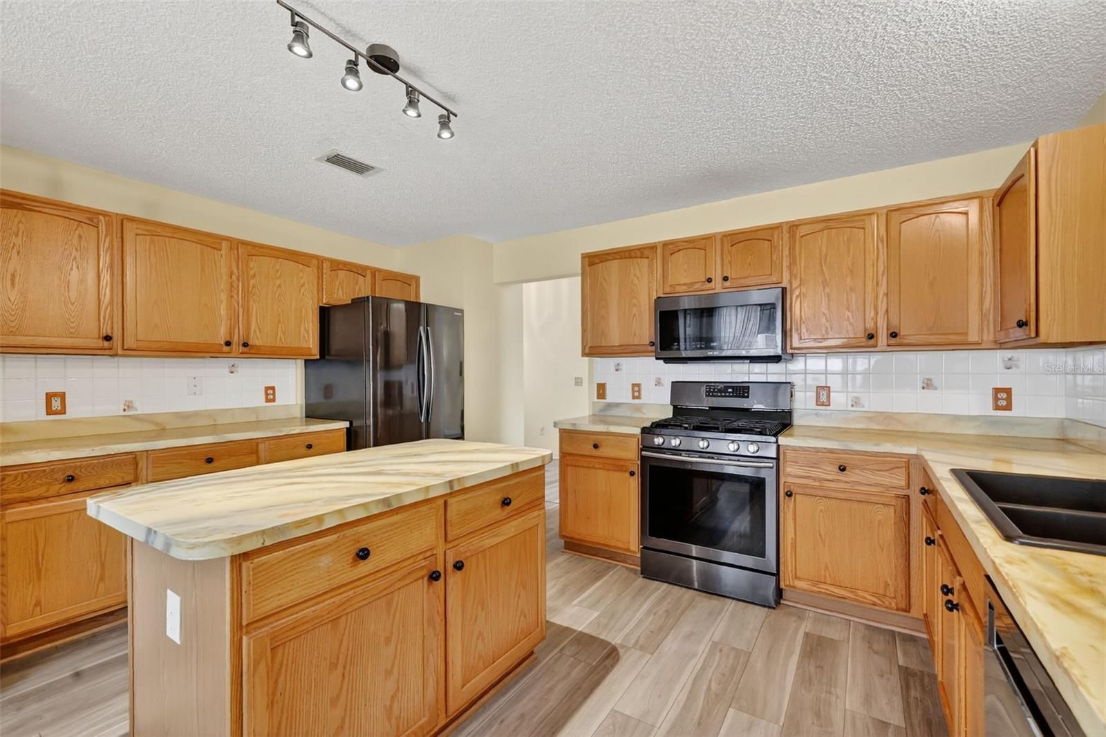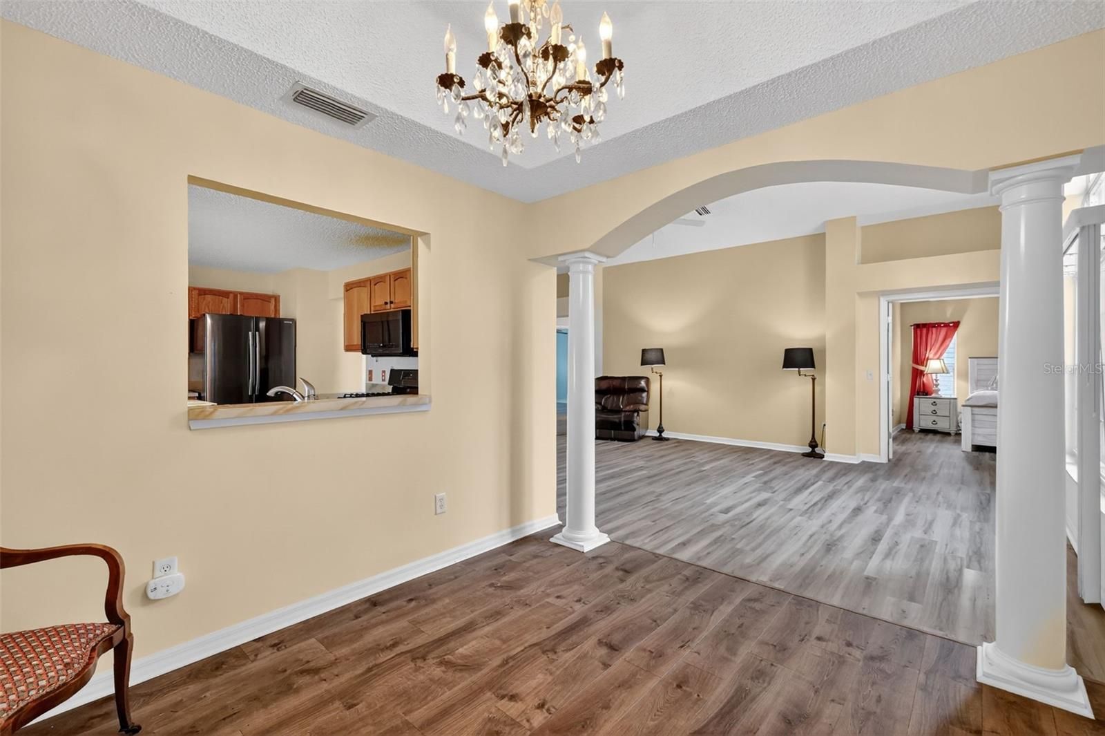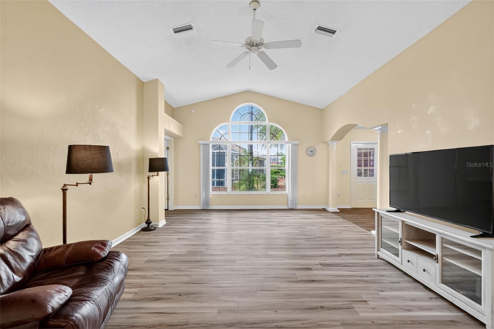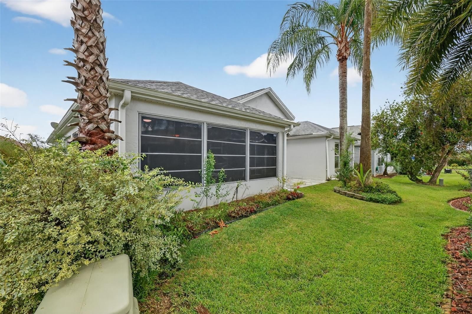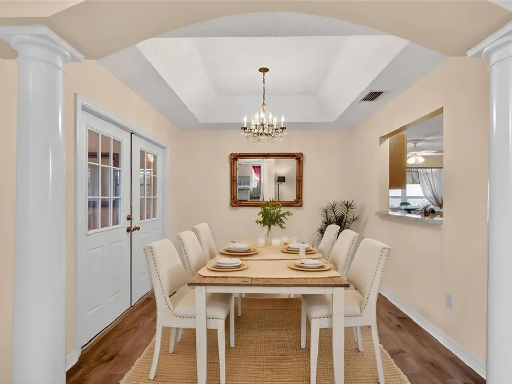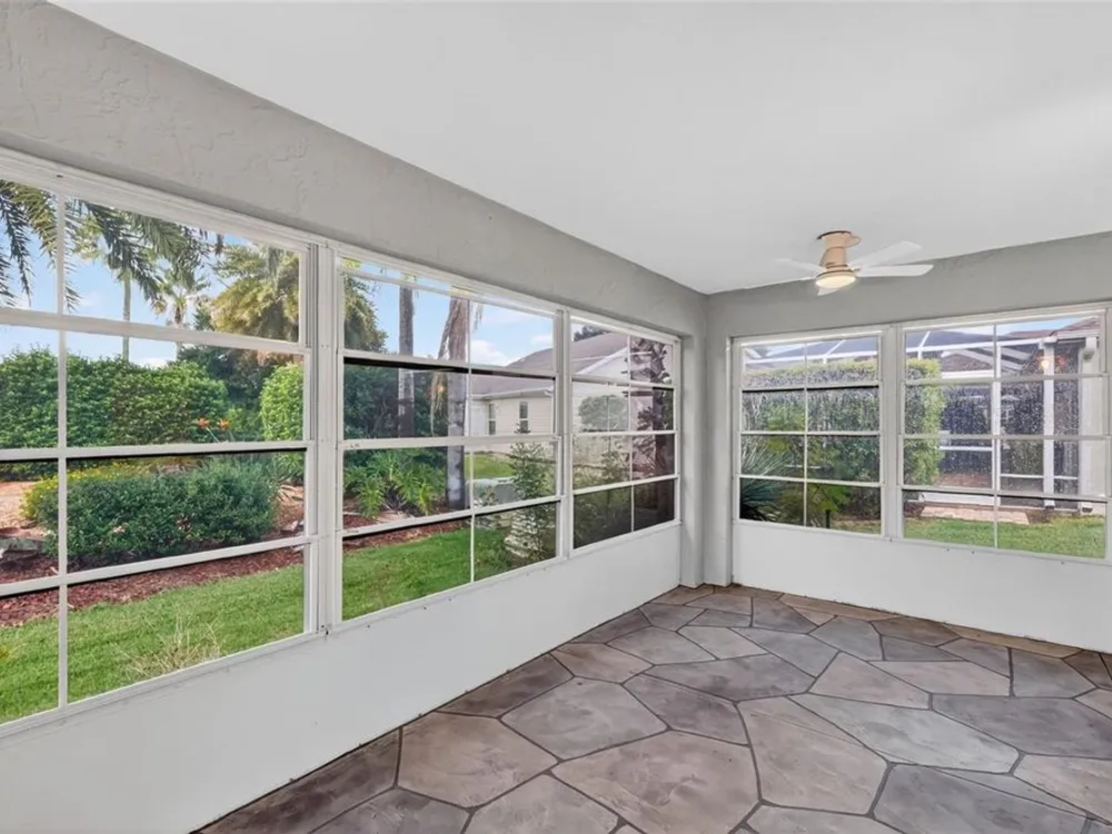 One or more photo(s) has been virtually staged. FANTASTIC 3/2 Cancun (Oleander) with ENCLOSED LANAI and REAR PATIO nestled in the highly desirable Village of Santiago! BOND PAID! CUSTOM PAINTED drive and walk ways; LUSH, TROPICAL landscaping; and an ARCHED front entry with DOUBLE side lites and half-round TRANSOM window welcome you in to the well-lit, GENEROUS foyer of this AMAZING home boasting a CONVENIENT ENTRY CLOSET! From the foyer, step into the IMPRESSIVE living room with its soaring VAULTED ceilings and FABULOUS Palladian window that floods the space with NATURAL LIGHT while serving as an architectural focal point. Adding to the beauty of the home is LUXURY VINYL PLANK flooring that can be found THROUGHOUT, offering both elegance and easy maintenance. Just off of the living room, you will find the FORMAL dining room boasting OPULENT columns, TRAY ceiling, pass-thru window to the kitchen, and a GORGEOUS antique crystal chandelier. There are also, DOUBLE French doors that lead to an ENCLOSED LANAI with an adjoining REAR PATIO. Both of theses areas showcase beautifully painted decorative floors and create the IDEAL SPACE for hosting gatherings or simply relaxing with friends and family! Back inside, the inviting kitchen boasts RICH WOOD cabinetry with PULLOUTS, TILED backsplash, STAINLESS appliances, GAS cooking, PANTRY closet, a LARGE CENTER ISLAND, and an adjacent DINETTE for casual dining. Two additional bedrooms and a second bathroom are CONVENIENTLY LOCATED near the front of the home, creating a PRIVATE guest wing and/or QUIET home office. Both bedrooms offer DOUBLE windows and built-in closets. Bathroom two features a STRIKING Bombay vanity, TILED tub and shower combination, and a hallway LINEN closet. The INTERIOR laundry room has additional shelving and leads to the 2-Car Garage with EPOXIED floors, sliding GARAGE SCREEN, attic access with stairs, shelving, extra refrigerator, and PLENTY of room for parking and STORAGE! DON'T MISS YOUR OPPORTUNITY to make this INCREDIBLE HOME in a GREAT LOCATION YOUR OWN! The Village of Santiago is CONVENIENTLY LOCATED between Lake Sumter Landing and Spanish Springs; close to El Santiago and Savannah Recreation Centers; The Scarlett O’Hara Theatre; Glenview Country Club; El Diablo Golf Course; The Villages Polo Club; additional recreation centers, golf, pickle ball, and swimming pools; the Villages Regional Hospital; and CR 446 and US HWY 27/441 with abundant shopping, restaurants, banks, and medical. PLEASE WATCH OUR WALKTHROUGH VIDEO of this WONDERFUL HOME, and CALL TODAY to schedule your Private Showing or Virtual Tour!