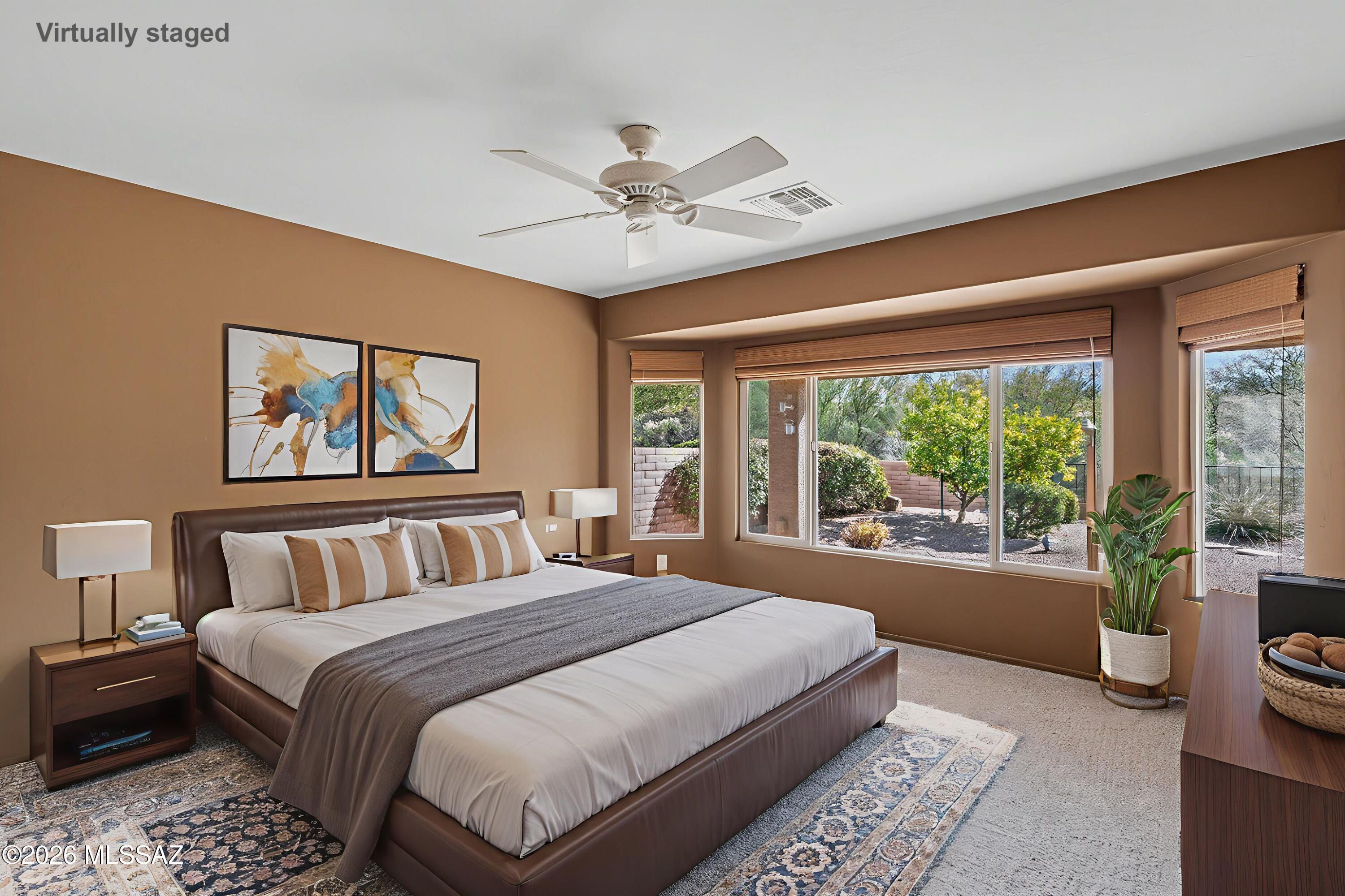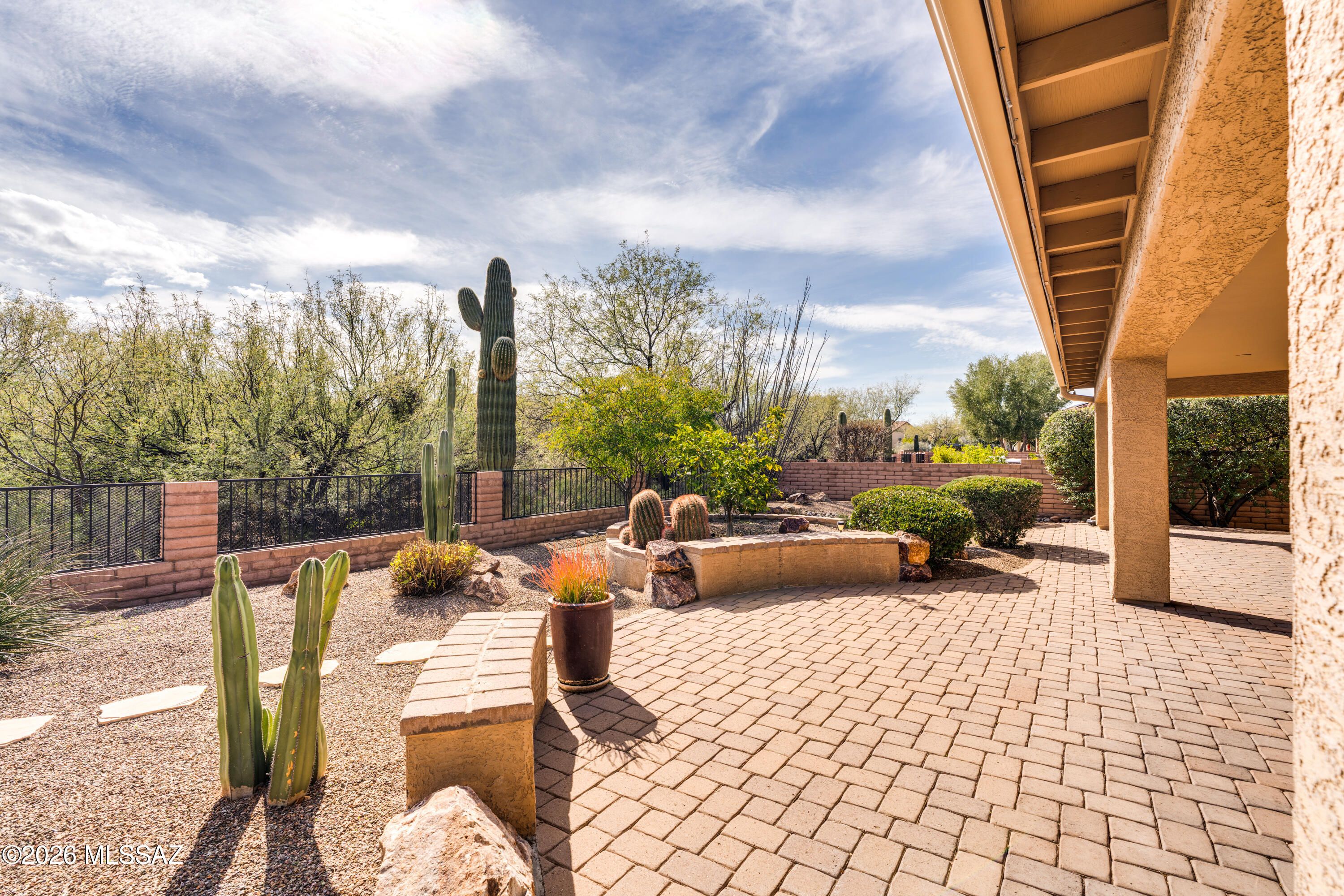 Expanded Laredo model with private casita in the gated, Quail Creek resort community. This thoughtfully designed home offers 2,280 total square feet with 3 BR, 3 BA, plus a spacious den, beautifully situated on a premium homesite backing to a natural arroyo featuring lush desert vegetation, majestic saguaro, and a charming peek-a-boo mountain view. An inviting front courtyard welcomes you in, enhancing both privacy and curb appeal. Inside, the expanded floor plan includes a 2-foot extension to the guest bedroom, guest bath, and den, providing added comfort and flexibility. Natural light fills the home through five solar tubes, and charming bay windows in both the primary suite and guest bedroom add character and additional sitting space. The owner's suite features a dual vanity bath with