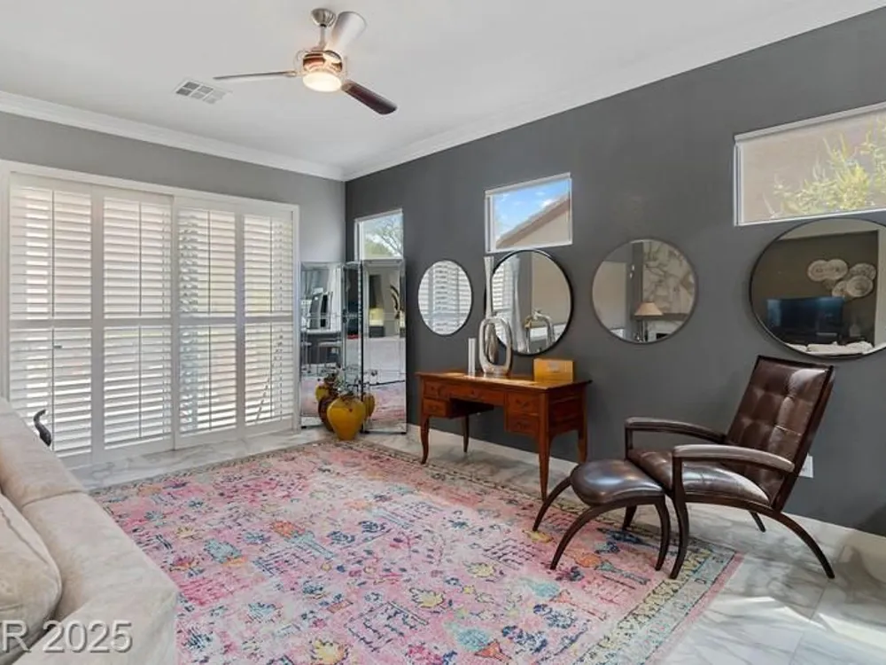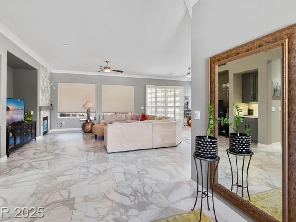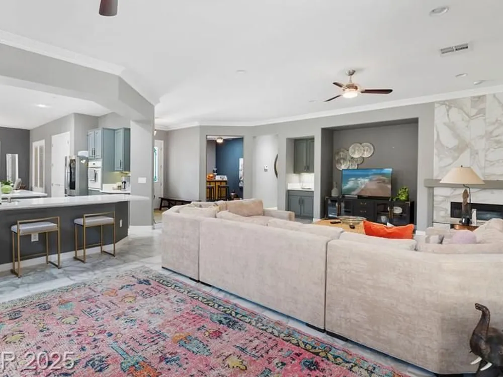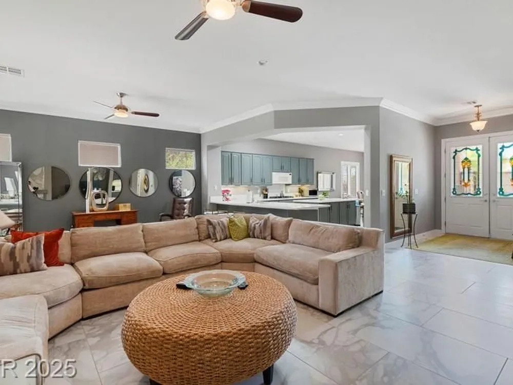 Designed for both luxury and comfort, Saratoga Model that features two separate suites, a private office, and open layout that showcases views from every angle. The chef's kitchen boasts quartz countertops, large center island, stainless appliances, refinished cabinetry, oversized pantry, and breakfast bar. Additional highlights include custom glass entry doors, upgraded flooring, crown molding LED lighting, wet bar, and elegant fixtures throughout. The fully fenced, low- maintenance yard is perfect for relaxing or entertaining with covered patio, Located in a top-rated 55+ community w/ multiple clubhouses, championship golf course, and vibrant social amenities. THIS IS An ASSUMABLE LOAN!