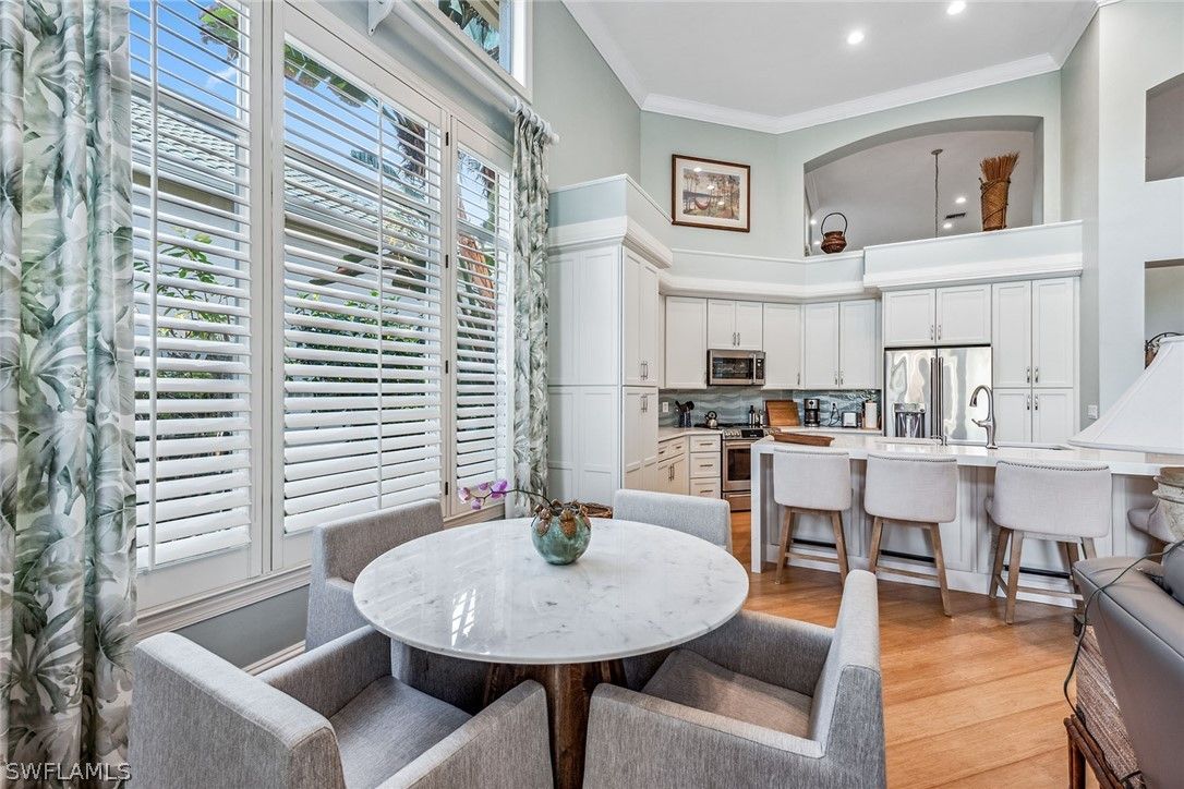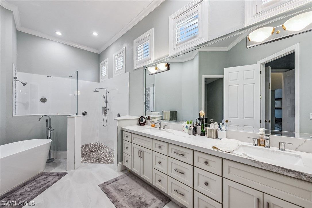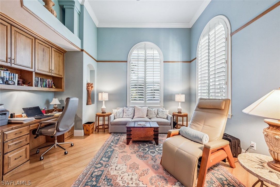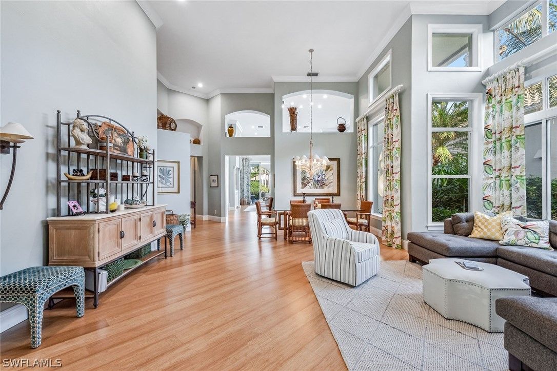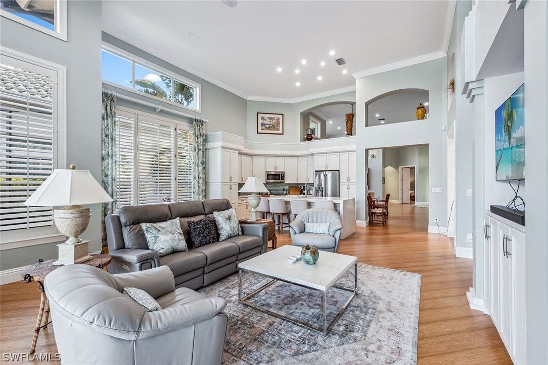 Enjoy the good life with an ease that is impossible to duplicate in this magnificent Creekside III plan, providing 3,158 square feet of luxury. This home offers three bedrooms, an office/den, a living room, a family room and four full baths, including a pool bath accessible from the primary suite and a NEW ROOF under contract, completion by April 7th, 2026. Refined from top to bottom and fully renovated with the finest finishes including hardwood bamboo flooring, lush carpets, marble stone tops and new cabinets in the kitchen, bringing convenience to a new level of elegance. Walk-in closets, vaulted ceilings and transom glass windows fill the home with natural light, while sliders lead to a revamped outdoor living space featuring a new pool, hot tub, vaulted screen enclosure and contemporary stone flooring. Additionally, it is offered fully furnished and redesigned in 2022. Just bring your corkscrew and your slippers, this dream home is yours.
