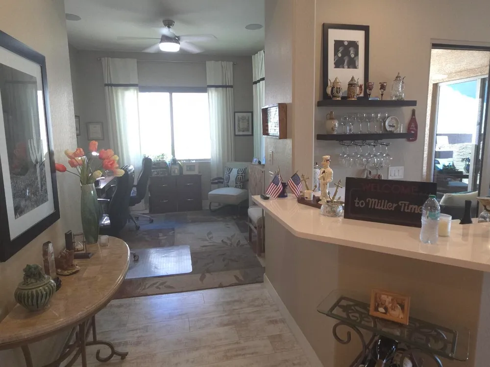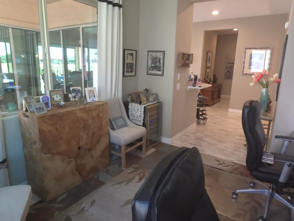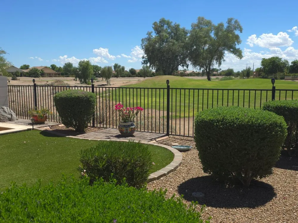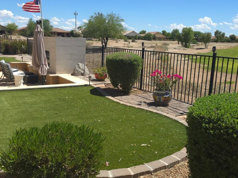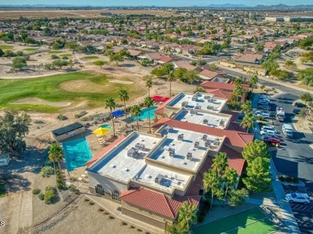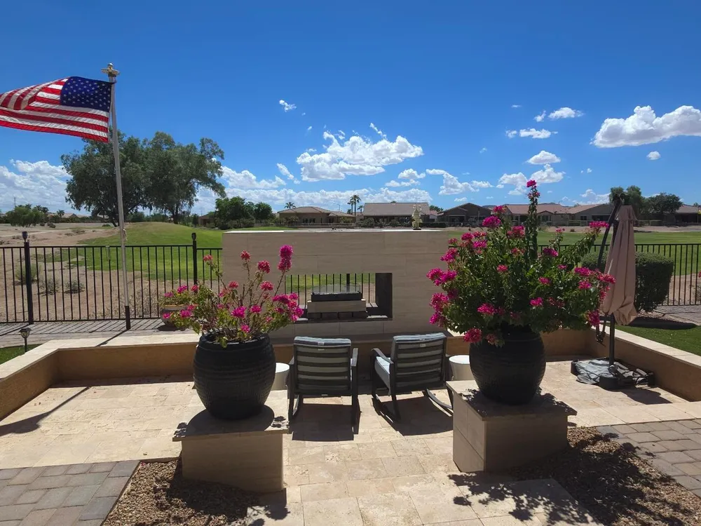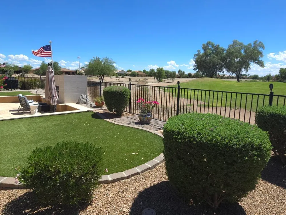 Introducing a distinctive former model home presenting a unique opportunity within Casa Grande's sought-after Mission Royale 55+ golf community. This home features numerous upgrades and thoughtful design elements that set it apart from many others in the neighborhood. Inside, you'll find 2 bedrooms, a den and 2.5 bathrooms designed with accessibility in mind, including ADA-compliant features such as raised toilets and walk-in showers with benches. The chef's kitchen includes stainless steel appliances, a large island and pull-out cabinets throughout. Adjacent to the chef's kitchen, the elegant wet bar is thoughtfully positioned off to the side of the great room, offering a stylish and functional space for entertaining. Indoor and outdoor living spaces connect seamlessly with 3 covered patios trimmed in travertine, including 2 with motorized retractable sunscreens. The backyard is landscaped with artificial turf and captures views overlooking the green of the Par 3 - 6th hole on the Mission Royale Golf Course. Additional features like a sunken conversation pit, double-sided fireplace, and multiple fire features contribute to a relaxing ambiance. This Meritage-built home combines elegant design and upgraded features for comfortable, upscale living. It presents an attractive option for those seeking a blend of golf course lifestyle, high-end finishes, and community amenities.