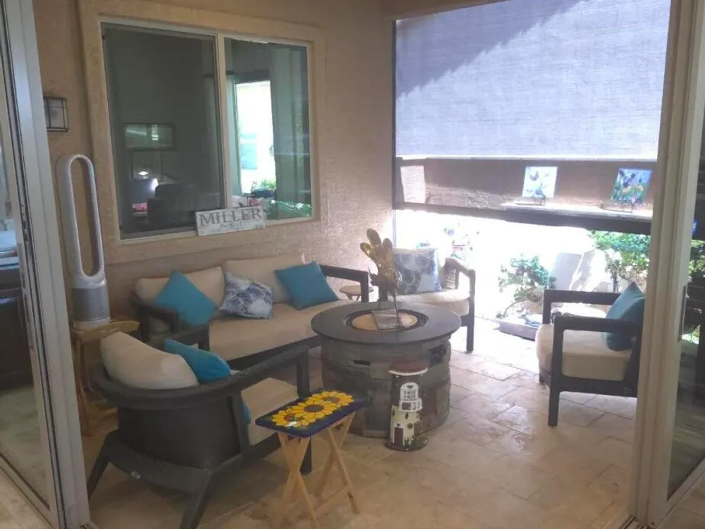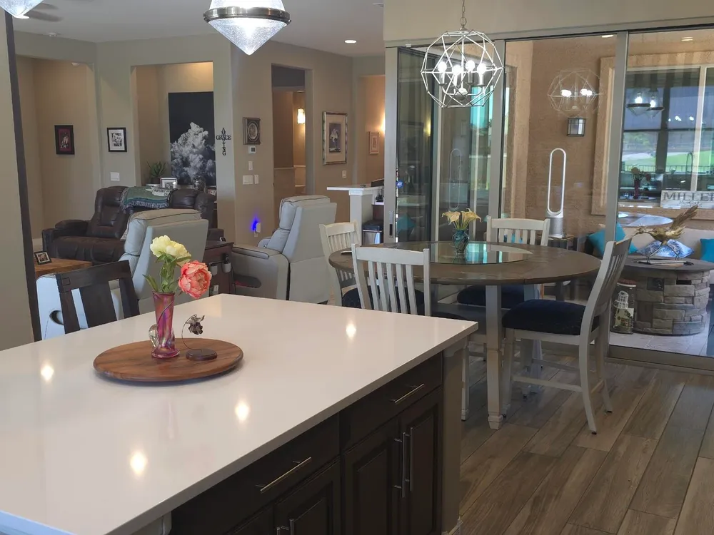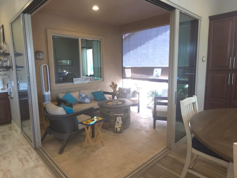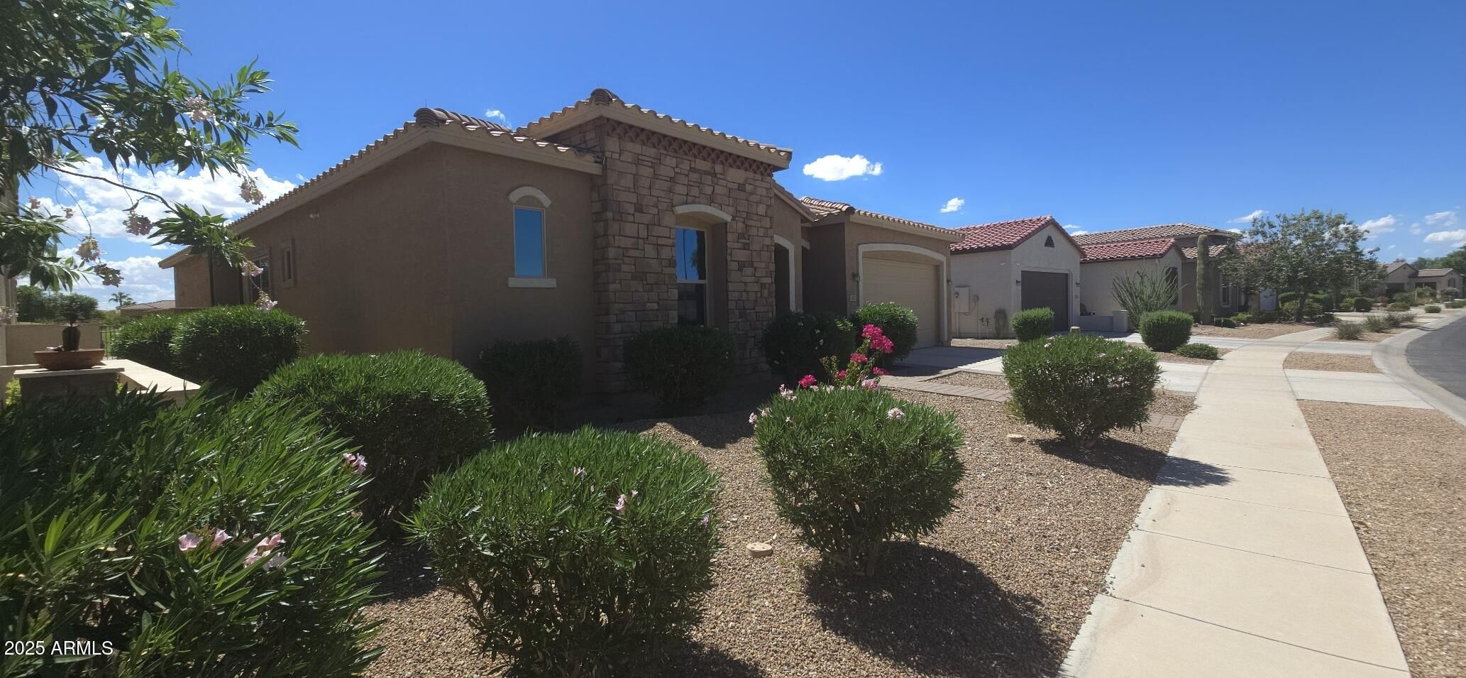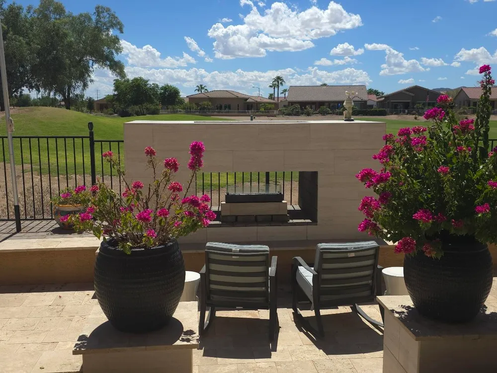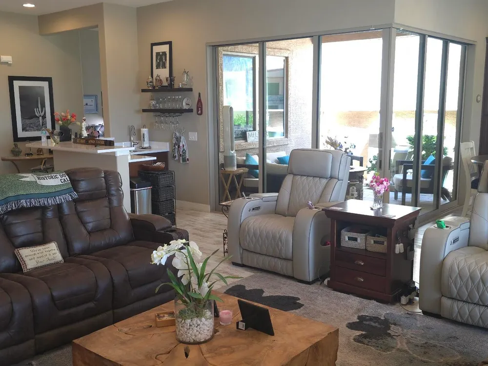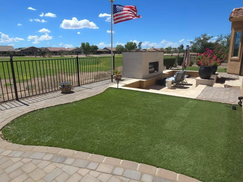 Introducing a distinctive former model home presenting a unique opportunity within Casa Grande's sought-after Mission Royale 55+ golf community. This home features numerous upgrades and thoughtful design elements that set it apart from many others in the neighborhood. Inside, you'll find 2 bedrooms, a den and 2.5 bathrooms designed with accessibility in mind, including ADA-compliant features such as raised toilets and walk-in showers with benches. The chef's kitchen includes stainless steel appliances, a large island and pull-out cabinets throughout. Adjacent to the chef's kitchen, the elegant wet bar is thoughtfully positioned off to the side of the great room, offering a stylish and functional space for entertaining. Indoor and outdoor living spaces connect seamlessly with 3 covered patios trimmed in travertine, including 2 with motorized retractable sunscreens. The backyard is landscaped with artificial turf and captures views overlooking the green of the Par 3 - 6th hole on the Mission Royale Golf Course. Additional features like a sunken conversation pit, double-sided fireplace, and multiple fire features contribute to a relaxing ambiance. This Meritage-built home combines elegant design and upgraded features for comfortable, upscale living. It presents an attractive option for those seeking a blend of golf course lifestyle, high-end finishes, and community amenities.