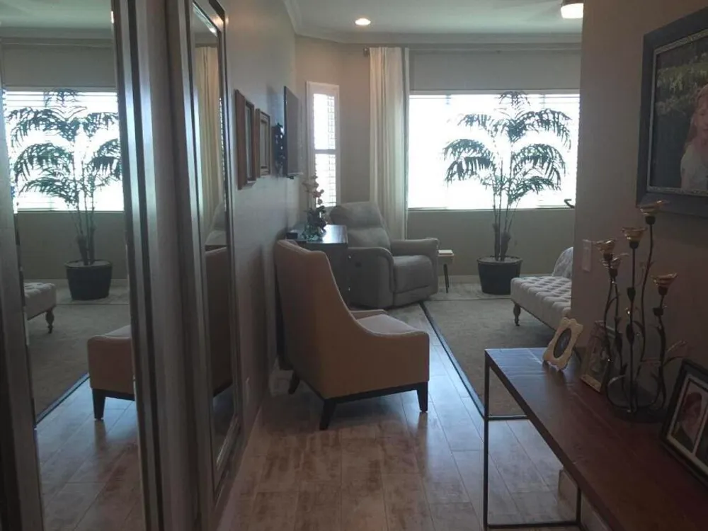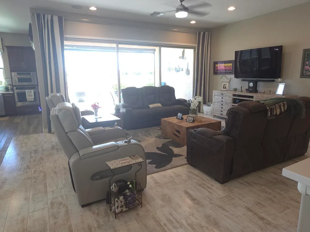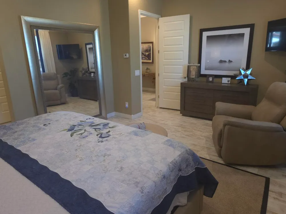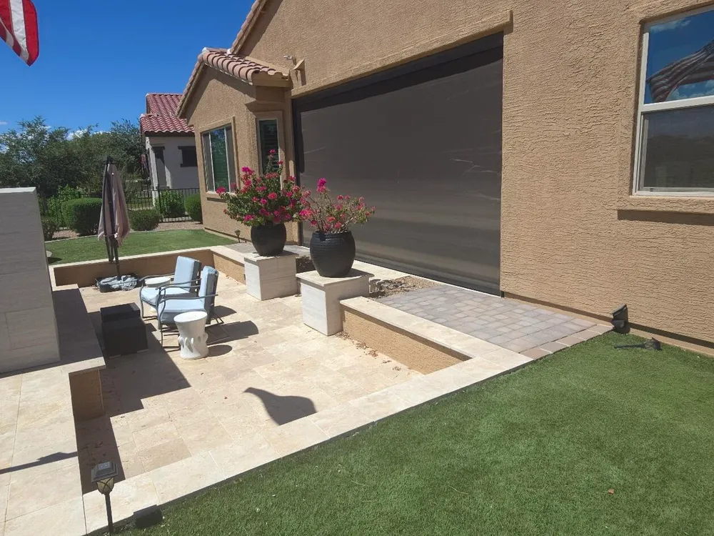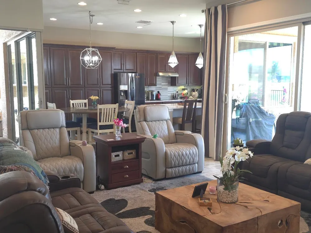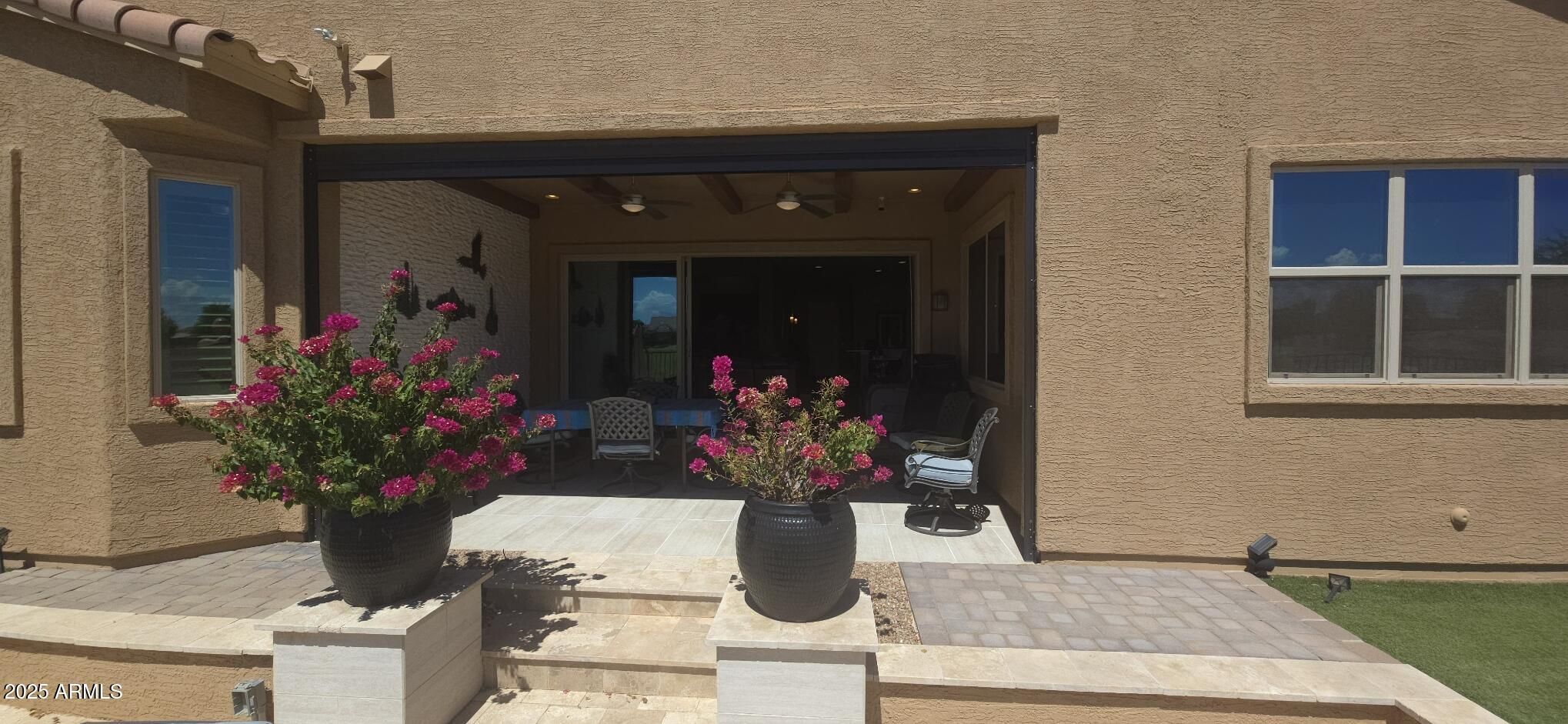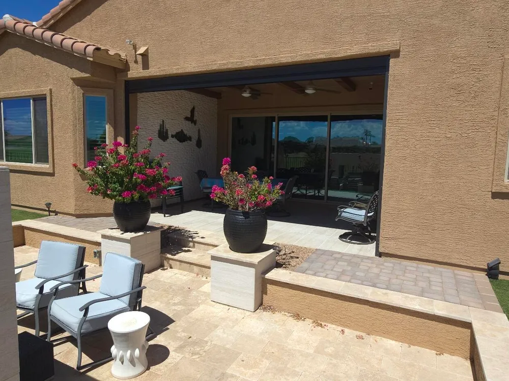 Introducing a distinctive former model home presenting a unique opportunity within Casa Grande's sought-after Mission Royale 55+ golf community. This home features numerous upgrades and thoughtful design elements that set it apart from many others in the neighborhood. Inside, you'll find 2 bedrooms, a den and 2.5 bathrooms designed with accessibility in mind, including ADA-compliant features such as raised toilets and walk-in showers with benches. The chef's kitchen includes stainless steel appliances, a large island and pull-out cabinets throughout. Adjacent to the chef's kitchen, the elegant wet bar is thoughtfully positioned off to the side of the great room, offering a stylish and functional space for entertaining. Indoor and outdoor living spaces connect seamlessly with 3 covered patios trimmed in travertine, including 2 with motorized retractable sunscreens. The backyard is landscaped with artificial turf and captures views overlooking the green of the Par 3 - 6th hole on the Mission Royale Golf Course. Additional features like a sunken conversation pit, double-sided fireplace, and multiple fire features contribute to a relaxing ambiance. This Meritage-built home combines elegant design and upgraded features for comfortable, upscale living. It presents an attractive option for those seeking a blend of golf course lifestyle, high-end finishes, and community amenities.