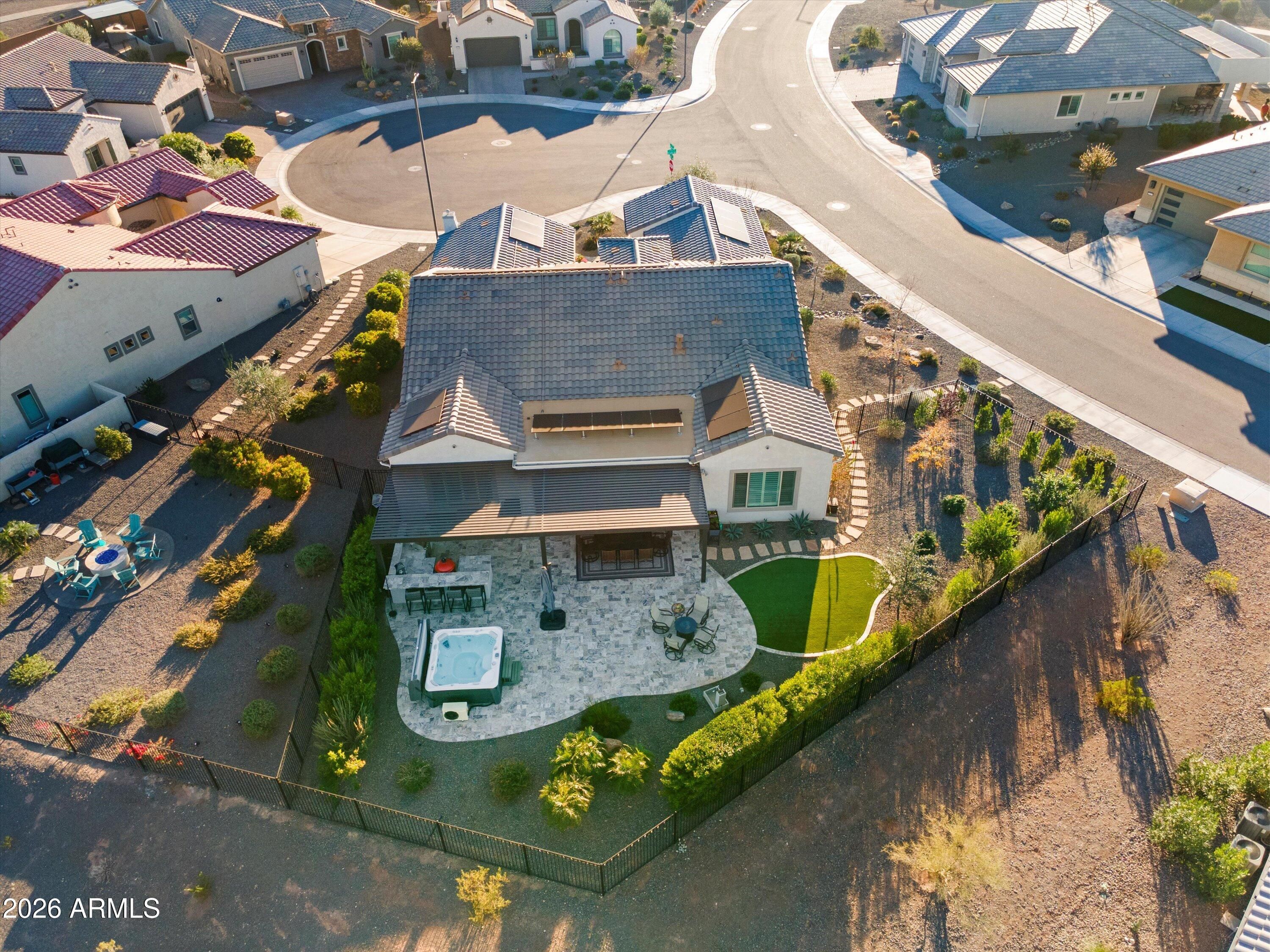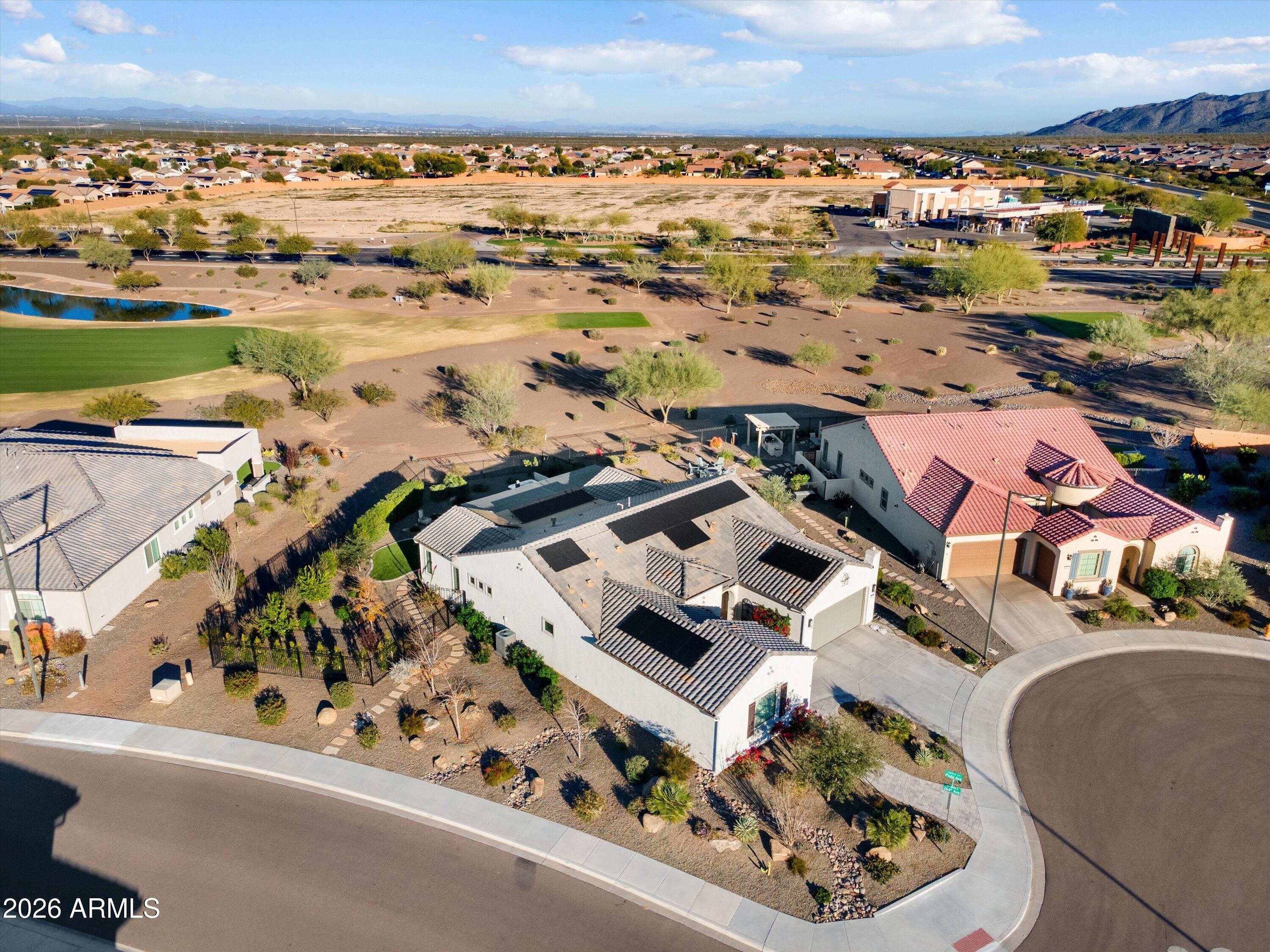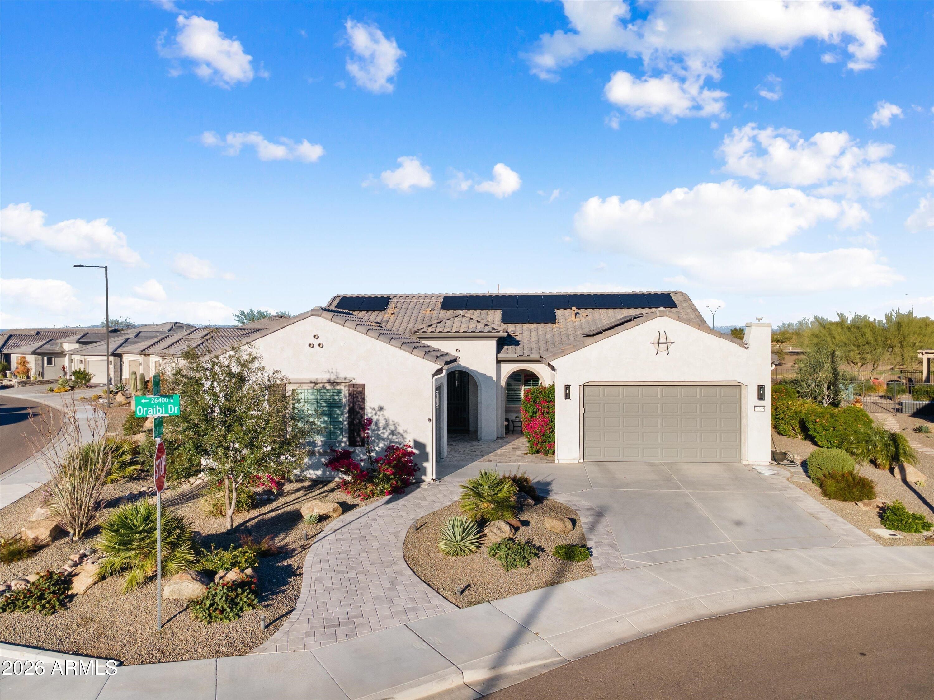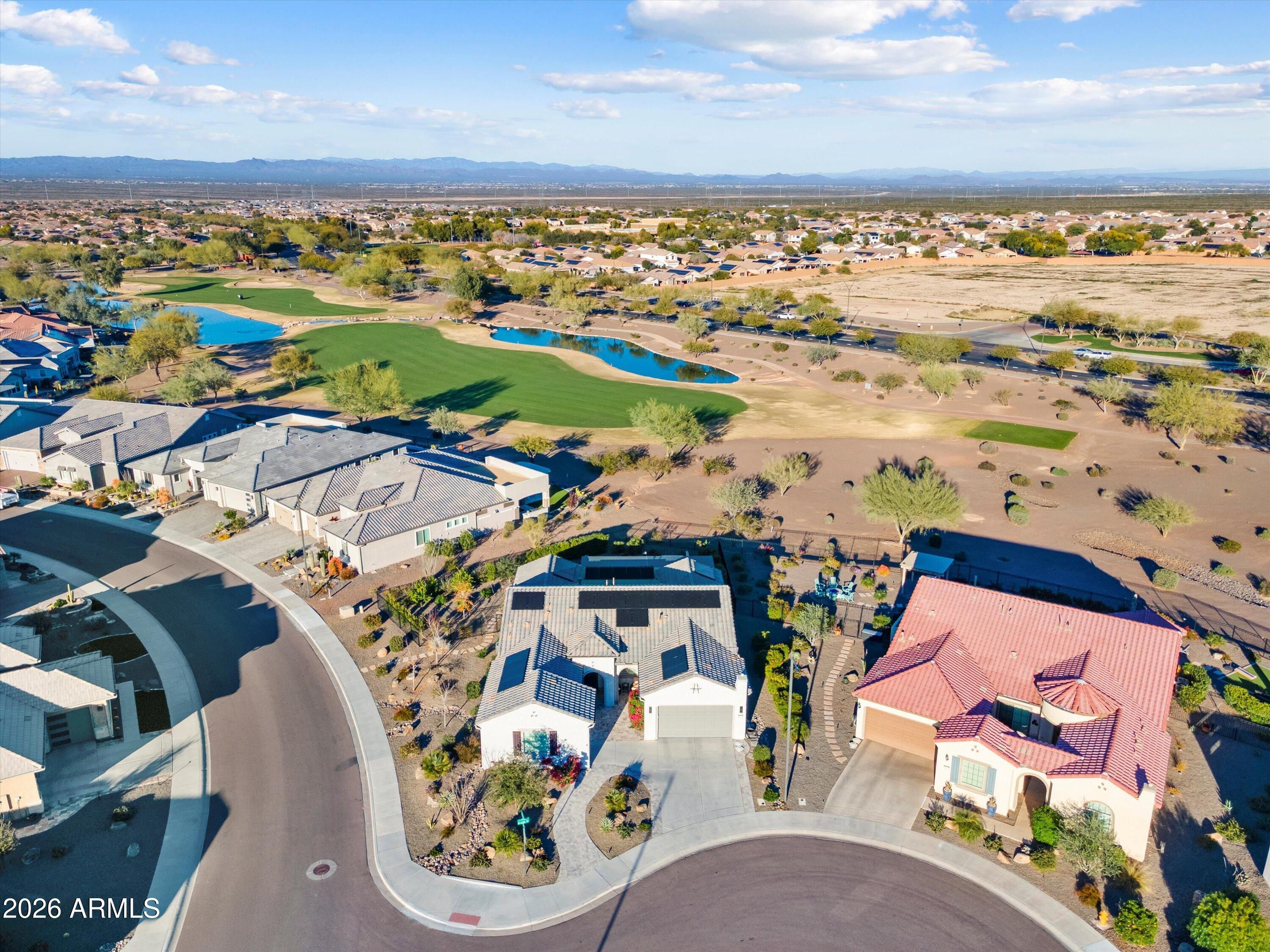 MUST SEE Endeavor model, located in the vibrant active adult community of Sun City Festival. This popular floor plan has a lot to offer. Let's start with a golf course homesite on a five-home cul-de-sac, an above ground spa with mountain views, dual owner's suites, a 3-car garage, and an owned solar system that delivered a 2025 electric bill of just $114.00! Upgraded coconut-colored cabinets with rollout trays and soft close doors and drawers are complemented with an Executive Kitchen Island with gray cabinets, more storage, and granite counters. The stainless-steel KitchenAid appliances shine against the white tile backsplash and include a gas cooktop and built-in oven and microwave. The Bulter's Pantry includes even more storage and a wine cabinet. The entire home features engineered wood floors and white plantation shutters, while the great room includes a built-in entertainment wall with gas fireplace. The spacious den includes double panel doors. Both owner's suites include walk-in closets, tiled showers, and granite dual vanities. Custom ceiling fans and upgraded lighting and pendants round out the interior upgrades. The backyard is oversized with travertine pavers, Pergola, built-in BBQ and smoker, and synthetic turf. The garages are insulated and feature epoxy-coated floors with overhead storage with a soft water system.