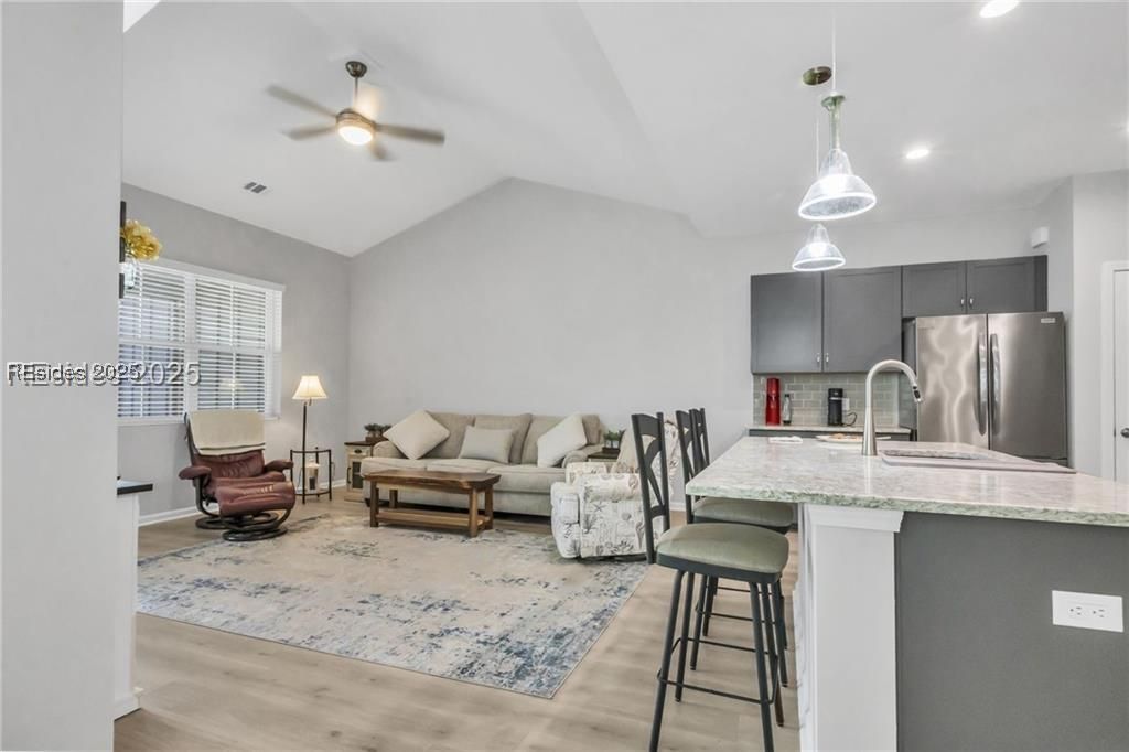 MOTIVATED SELLER!! Live maintenance-free in this exquisite, nearly new (2023) 2 bedroom/2 bath cottage within the desirable Latitude Margaritaville Hilton Head community! With 1321 sq ft of thoughtfully designed living space, this residence combines stylish finishes and modern comforts. Living, Dining, and Kitchen areas flow seamlessly, highlighted by cathedral ceilings and abundant natural light. Kitchen upgrades include a classic subway tile backsplash, soft close cabinets, double ovens, stainless appliances, and quartz countertops. Relax or entertain on the screened-in porch complete with epoxy flooring for durability and ease of maintenance. A two car garage can be used to park vehicles and as extra storage. Perfect for full time residency, a second home, or investment property. Take a quick golf cart ride to the resort-style amenities of Latitude Margaritaville -pools, fitness center, pickleball, tennis, and more! Golf cart is included in the sale of the home and most furniture is negotiable.