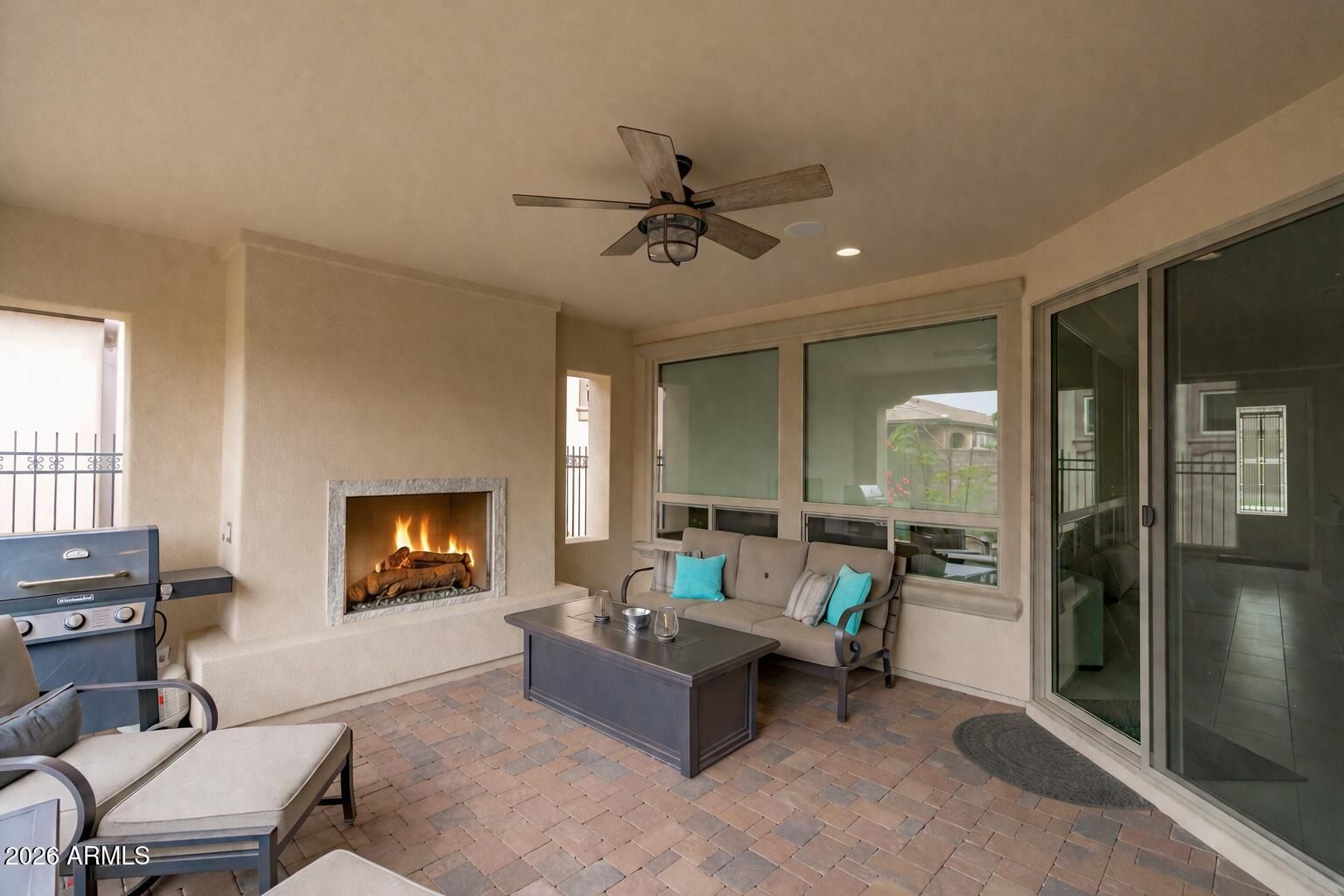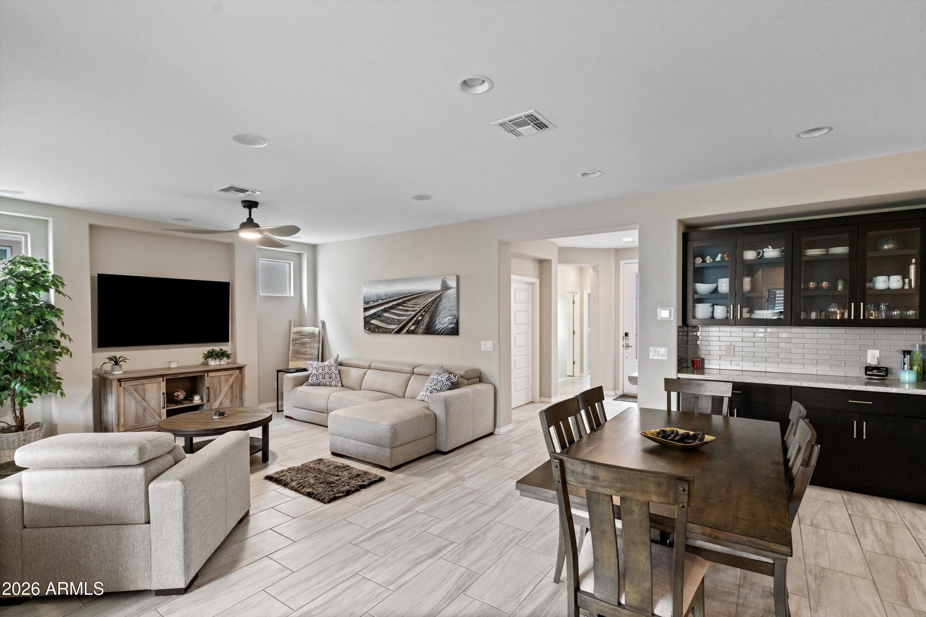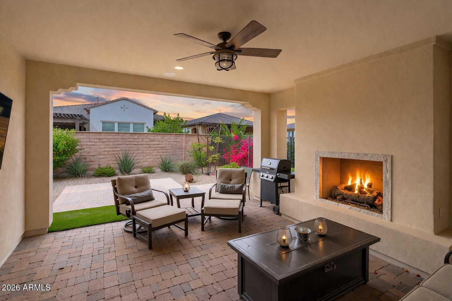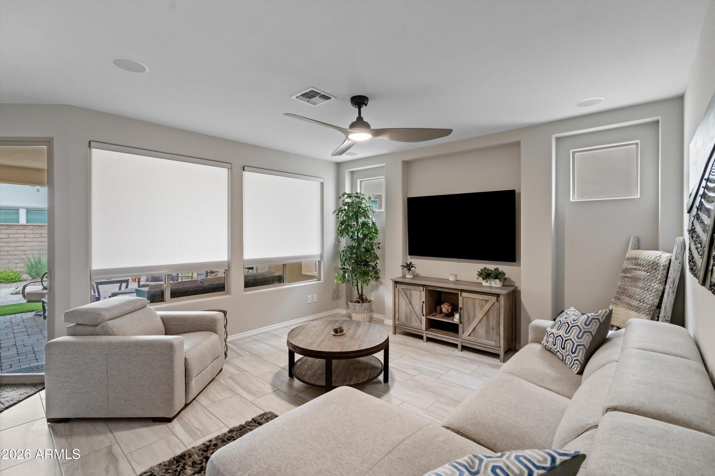 Located within the highly sought-after Encanterra resort community in Queen Creek, this beautifully designed Cannes floorplan offers the perfect blend of thoughtful design, flexible living space, and resort-style living. The home features 2 bedrooms, 2 bathrooms, and a private den with doors, ideal for a home office, hobby room, reading retreat, or additional guest space. The open great room layout creates a seamless flow between the kitchen, dining, and living areas, making the home feel spacious and inviting while still comfortable for everyday living and entertaining. The kitchen offers ample cabinetry, generous counter space, and an island that overlooks the main living area, creating the perfect gathering space for guests and family. The primary suite is privately situated and includes a spacious bedroom, walk-in closet, and ensuite bath designed for comfort and convenience. A secondary bedroom and full bath provide excellent accommodations for guests. One of the standout features of the home is the Smart Space laundry room, complete with built-in cabinetry and additional workspace that can easily function as a craft room, organization center, secondary office area, or additional storage space. Step outside to the large covered patio featuring an outdoor fireplace, creating a perfect setting to relax or entertain while enjoying Arizona's beautiful evenings. The home also benefits from desirable north/south exposure, providing balanced natural light throughout the day. Additional highlights include a 4-foot extended 2-car garage, offering extra space for storage, a golf cart, workshop area, or hobby space. Residents of Encanterra enjoy access to an impressive array of amenities including a championship golf course, resort-style pools and spas, state-of-the-art fitness facilities, tennis and pickleball courts, multiple dining venues, spa services, walking paths, and an active social calendar with clubs, events, and community gatherings. This home offers the opportunity to enjoy a beautifully designed residence while experiencing one of the most vibrant resort lifestyles in the Southeast Valley.