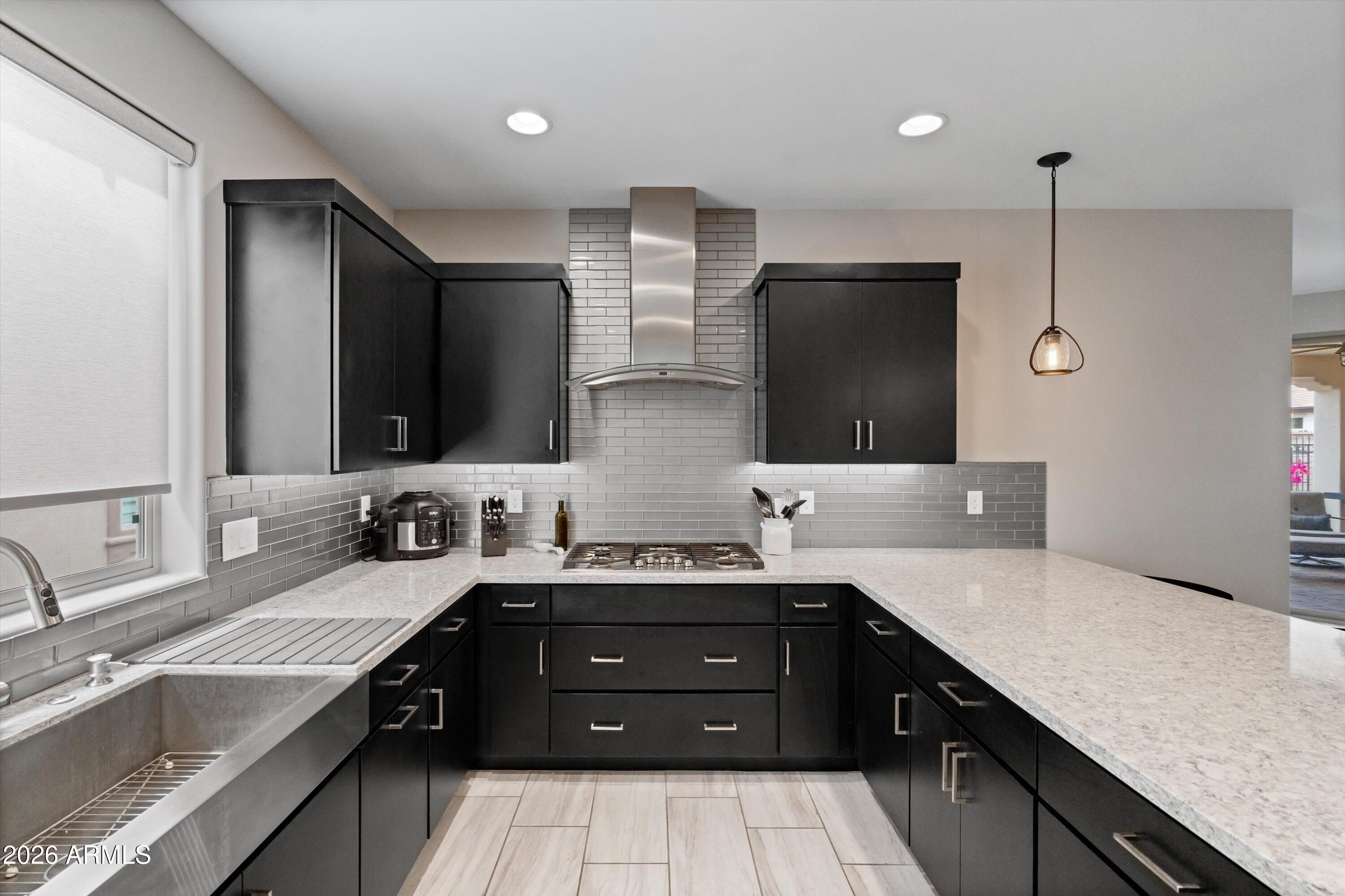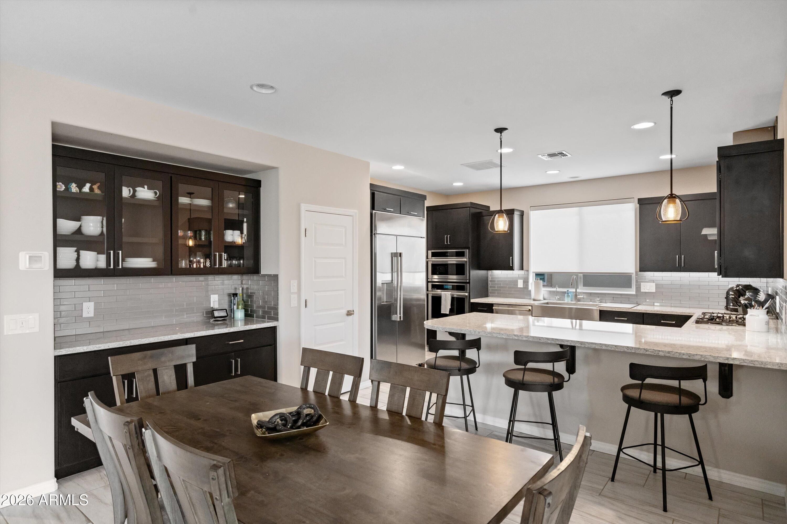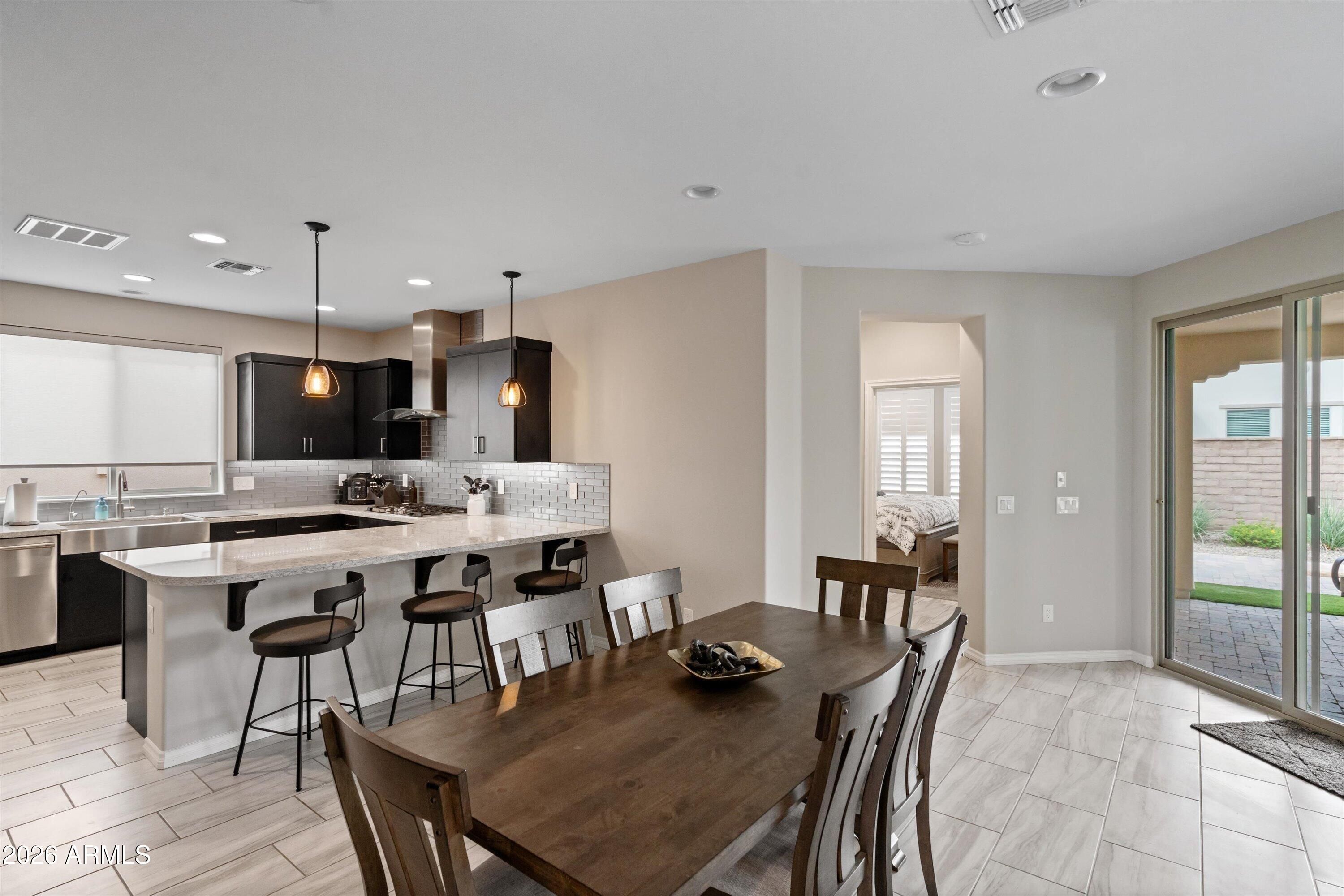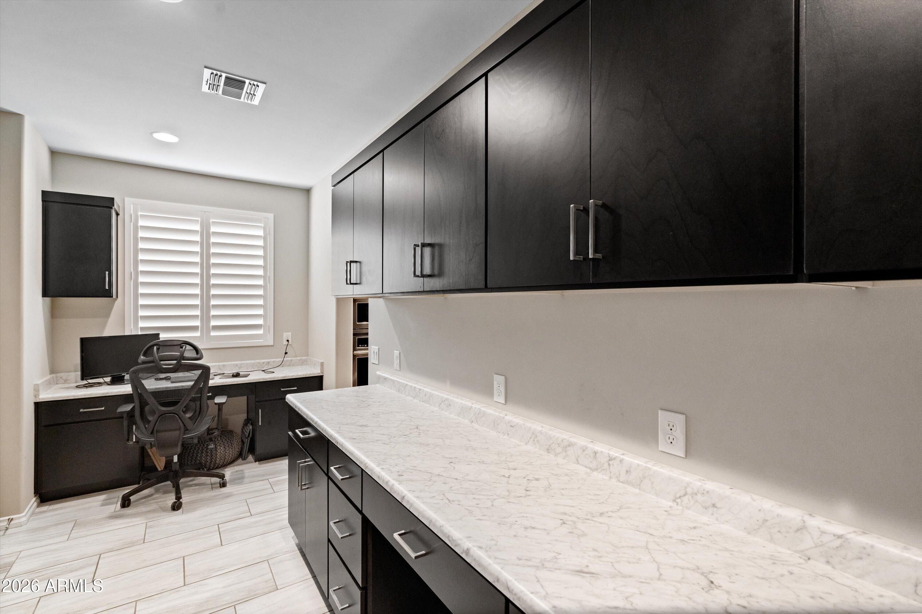 Located within the highly sought-after Encanterra resort community in Queen Creek, this beautifully designed Cannes floorplan offers the perfect blend of thoughtful design, flexible living space, and resort-style living. The home features 2 bedrooms, 2 bathrooms, and a private den with doors, ideal for a home office, hobby room, reading retreat, or additional guest space. The open great room layout creates a seamless flow between the kitchen, dining, and living areas, making the home feel spacious and inviting while still comfortable for everyday living and entertaining. The kitchen offers ample cabinetry, generous counter space, and an island that overlooks the main living area, creating the perfect gathering space for guests and family. The primary suite is privately situated and includes a spacious bedroom, walk-in closet, and ensuite bath designed for comfort and convenience. A secondary bedroom and full bath provide excellent accommodations for guests. One of the standout features of the home is the Smart Space laundry room, complete with built-in cabinetry and additional workspace that can easily function as a craft room, organization center, secondary office area, or additional storage space. Step outside to the large covered patio featuring an outdoor fireplace, creating a perfect setting to relax or entertain while enjoying Arizona's beautiful evenings. The home also benefits from desirable north/south exposure, providing balanced natural light throughout the day. Additional highlights include a 4-foot extended 2-car garage, offering extra space for storage, a golf cart, workshop area, or hobby space. Residents of Encanterra enjoy access to an impressive array of amenities including a championship golf course, resort-style pools and spas, state-of-the-art fitness facilities, tennis and pickleball courts, multiple dining venues, spa services, walking paths, and an active social calendar with clubs, events, and community gatherings. This home offers the opportunity to enjoy a beautifully designed residence while experiencing one of the most vibrant resort lifestyles in the Southeast Valley.