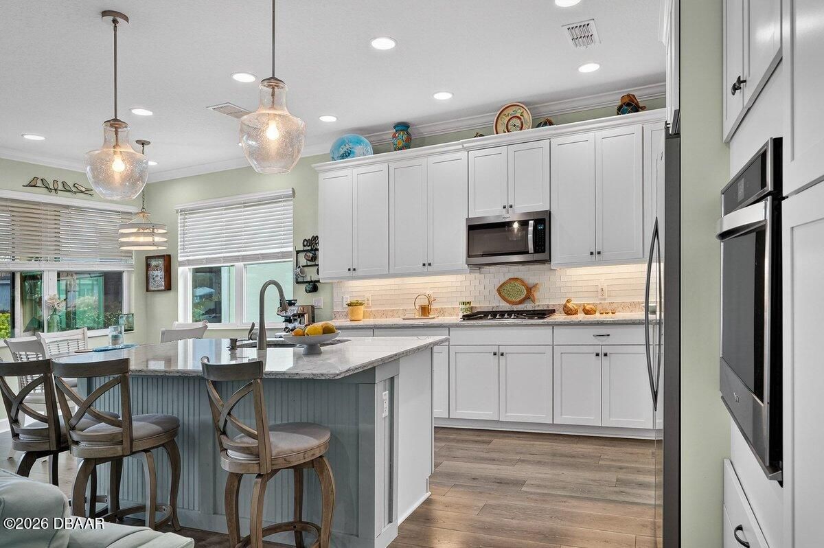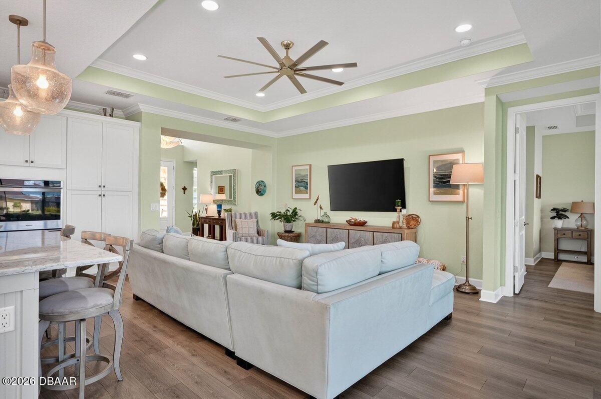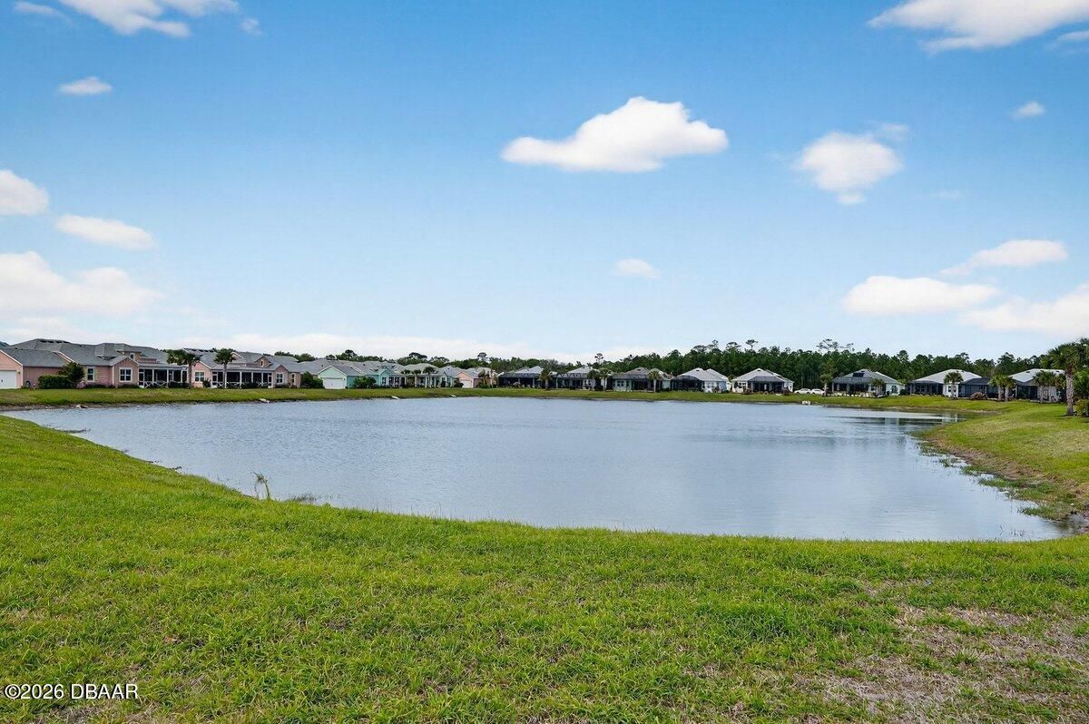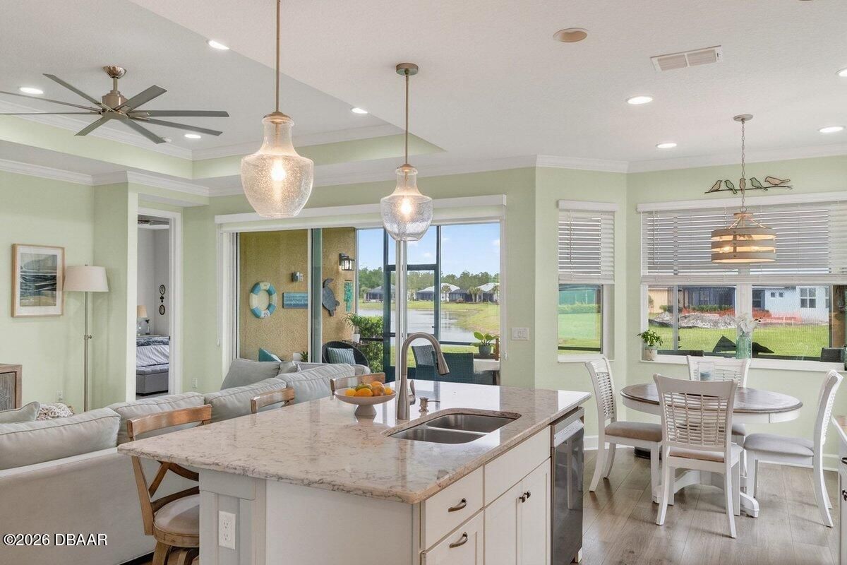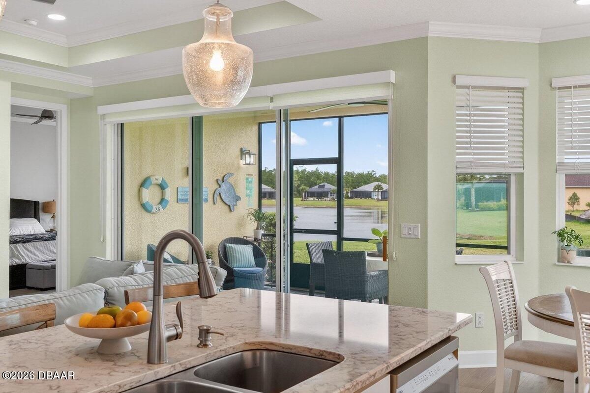 Beautifully upgraded Parrot floor plan with 2 beds, 2 baths, an enclosed den (easily converted to a bedroom), and a flex space, offering pond views from every rear window. Features include: 8-ft doors, premium Mohawk laminate flooring, crown molding in living areas and primary suite, and upgraded lighting. Kitchen features: gas cooktop, wall oven, 42'' cabinets with crown molding, soft-close doors and drawers, pullouts, glass backsplash, stainless-steel appliances, and granite countertops. Primary suite: bay window with water views, two walk-in closets, makeup vanity, linen closet, an oversized walk-in shower with tile to the ceiling and quartz countertops. Outdoor living: 3-panel sliding glass doors lead to the screened lanai with pull-down shades, sealed pavers, gas line for a grill or fire pit, plus additional backyard space. More features: retractable front door screen, utility sink, and garage storage. Resort-style living with a private beach club and shuttle, plus so much more!