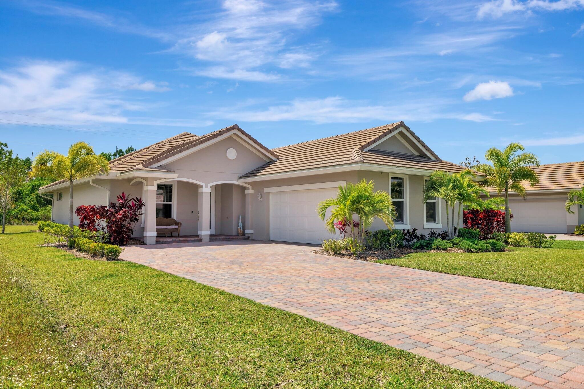 Built in 2022, this ranch style home offers an open-concept layout with high ceilings and tile throughout. The upgraded kitchen boasts a large island, white cabinetry, granite counter tops and stainless-steel appliances. The primary suite features a luxurious roman shower and dual sinks. The home backs up to a wooded area for additional privacy. The large side-entry garage accommodates 2 vehicles, a golf cart, and storage. As a resident, you will have access to an 18-hole championship golf course, tennis courts, vibrant dining and social activities. Membership is not mandatory. The low HOA covers water, sewer, cable, high-speed internet, community security, and common area maintenance. Meadowood Golf and Tennis Club, the Treasure Coasts hidden gem for Florida living!