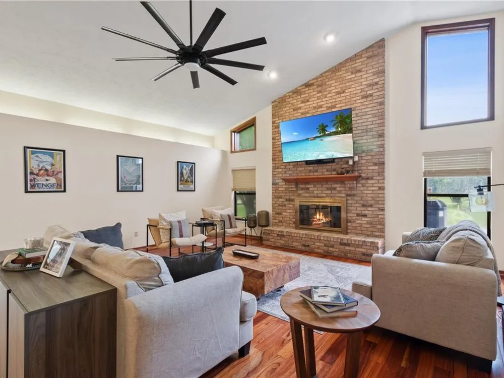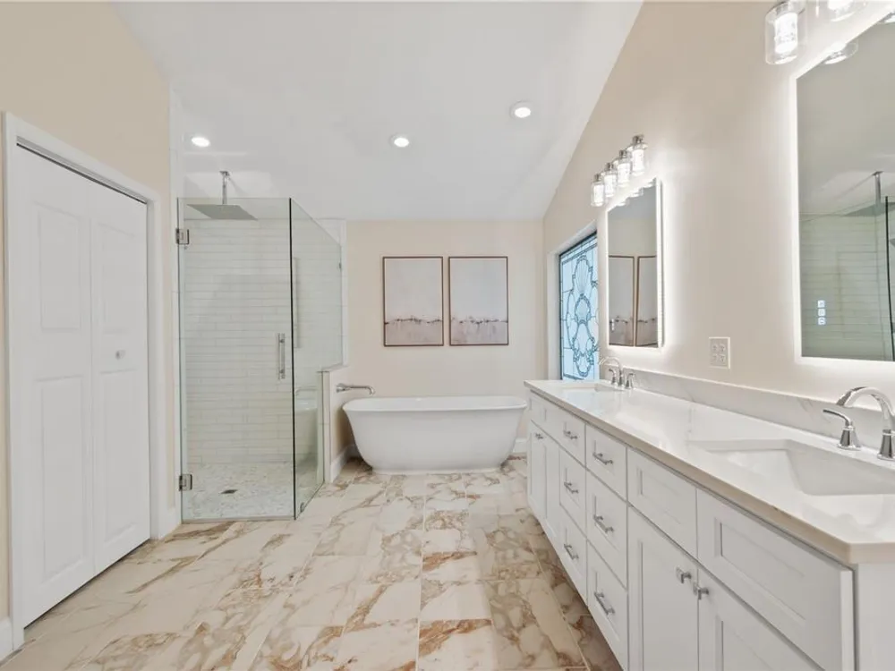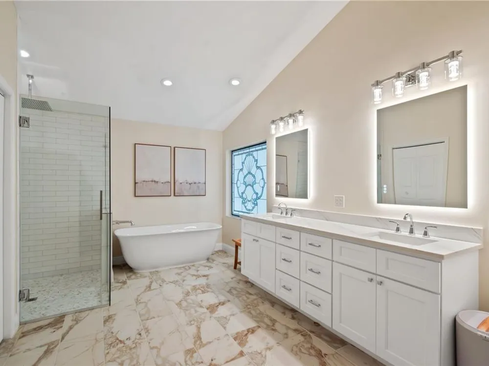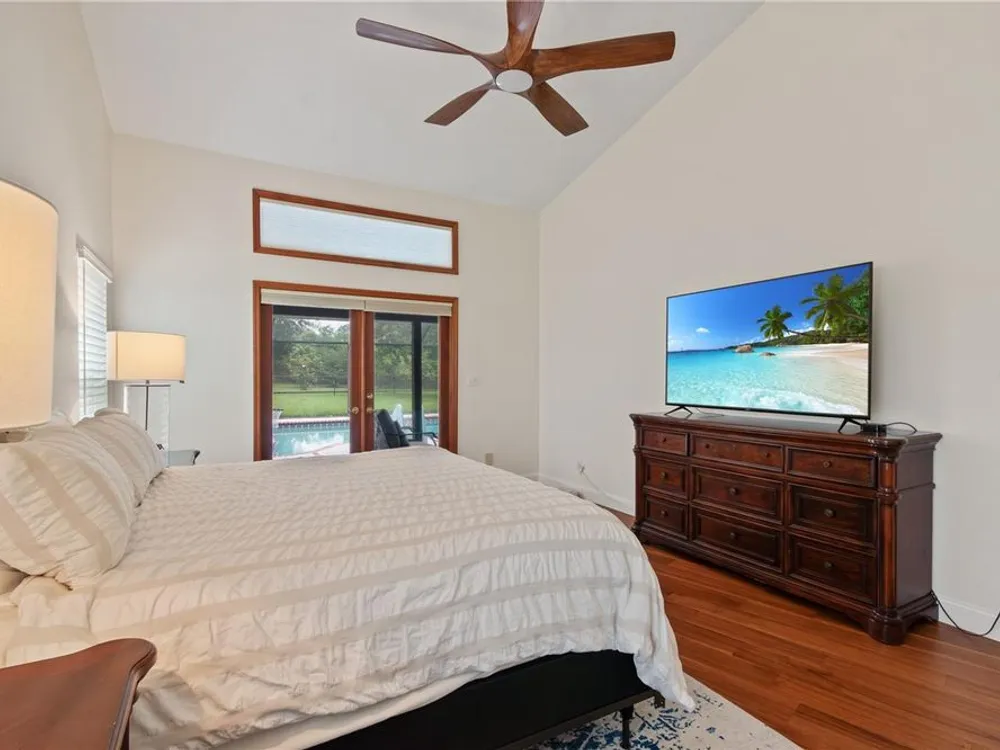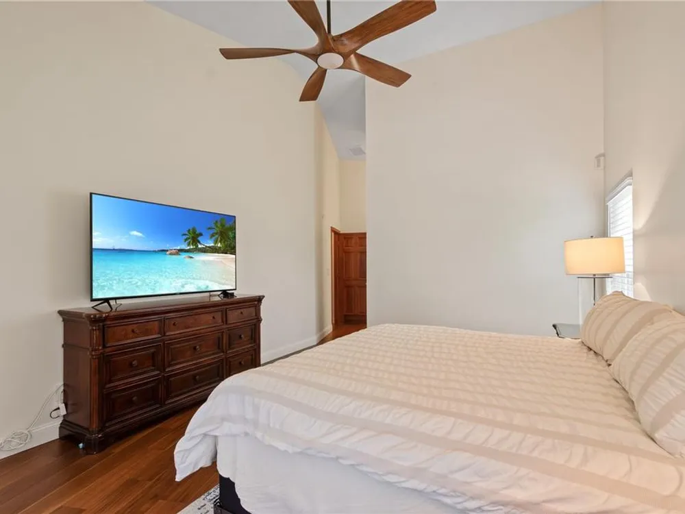 - Ceiling Fan(s), Crown Molding, Eat-in Kitchen, High Ceilings, Open Floorplan, Main Level Primary, Solid-Wood Cabinets, Stone Counters, Vaulted Ceiling(s), Walk-In Closet(s), Window Treatments