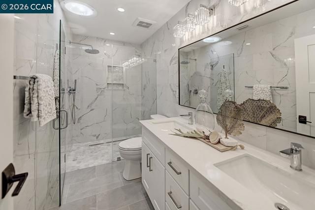 Stunning one-of-a-kind San Franciscan, end-unit, remodel with unobstructed panoramic views of rolling hills and pristine open space—no buildings in sight. This level-in home has been completely transformed with high-end designer upgrades. The open kitchen seamlessly embraces the park-like setting, while every window frames idyllic, serene scenery. Featuring two bedrooms, two fully remodeled bathrooms with elegant tile work, modern fixtures, and spacious walk-in showers, plus two private outdoor spaces. Bathed in natural light all day and enhanced by recessed LED lighting when needed. Freshly completed just days ago, this home showcases extensive upgrades throughout. The private front patio, enclosed by a wrought-iron fence, brings the lush landscaping right to you. A true must-see—impressive enough to win over even the most discerning buyers.
