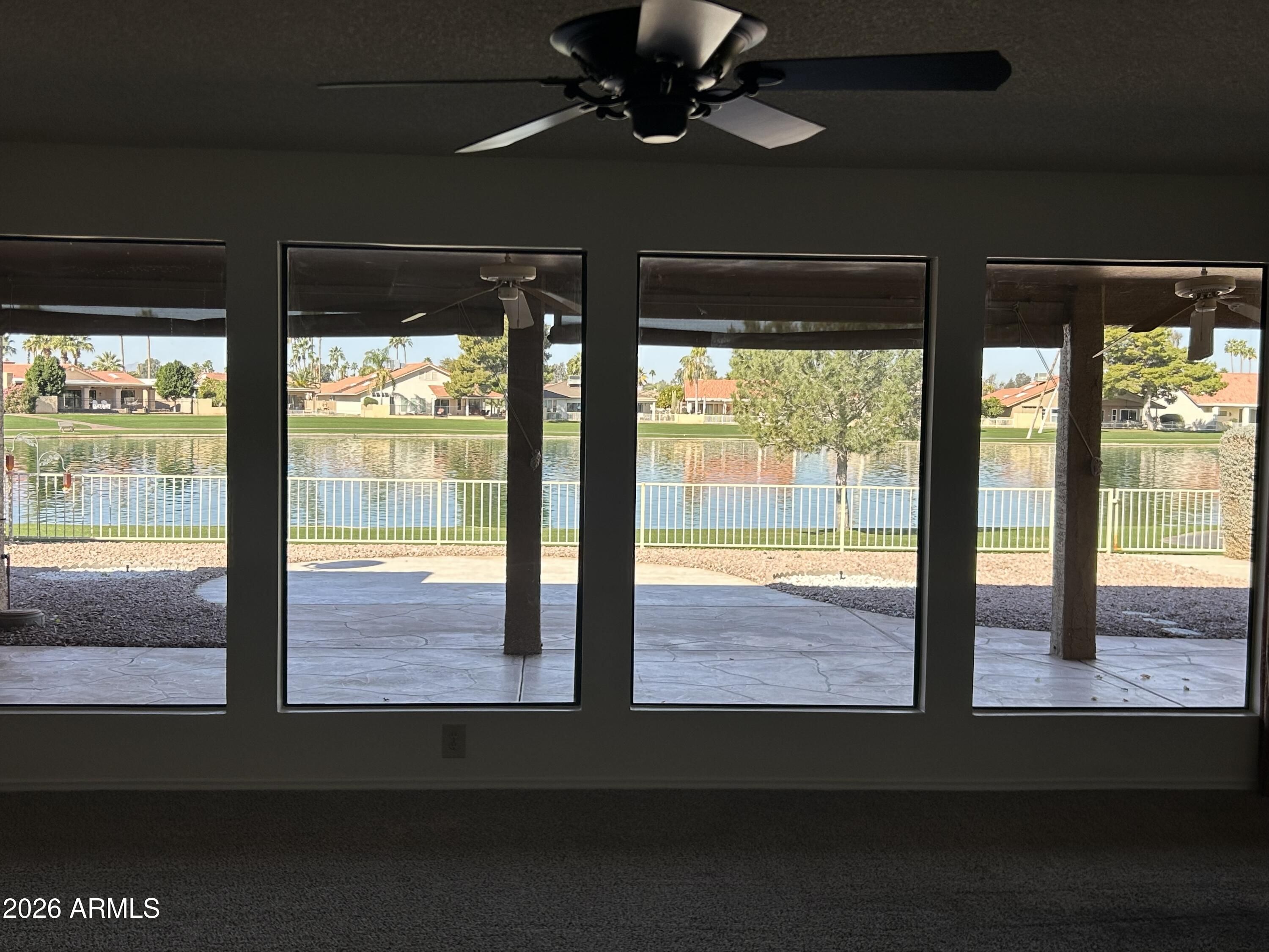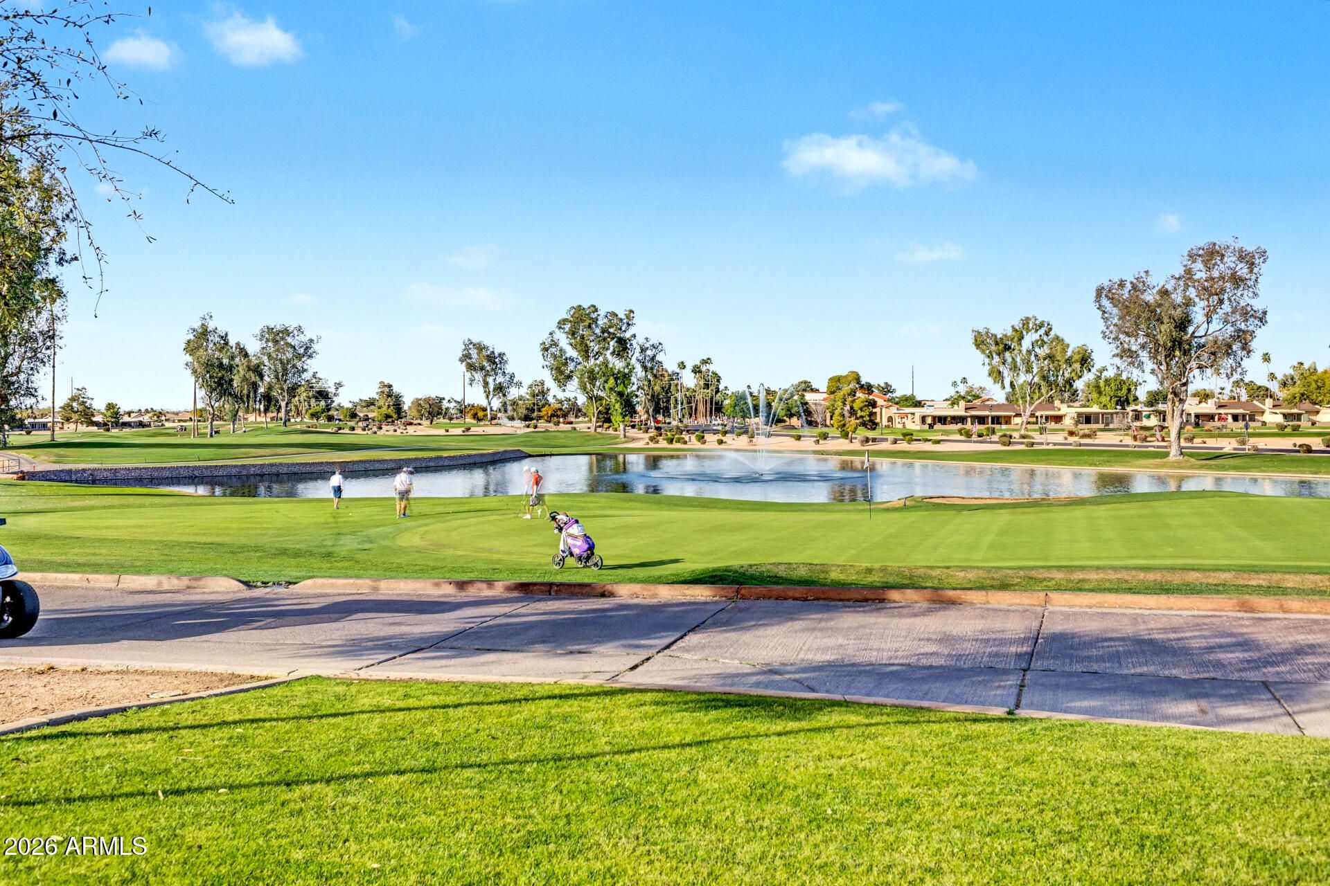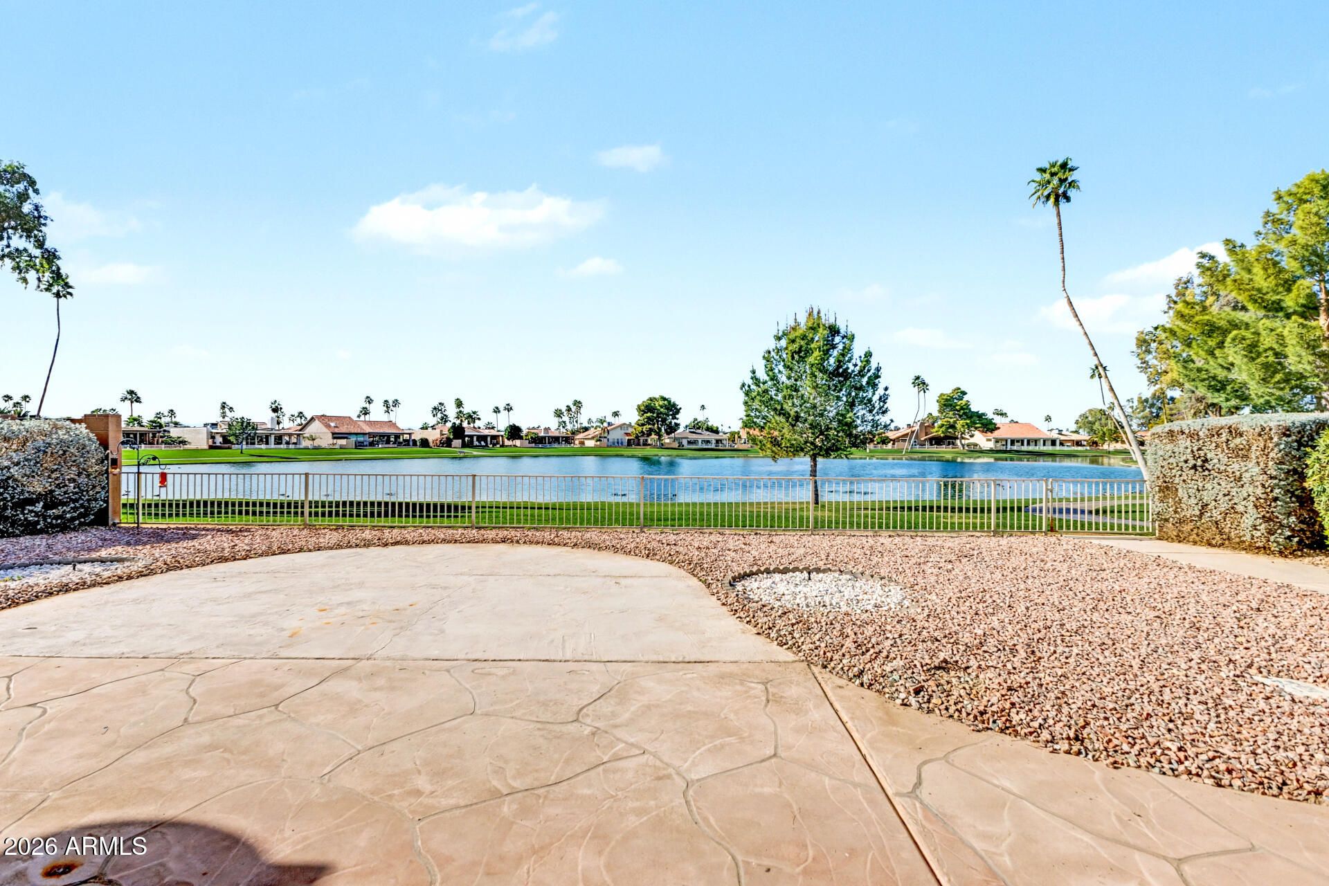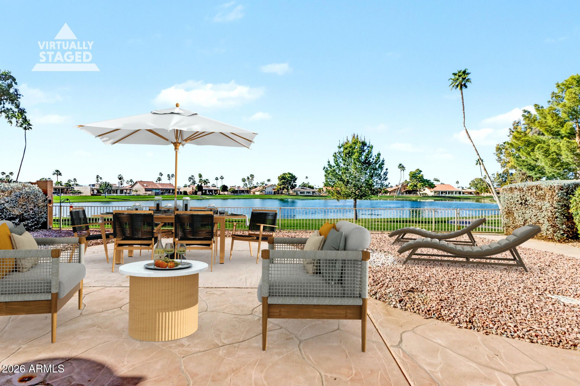 MILLION DOLLAR VIEW! Don't miss out on this Sun Lakes home with updated A/C, a spectacular lakeside lot, spacious yard with large covered patio & 3 bedrooms. Home has 2 car garage AND a golf cart storage area. Locations like this rarely come up - come see it today!!!