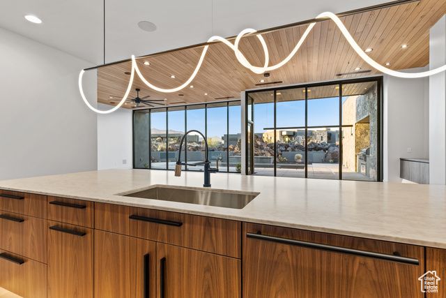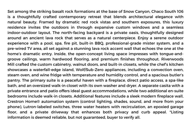 Set among the striking basalt rock formations at the base of Snow Canyon, Chaco South 106 is a thoughtfully crafted contemporary retreat that blends architectural elegance with natural beauty. Framed by dramatic red rock vistas and southern exposures, this luxury residence invites the outdoors in through expansive custom windows and a seamless indoor-outdoor layout. The north-facing backyard is a private oasis, thoughtfully designed around an ancient lava rock that serves as a natural centerpiece. Enjoy a serene outdoor experience with a pool, spa, fire pit, built-in BBQ, professional-grade mister system, and a pre-wired TV area, all set against a stunning lava rock accent wall that echoes the one at the home's dramatic entry. Inside, the open-concept living space impresses with tongue-and-groove ceilings, warm hardwood flooring, and premium finishes throughout. Riverwoods Mill crafted the custom cabinetry, walnut doors, and built-in closets, while the chef's kitchen showcases a waterfall-edge island, Wolf/Sub-Zero appliances, including a convection oven, steam oven, and wine fridge with temperature and humidity control, and a spacious butler's pantry. The primary suite is a peaceful haven with a fireplace, direct patio access, a spa-like bath, and an oversized walk-in closet with its own washer and dryer. A separate casita with a private entrance and patio offers ideal guest accommodations, while two additional en-suite bedrooms include walk-in closets. Additional features include a sleek modern fireplace wall, Crestron Home automation system (control lighting, shades, sound, and more from your phone), Lutron-labeled switches, three water heaters with recirculation, an epoxied garage floor, and a private driveway that enhances both privacy and curb appeal. *Listing information is deemed reliable, but not guaranteed, buyer to verify all.