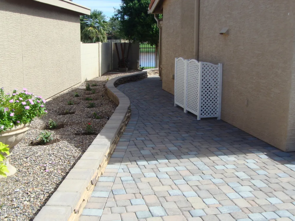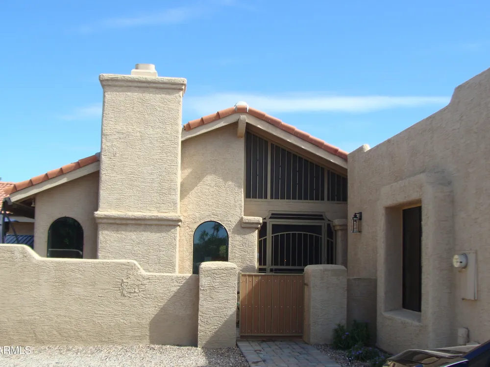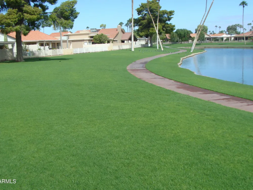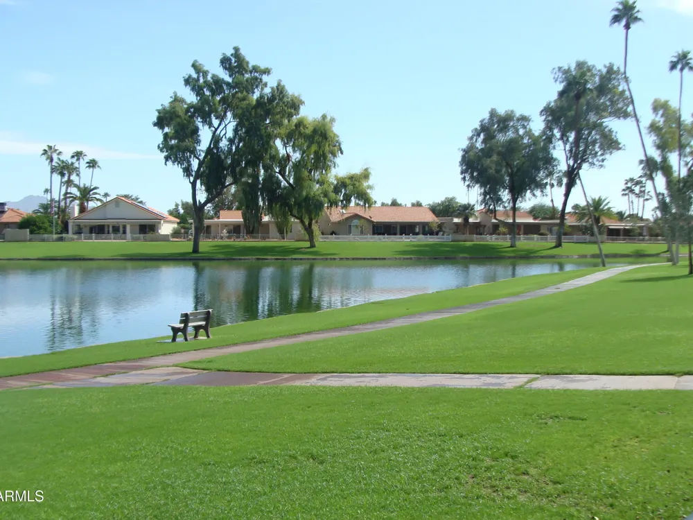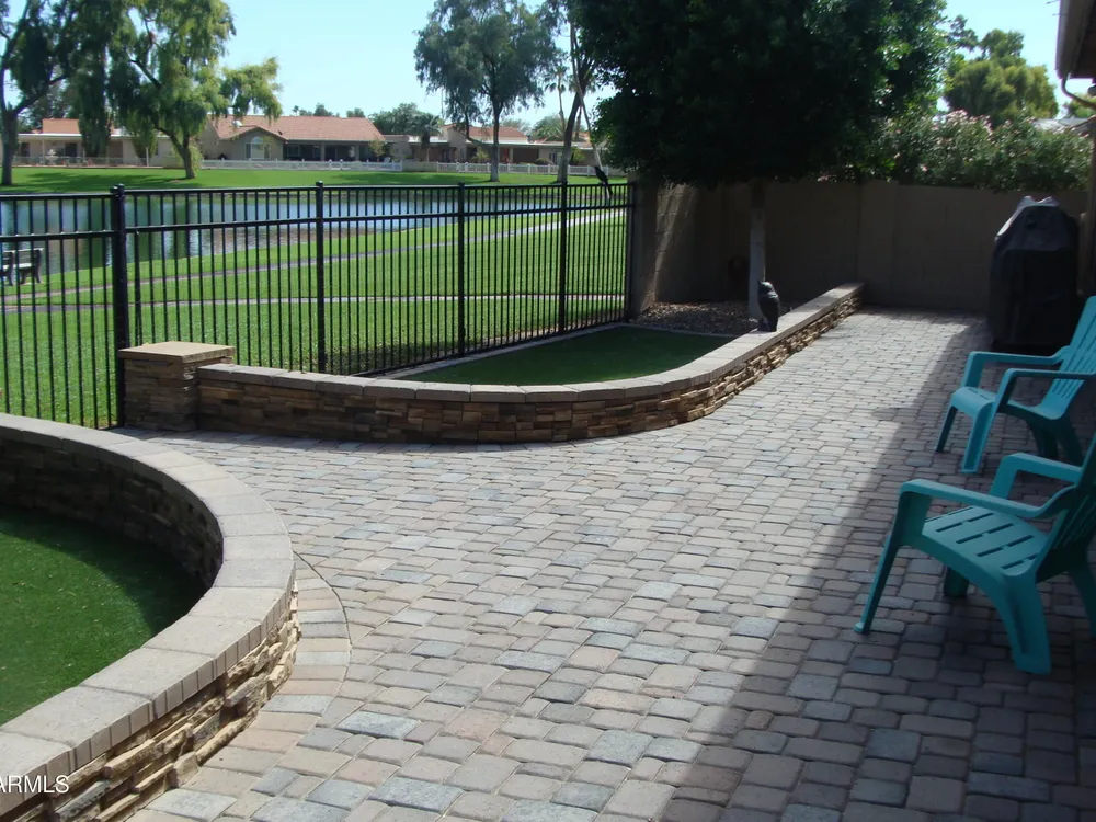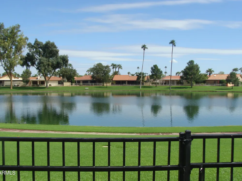 This beautiful home features an inviting front and side extended courtyards with fountains, custom pavers and lovely greenery, a large rear patio with custom, mister system, covered patio and a wonderful lake view, green spaces and walking path are just outside the back gate. Inside find an open floor plan, an open kitchen with plenty of cabinet spaces and upgraded appliances. The 2 large custom baths feature too many upgrades to mention here, a the master suite has sliding door access to the rear patio. A wet bar with fridge help make this a great home to entertain friends and family. Much love and work has gone into making this into a warm and welcoming home. The tile roof was new in 2021, the flat section redone in 2024, water heater new in 2024. All with Warranties.
