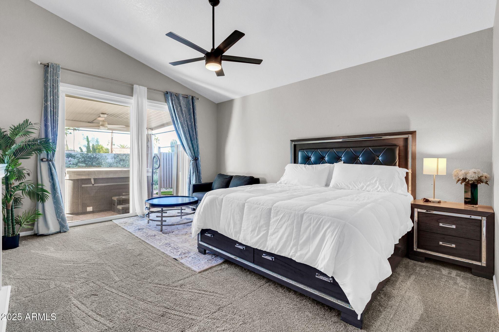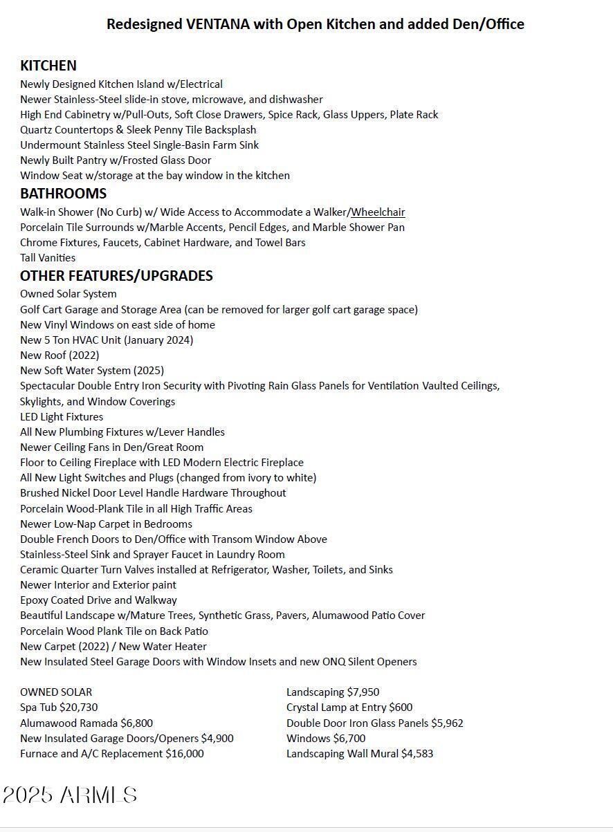 ONE OF A KIND GORGEOUS HOME! 2 Large Bedrooms, Den, 2.5 Golf Garage, OWNED SOLAR, Complete Interior Remodel with a RESORT-STYLE YARD! No expense spared, extensive list of upgrades including a 5-TON HVAC, NEW WINDOWS, NEW ROOF! Impressive Entry w/ Iron Rainglass Panels that open, Vaulted Ceilings, Open Concept, Light and Bright! Floor to Ceiling Fireplace. Designer Kitchen, Quartz Counters, Sleek Penny Tile Backsplash, Roll out Shelving, Pantry, Island for Entertaining, S/Steel Appliances. Wide Plank Porcelain Tile in Main Areas, Skylights, Oversized Bedrooms, Beautifully Remodeled Bathrooms with Marble Tile/Accents. Main Bedroom accesses Alumawood Patio w/Newer Spa & Changing Station. Resort Yard w/Synthetic Grass, Pavers, Lush Landscaping, Floral Mural (can be removed) POPULAR COTTONWOOD