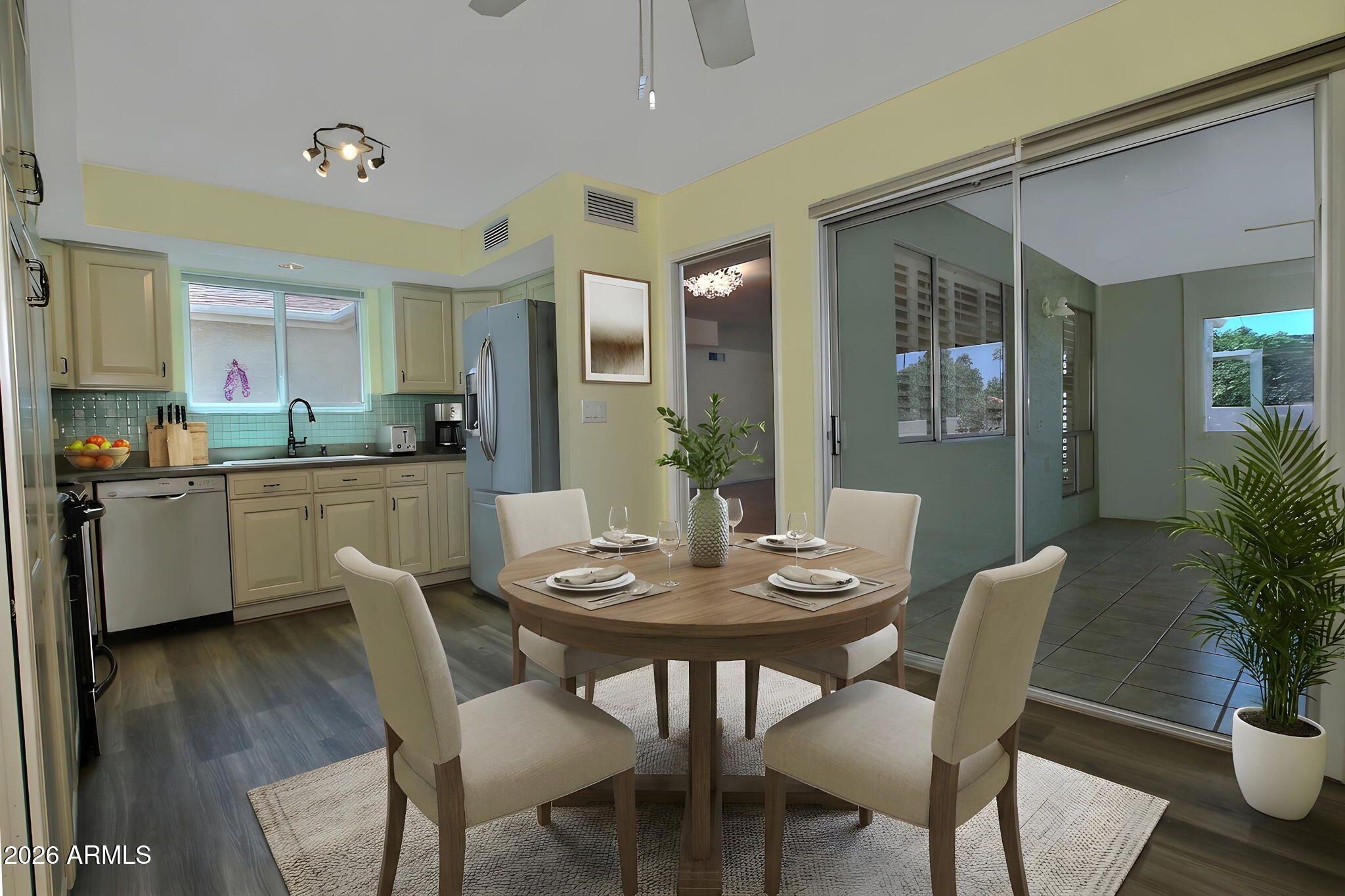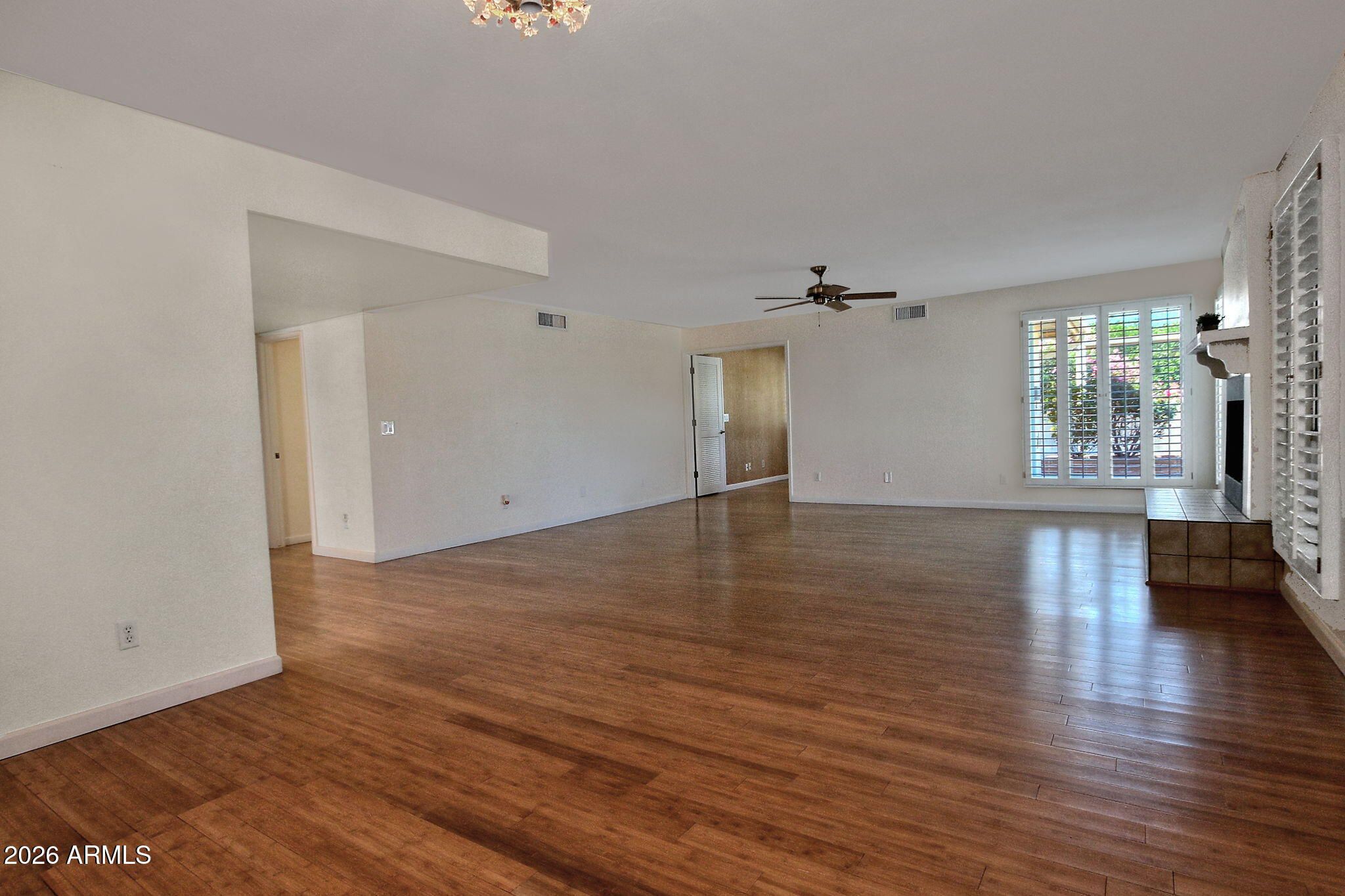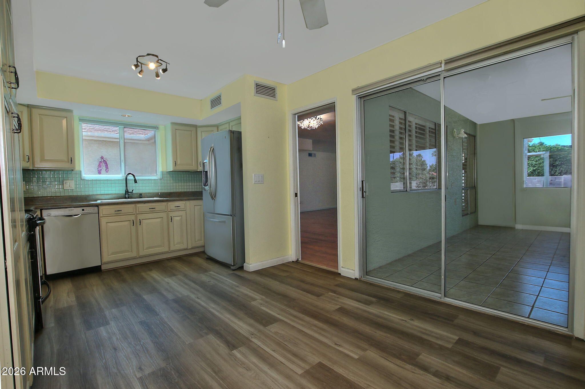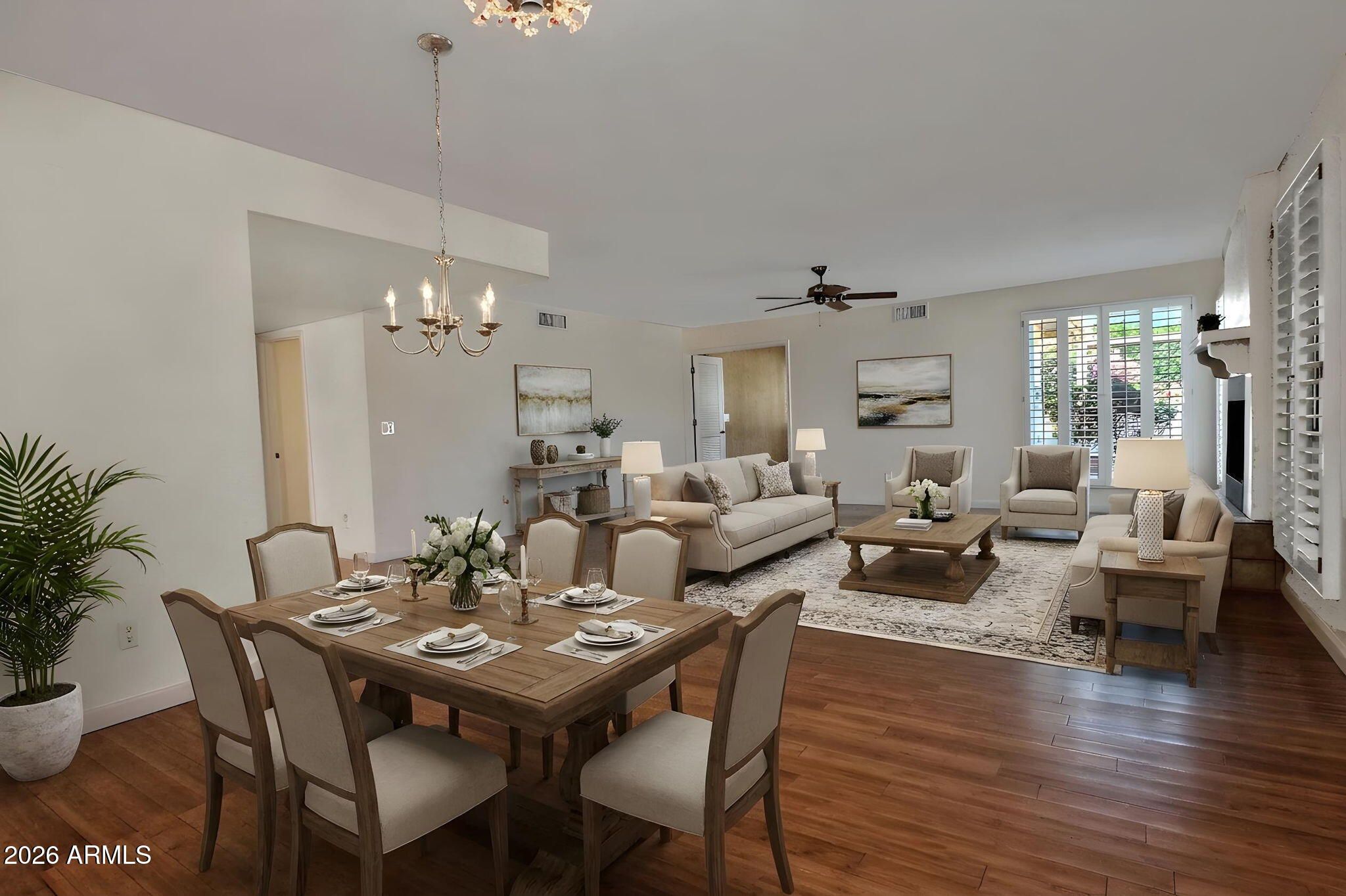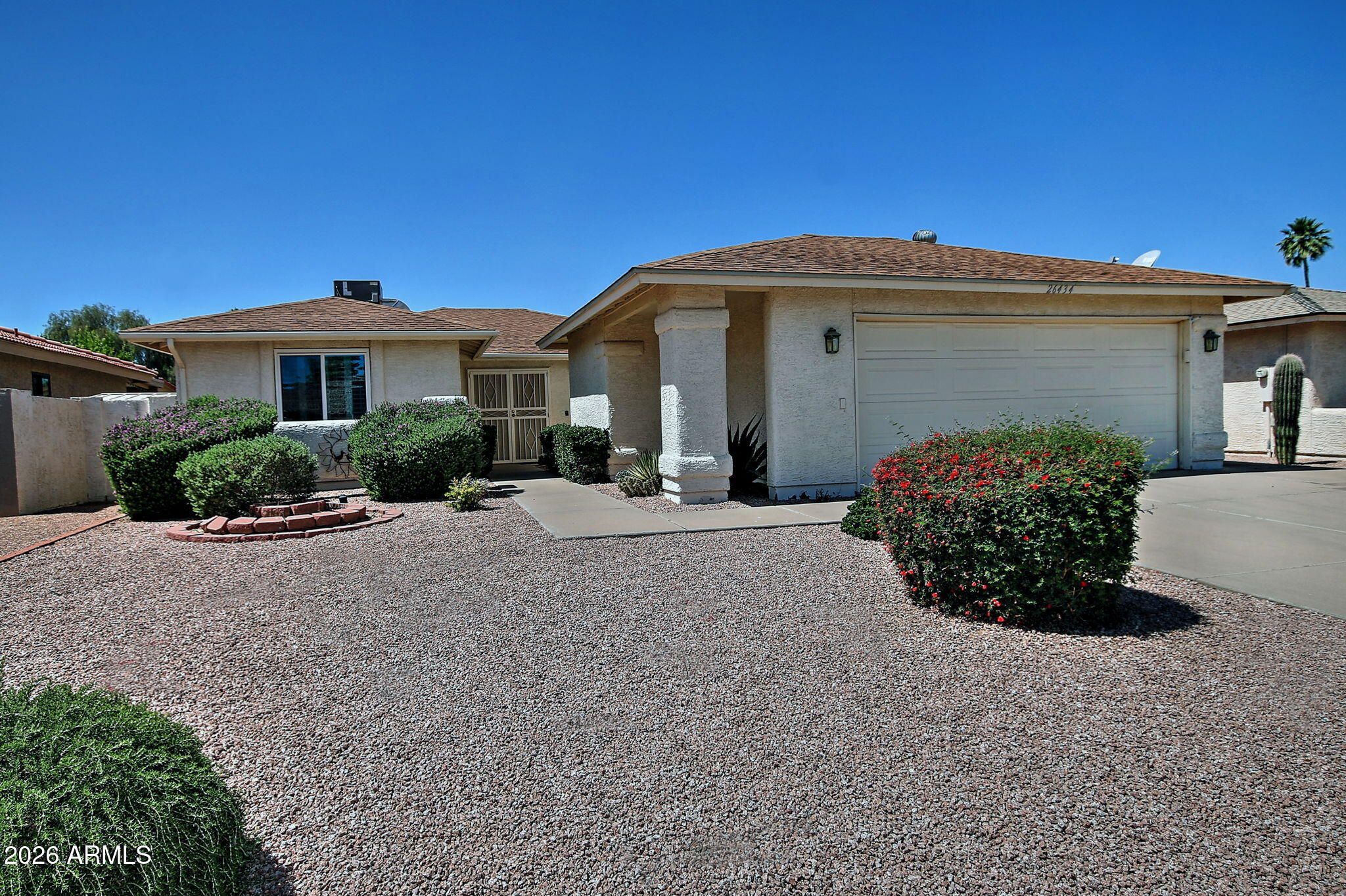 Experience the BEST to Arizona Living! Nestled in the highly sought-after Sun Lakes active-adult community, this gorgeous single-story home offers a spacious floorplan, low-maintenance living on a generously sized lot. The flexible two-bedroom, two-bath layout includes a bonus versatile den, making it easy to create a home office, hobby space, or guest area with an existing wet bar. The open great-room floorplan is enhanced by abundant natural light from energy-efficient windows fitted with interior window shutters. Attractive hard surface flooring can be found throughout, this well-maintained home. The kitchen boasts of remodeled cabinets, stainless steel appliances, and easy access to the rest of the home. A bonus Arizona sunroom extends your living space and invites year-round enjoyment .Spacious enough for a billiards table or game room, this Arizona room is equipped with its own AC unit, ensuring comfort throughout every season. Entertainment space can be discovered in the spacious backyard and patio space highlighted with mature citrus trees and low maintenance landscaping. In addition, this home is just a quick drive to enjoy access to the Sun Lakes amenities -- Championship golf, sparkling community pools, a vibrant community center, pickleball and tennis courts, and year-round activities that keep the community active and engaged. Welcome Home!