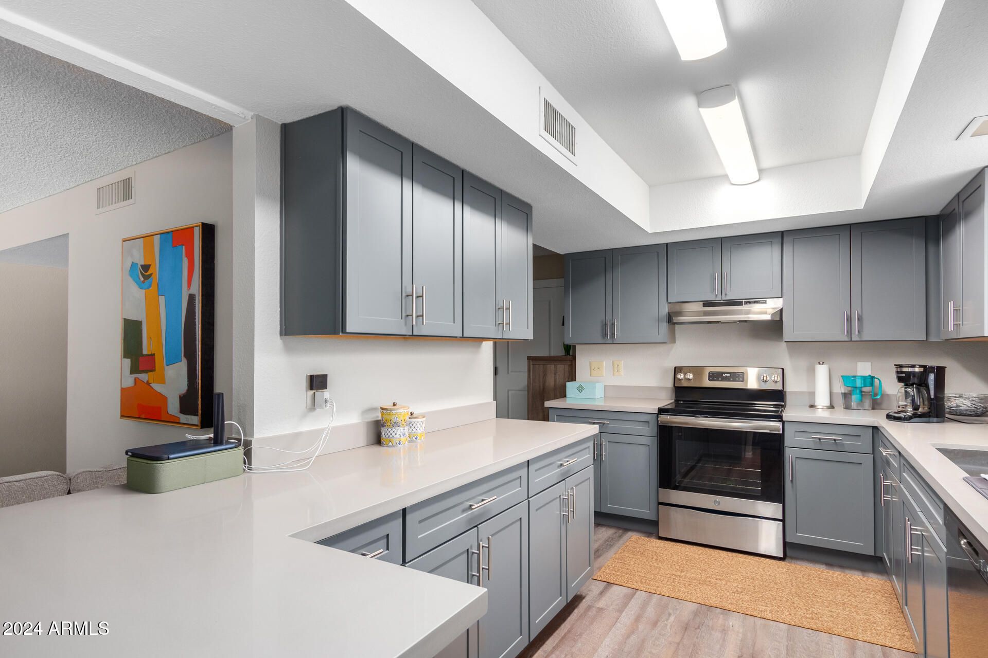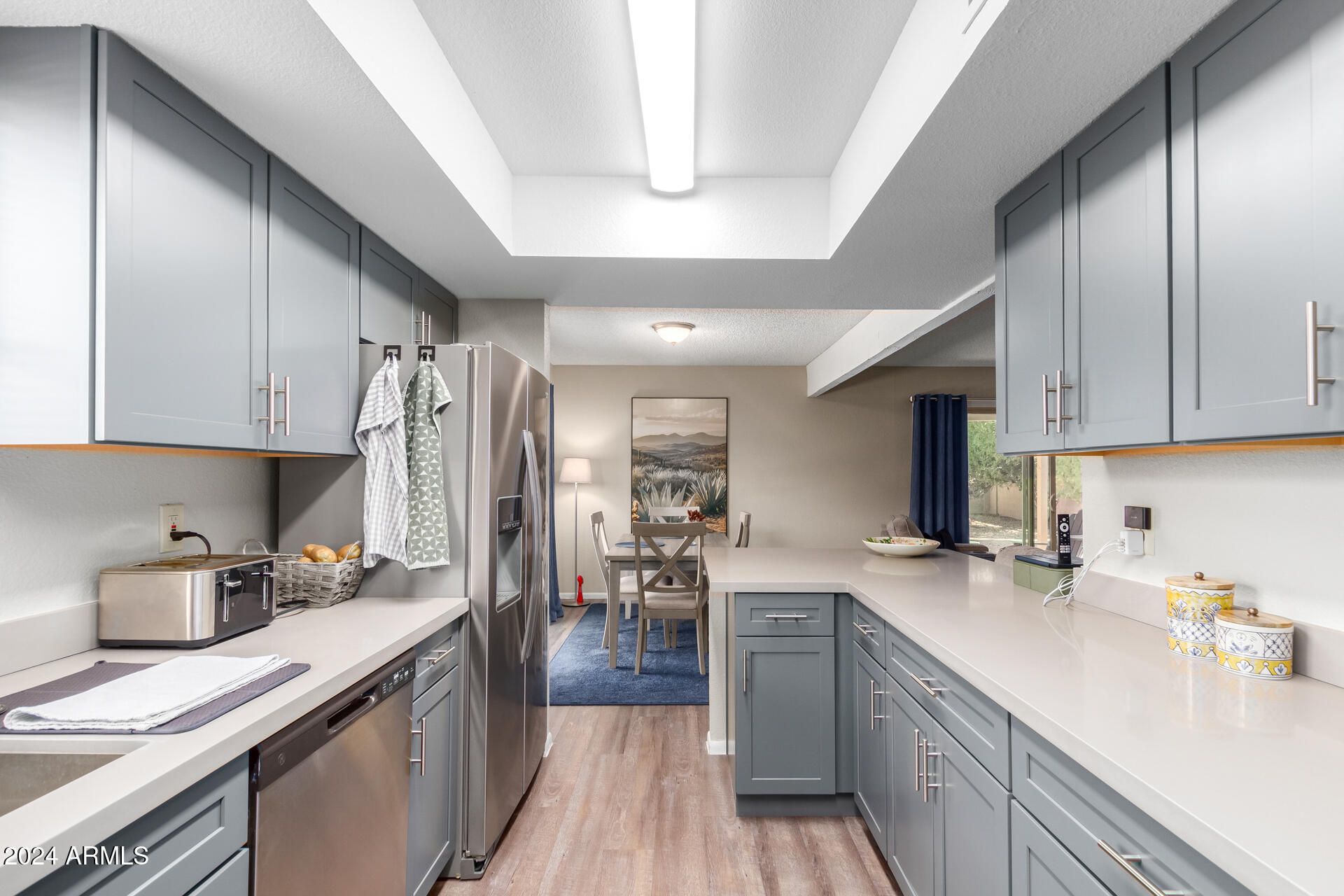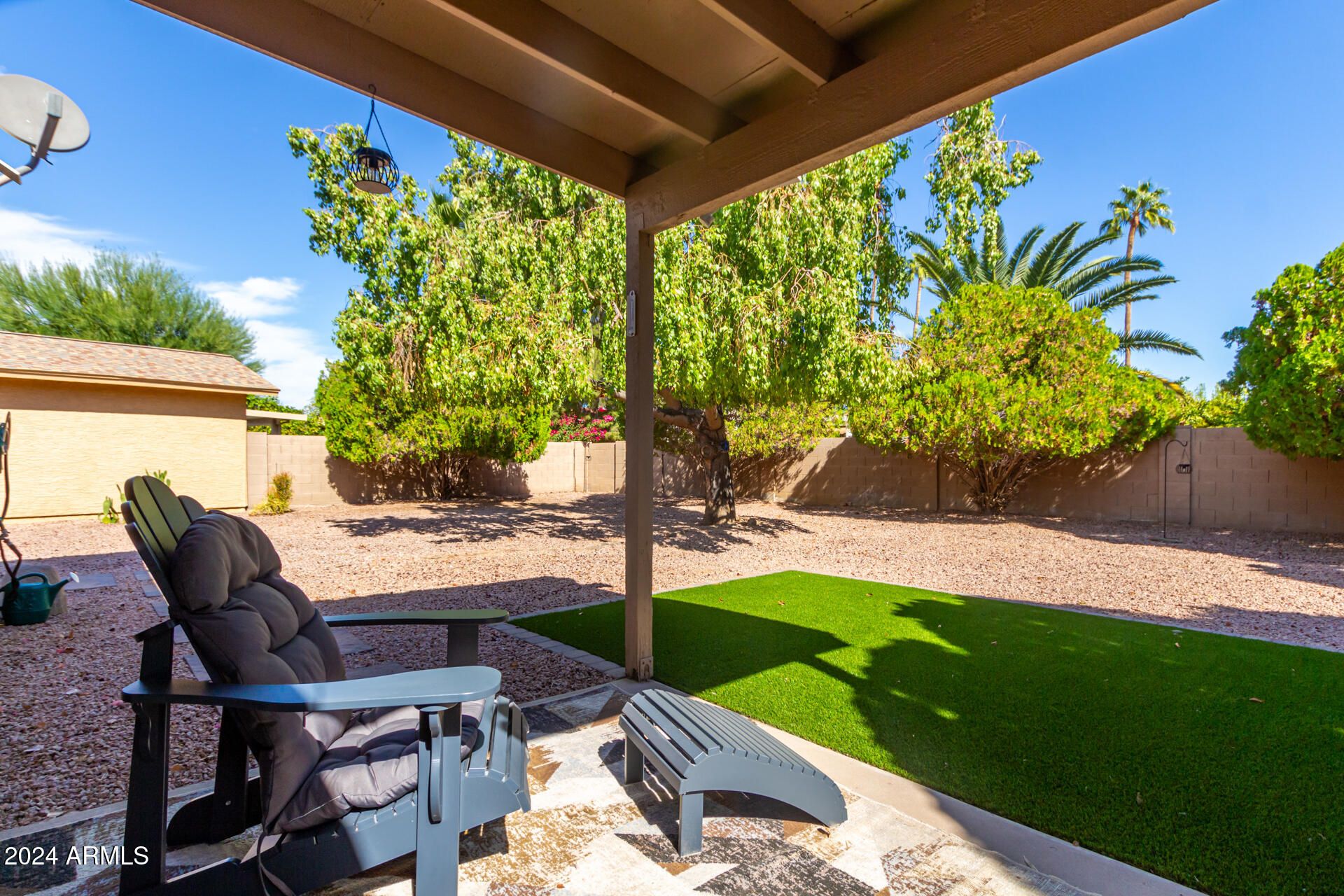 This charming FULLY FURNISHED 2-bedroom residence in Sun Lakes is the one you've been searching for! Discover a lovely living room with a soothing palette and stylish wood-look flooring. The brand new kitchen comes with quartz counters, grey shaker cabinets, sleek stainless steel appliances, and a peninsula with a breakfast bar for casual dining. The primary bedroom offers plush carpeting, sliding door access to the backyard, and a private bathroom with a walk-in closet. Enjoy relaxing moments in the backyard, showcasing a covered patio, pristine artificial turf, and mature shade trees. Golf cart included!! Make this gem yours today!