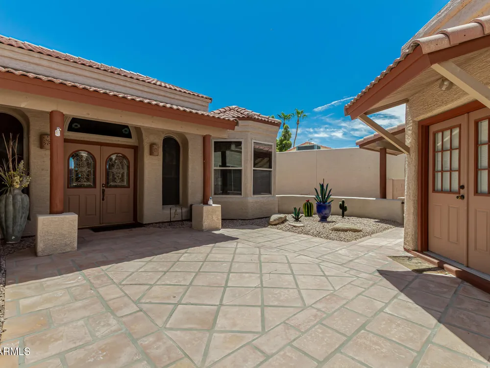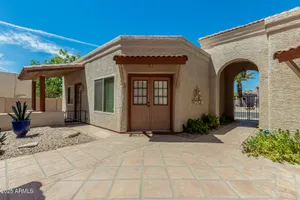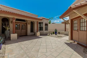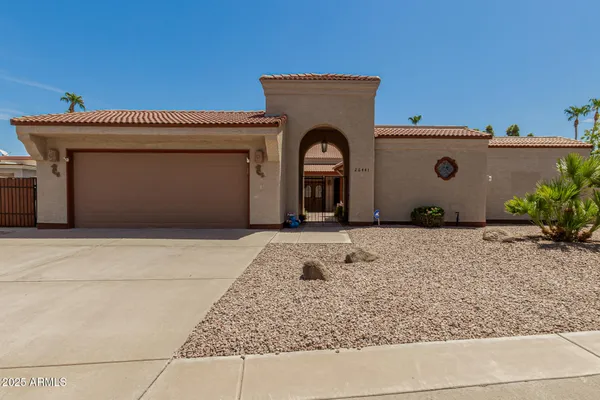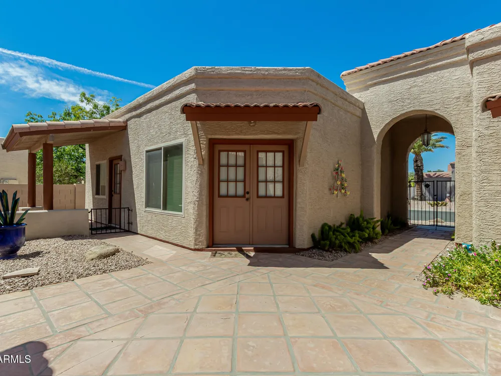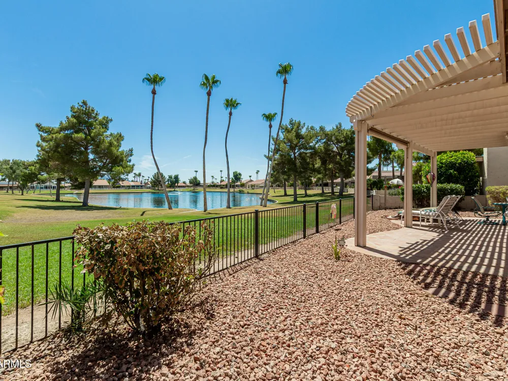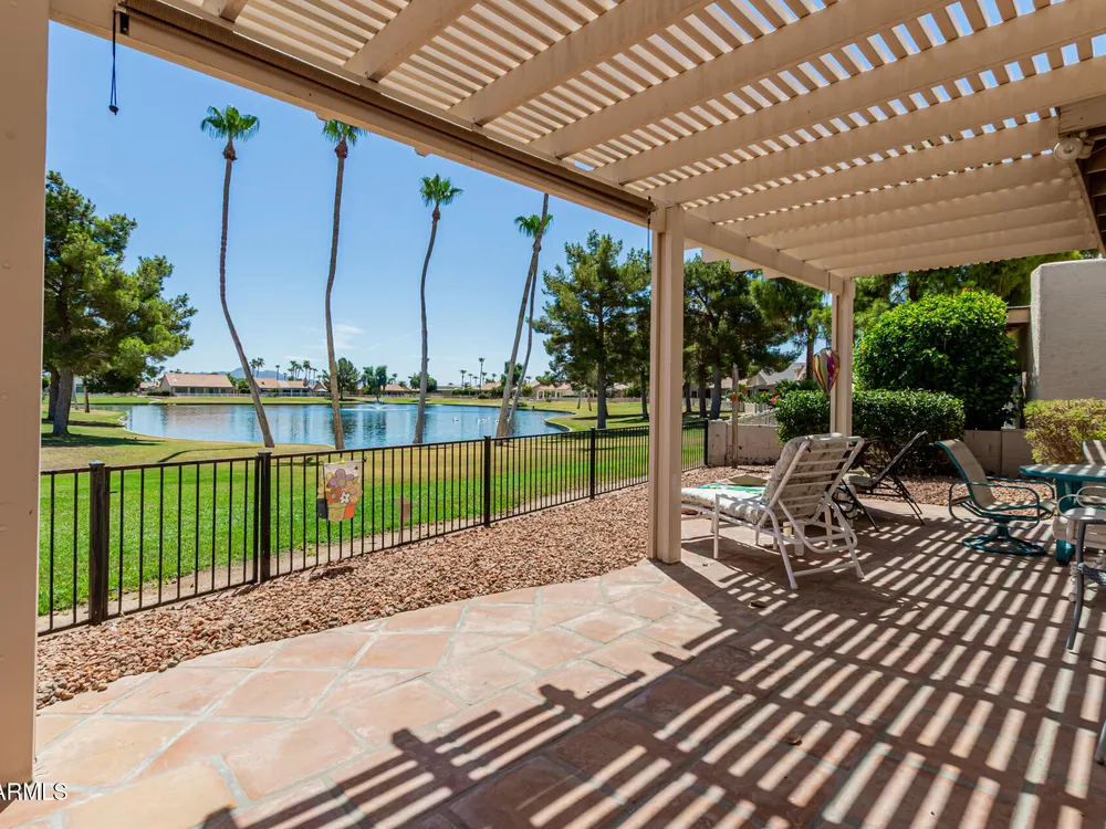 Sun Lakes is an awesome 55+resort lifestyle community. This unique lakefront home has many extras, a separate casita and a bonus workshop/office. The entrance brings you into a beautiful courtyard, then walk through double doors with leaded glass windows into an open and airy living area. Saltillo tile covers the courtyard and follows throughout the living area to the outside patio.Kitchen is spacious with granite countertops, beautiful wood cabinets and a breakfast nook. Both the LR and DR are bright and feature amazing views of the private lake & swans.The Master Suite has a huge walk-in California-style closet, custom Plantation shutters with a sliding door to outside pergola covering the patio. This house can be your dream come true ! Main house has 2 BR/2.5 Baths. Casita is 1 BR/1BA Living in Sun Lakes, guarantees you'll enjoy world-class amenities including golf courses, swimming pools, pickleball and tennis courts, clubhouses, and a vibrant calendar of activities.