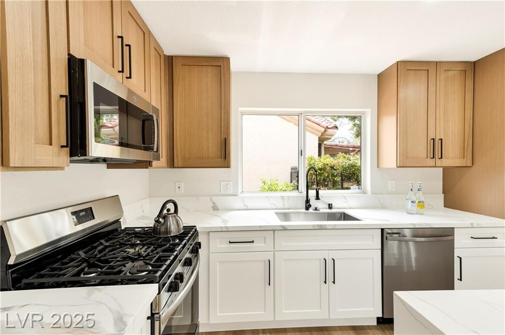 Welcome to your fully renovated 2-bedroom, 2-bath home in the highly sought-after age-restricted community of Sun City Summerlin! This beautiful residence features a modern open floor plan with brand-new luxury vinyl flooring, fresh paint, and updated lighting throughout. The stunning kitchen offers quartz countertops, custom cabinetry, and stainless steel appliances—perfect for entertaining. Both bathrooms have been tastefully remodeled with designer finishes. Enjoy serene mornings or relaxing evenings on the private covered patio. Located in one of Las Vegas' premier 55+ communities, residents enjoy access to world-class amenities including multiple pools and spas, tennis and pickleball courts, golf courses, fitness centers, and vibrant community clubhouses offering countless social activities and events. Don’t miss your chance to enjoy a low-maintenance, active lifestyle in a beautifully updated home—schedule your private tour today!