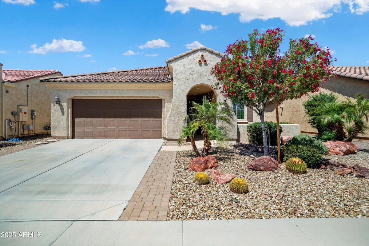 Priced $20,000 LESS than today's base price to build this Sanctuary model in Sun City Festival. Located on arguably the most charmingly named street in the community, Cat Balue Drive, this 2BR + den home offers tile flooring throughout, upgraded kitchen cabinetry with pull-outs, reverse osmosis and soft water systems, and a low-threshold shower. A 16-panel solar system averages approx. $120/month combined APS + lease. Enjoy a fenced yard, finished landscaping, and no construction delays. Better value than new build — your Oasis in Festival.