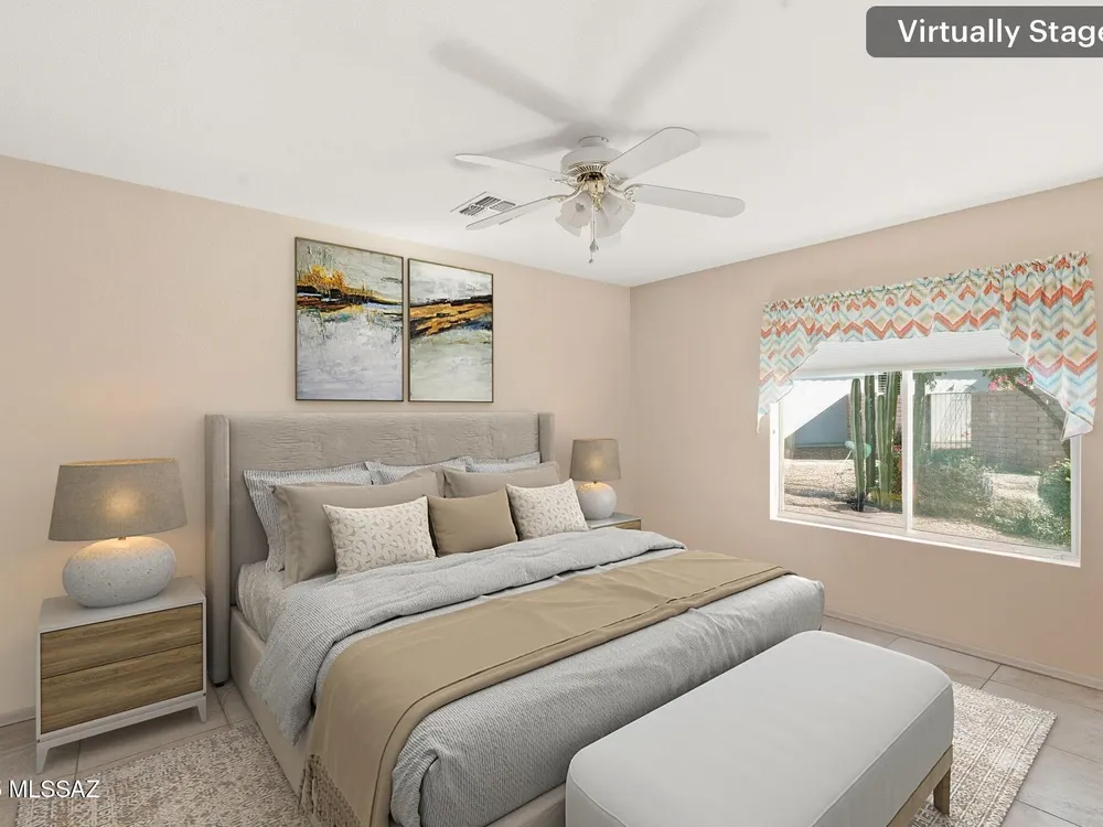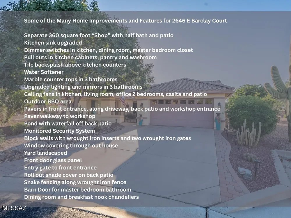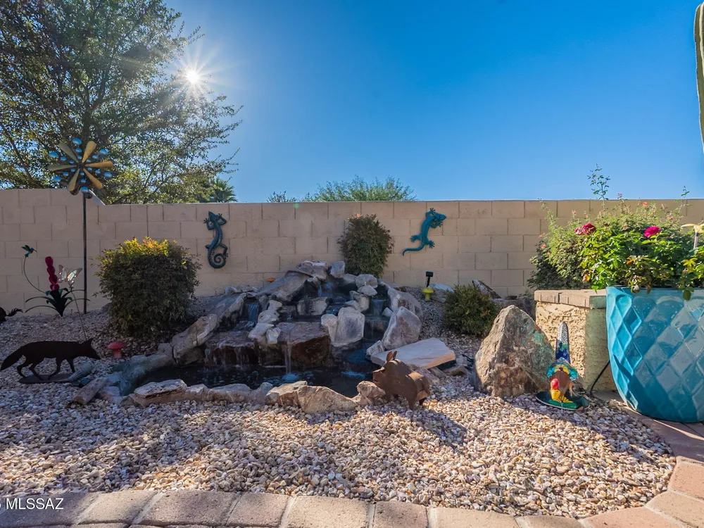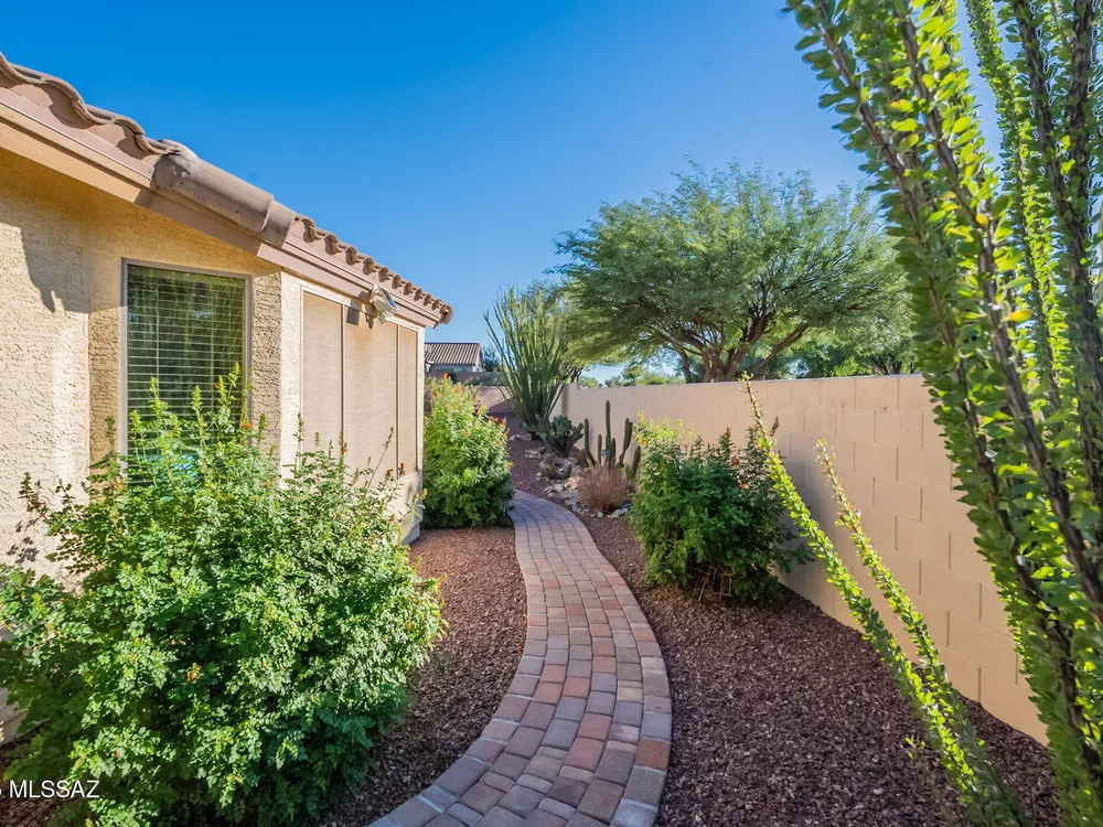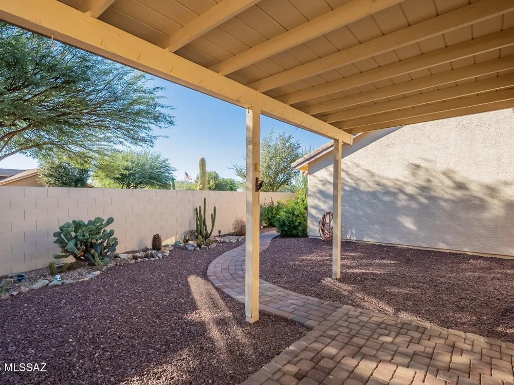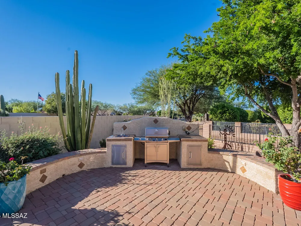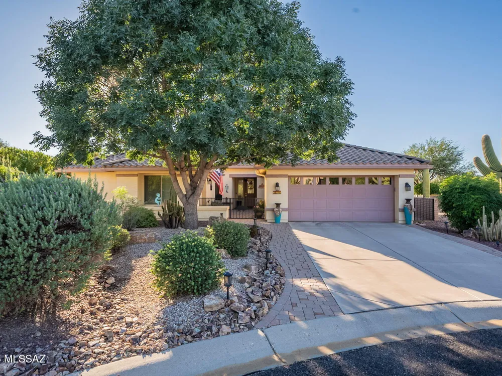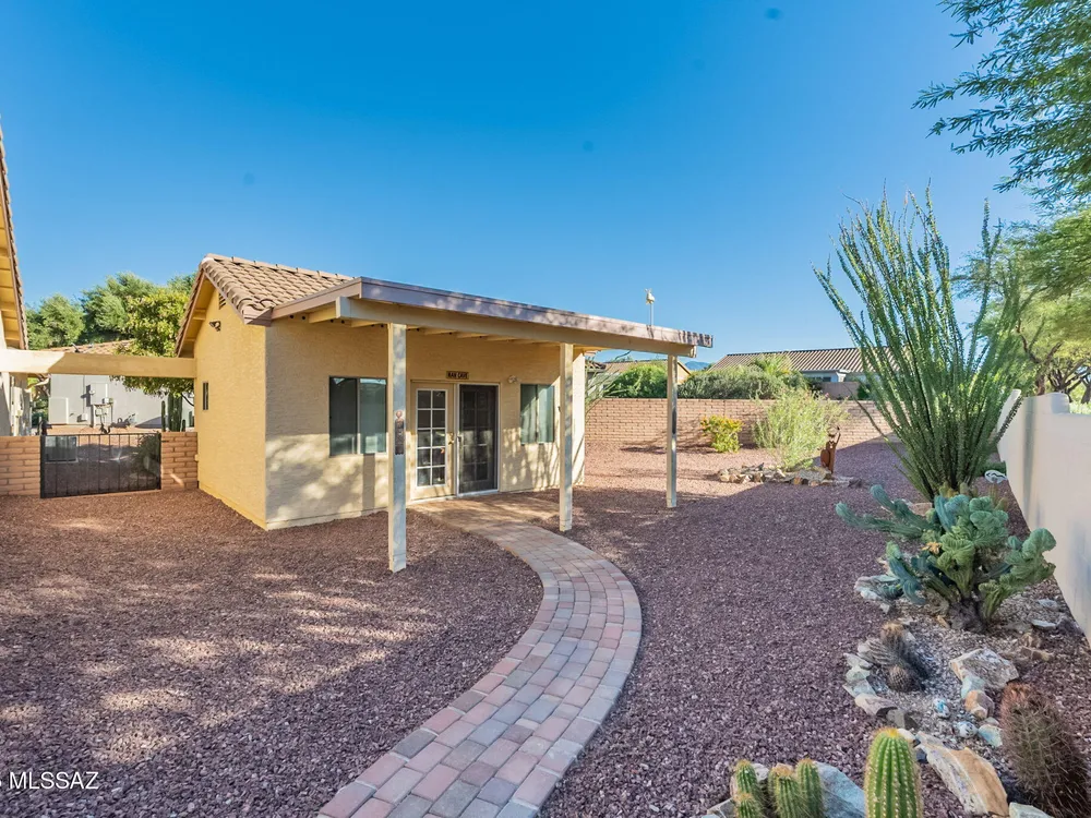 This stunning home in the sought-after Quail Creek community truly has it all! A charming brick paver courtyard welcomes you through a decorative wrought iron gate, where you'll discover a full guest casita and a cozy seating area--perfect for enjoying your morning coffee in peace.Step inside to an open-concept floor plan with soaring ceilings and tasteful updates throughout. The beautifully appointed kitchen features solid surface countertops, custom pull-out drawers, a stylish tile backsplash, breakfast bar, and sunny breakfast nook--ideal for both everyday living and entertaining.The spacious primary suite offers wood-look ceramic tile flooring, a beautifully updated bathroom, a large walk-in closet, and a handsome barnwood-style sliding door for added privacy.