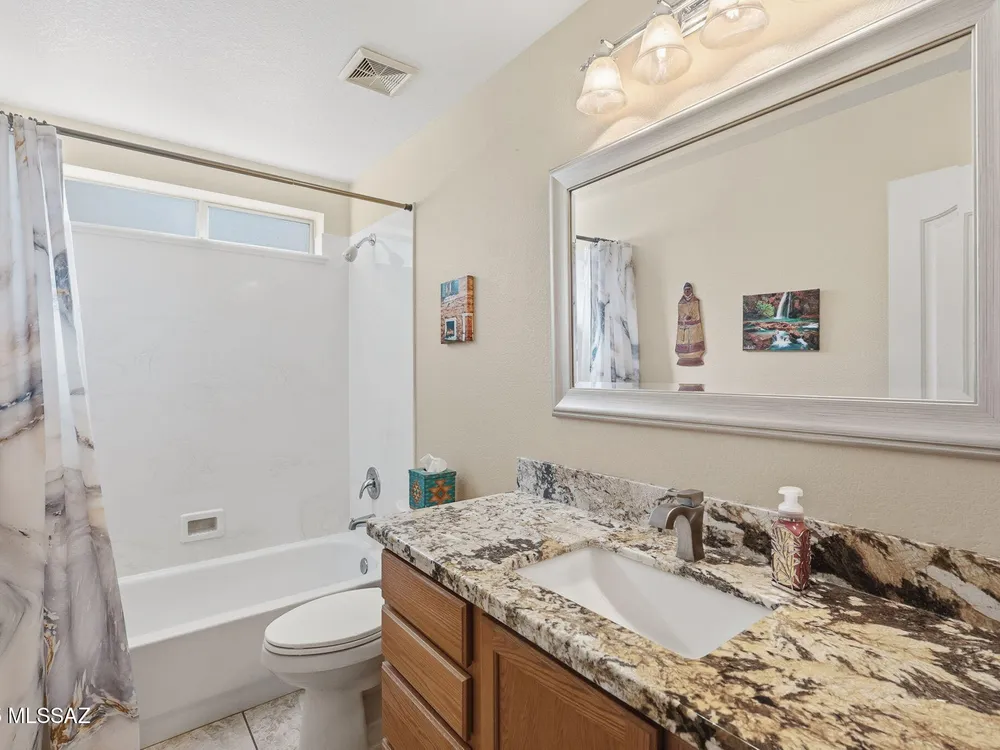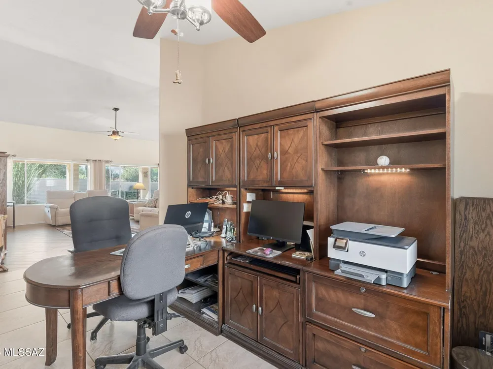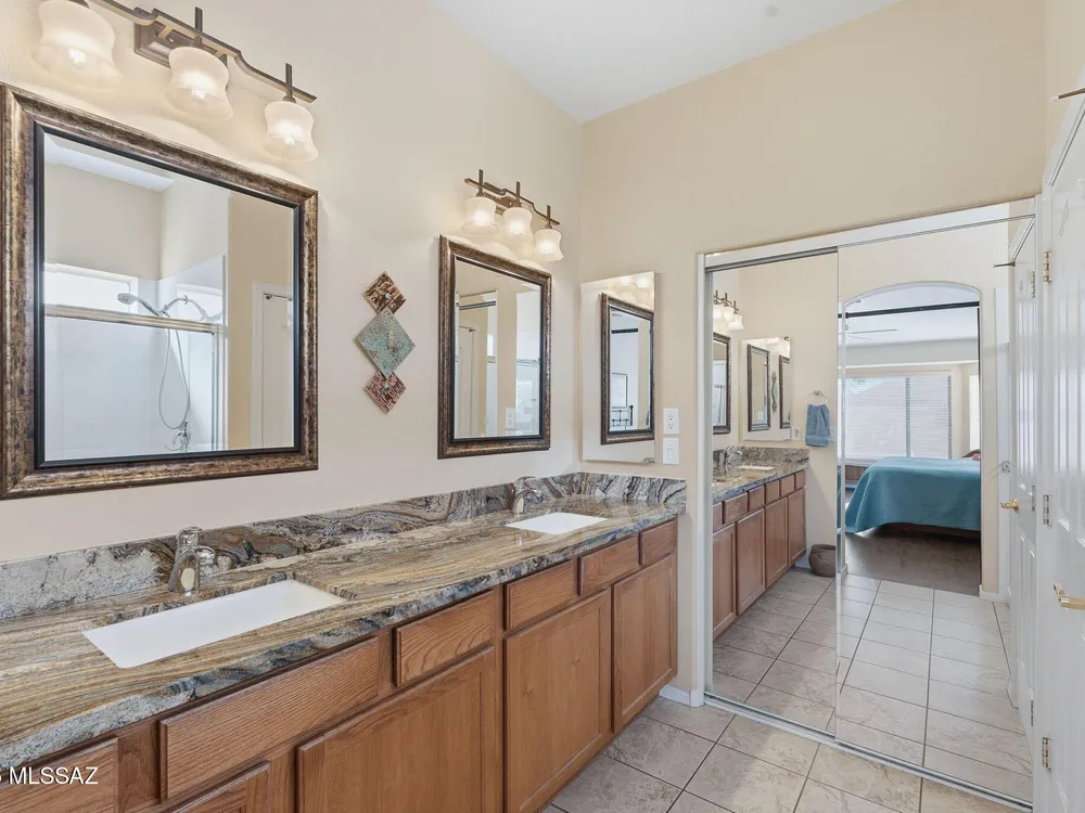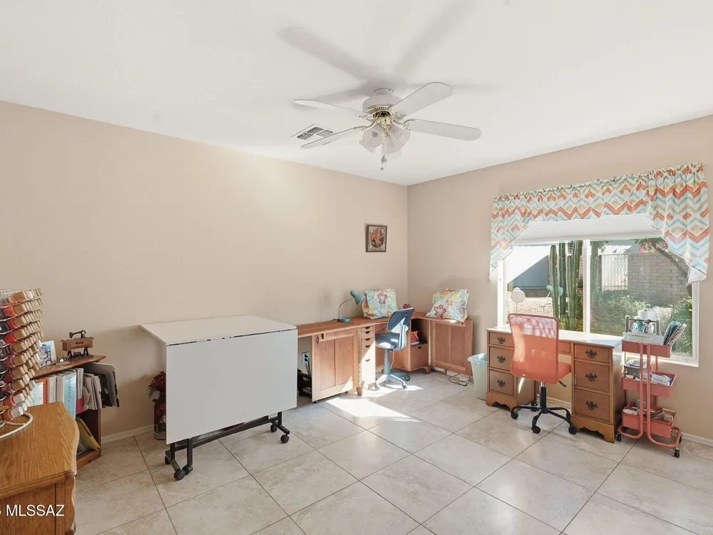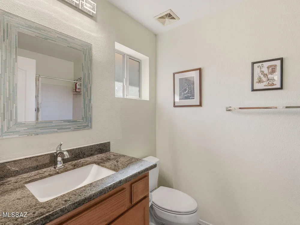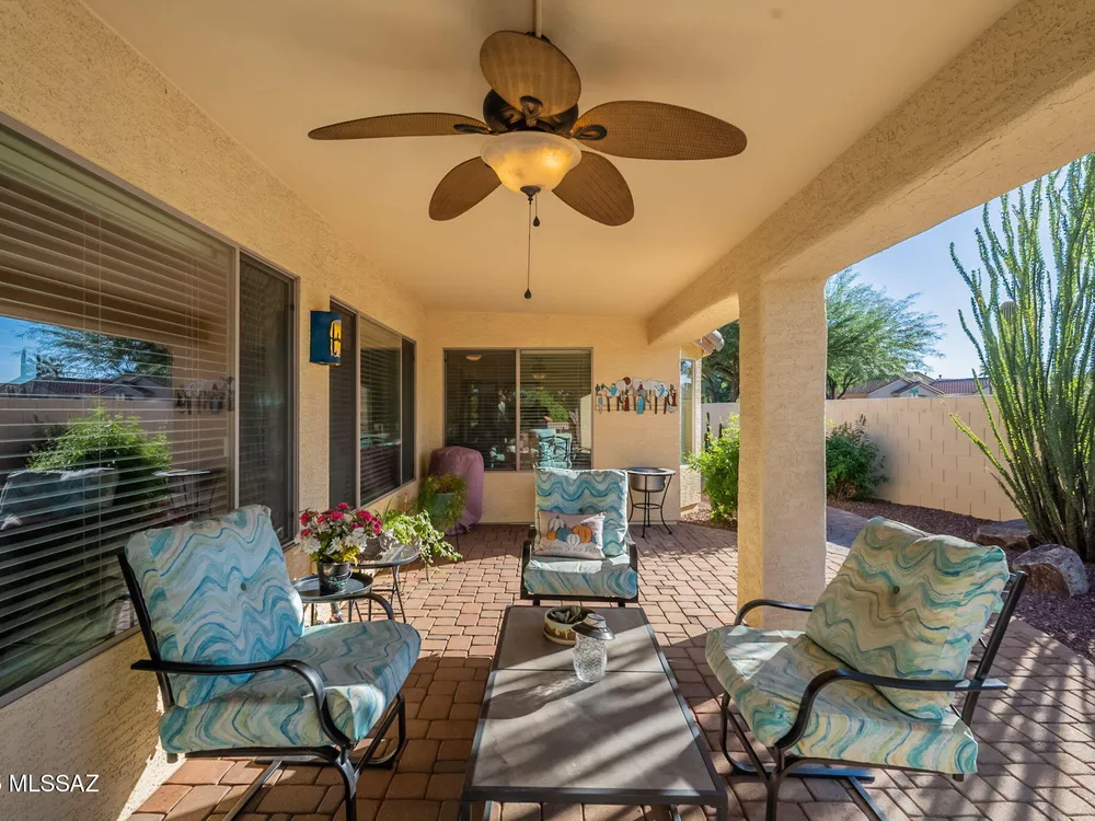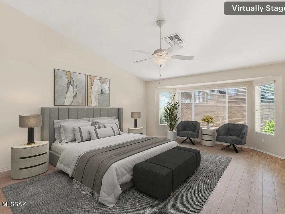 This stunning home in the sought-after Quail Creek community truly has it all! A charming brick paver courtyard welcomes you through a decorative wrought iron gate, where you'll discover a full guest casita and a cozy seating area--perfect for enjoying your morning coffee in peace.Step inside to an open-concept floor plan with soaring ceilings and tasteful updates throughout. The beautifully appointed kitchen features solid surface countertops, custom pull-out drawers, a stylish tile backsplash, breakfast bar, and sunny breakfast nook--ideal for both everyday living and entertaining.The spacious primary suite offers wood-look ceramic tile flooring, a beautifully updated bathroom, a large walk-in closet, and a handsome barnwood-style sliding door for added privacy.