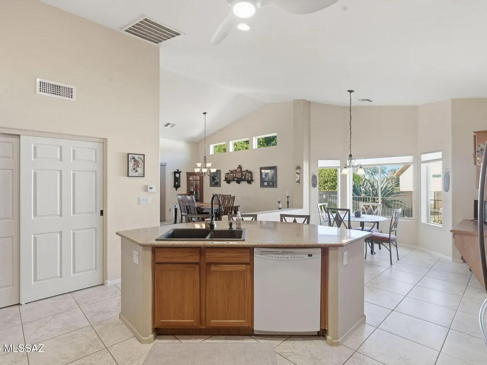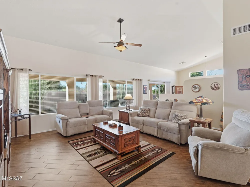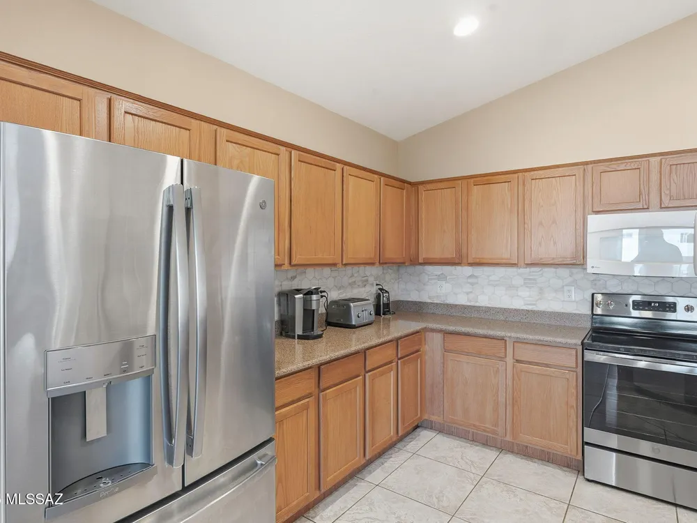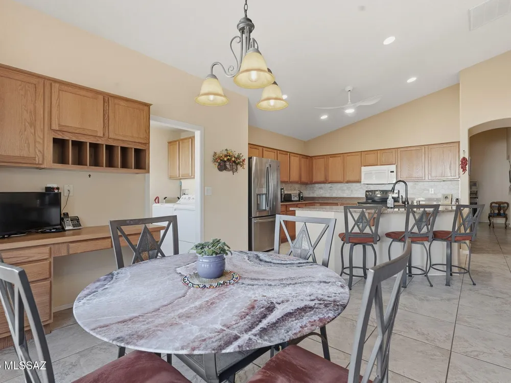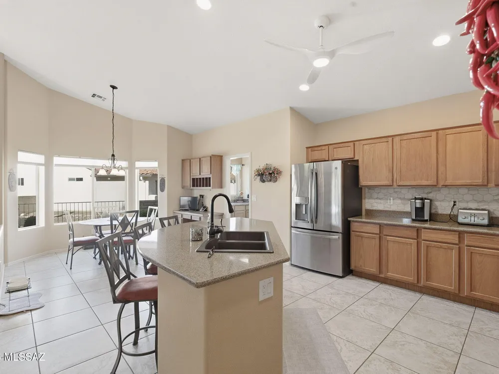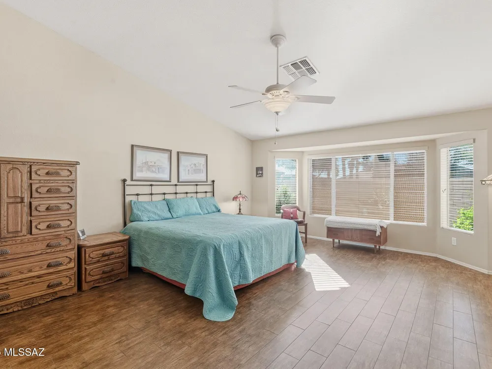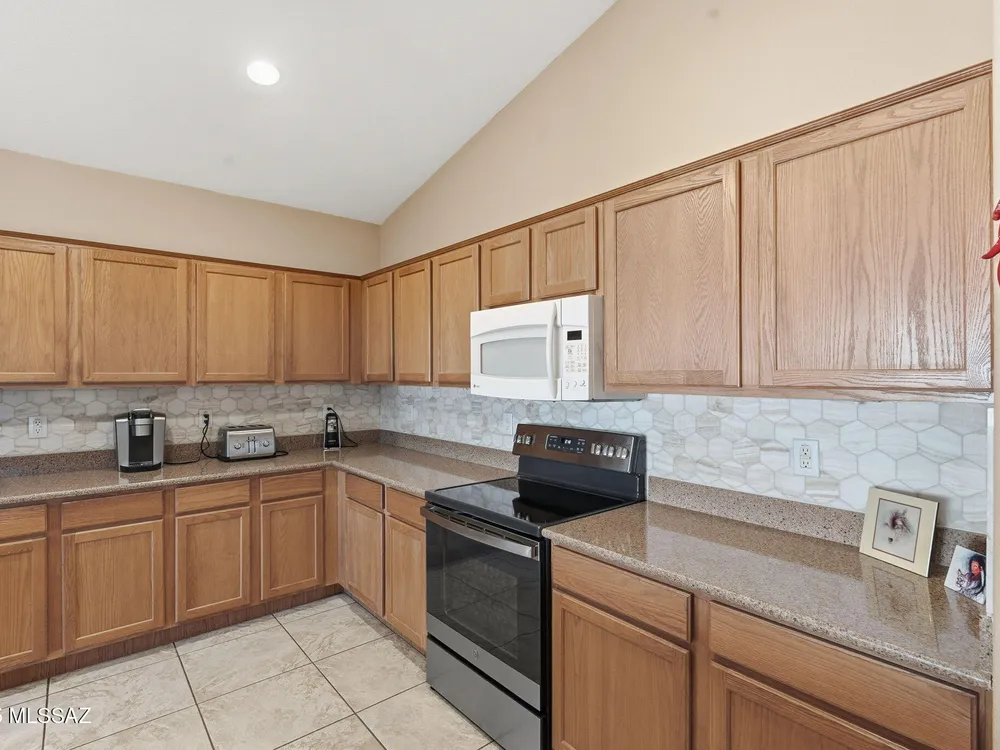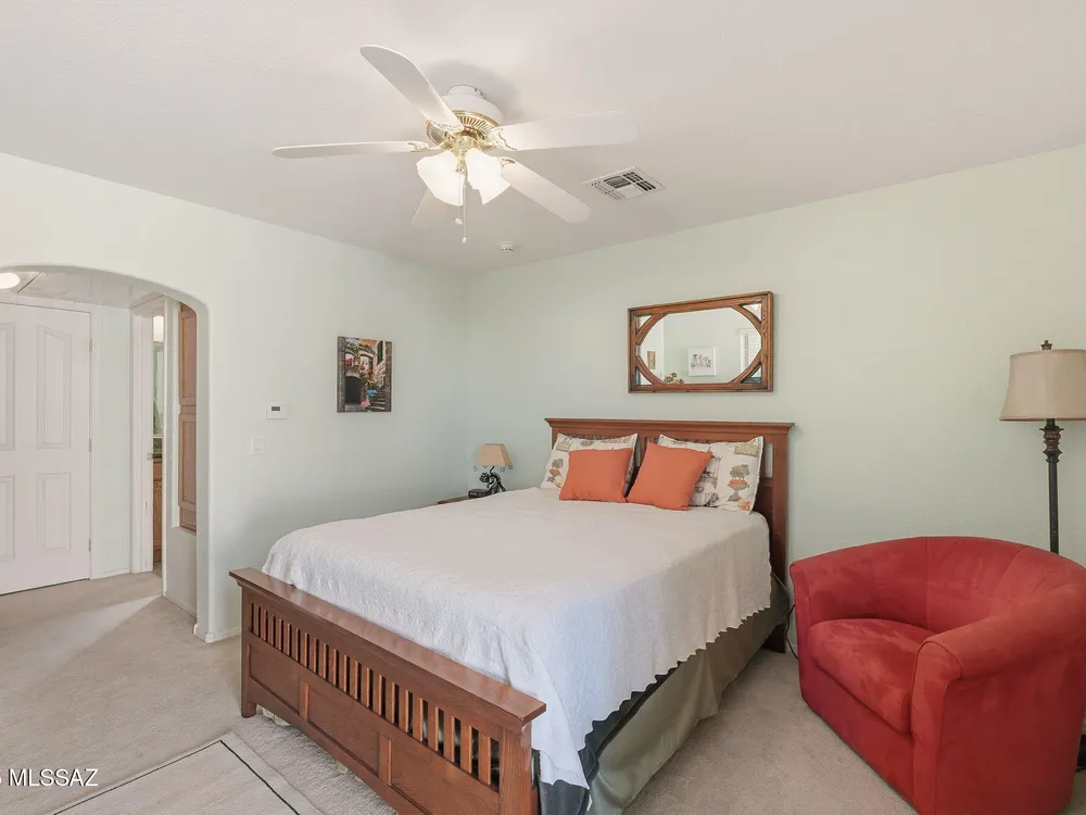 This stunning home in the sought-after Quail Creek community truly has it all! A charming brick paver courtyard welcomes you through a decorative wrought iron gate, where you'll discover a full guest casita and a cozy seating area--perfect for enjoying your morning coffee in peace.Step inside to an open-concept floor plan with soaring ceilings and tasteful updates throughout. The beautifully appointed kitchen features solid surface countertops, custom pull-out drawers, a stylish tile backsplash, breakfast bar, and sunny breakfast nook--ideal for both everyday living and entertaining.The spacious primary suite offers wood-look ceramic tile flooring, a beautifully updated bathroom, a large walk-in closet, and a handsome barnwood-style sliding door for added privacy.