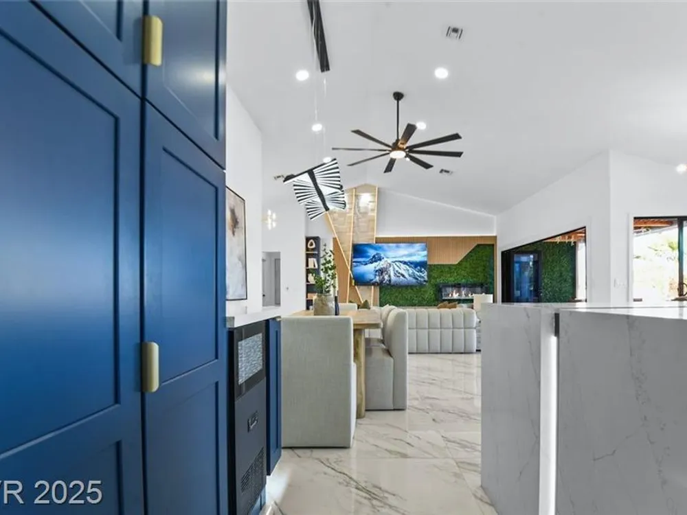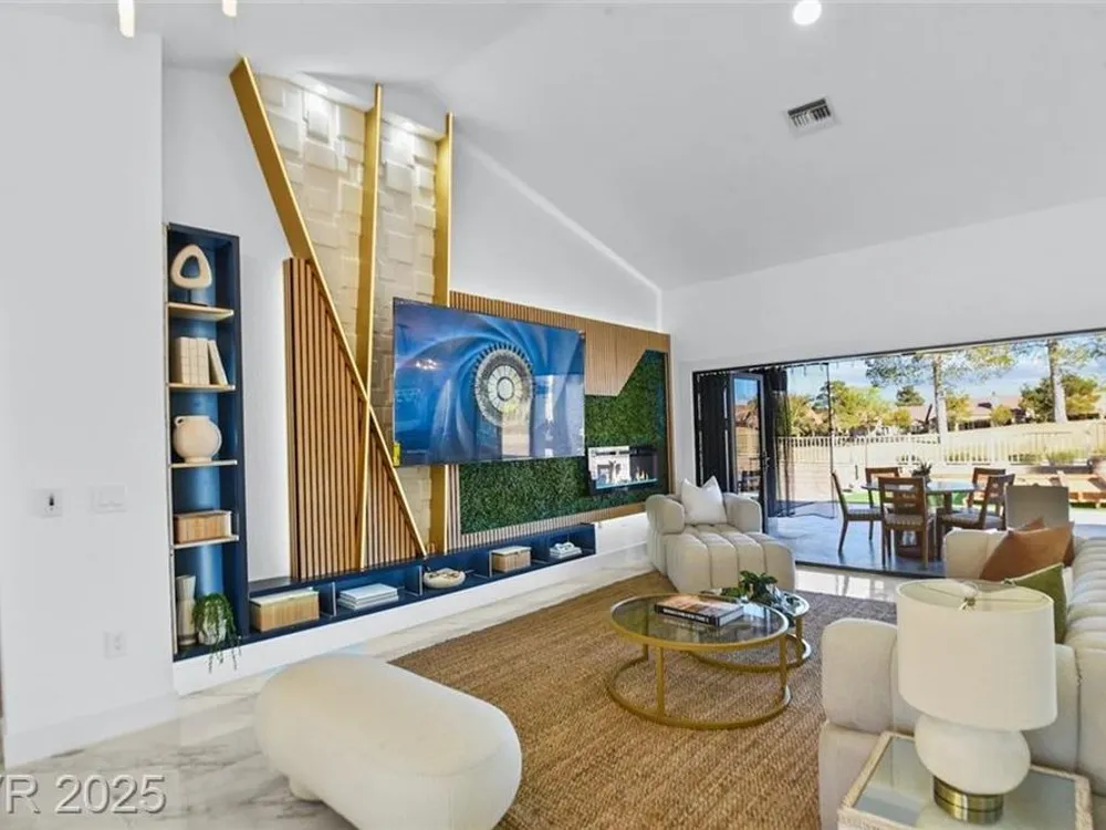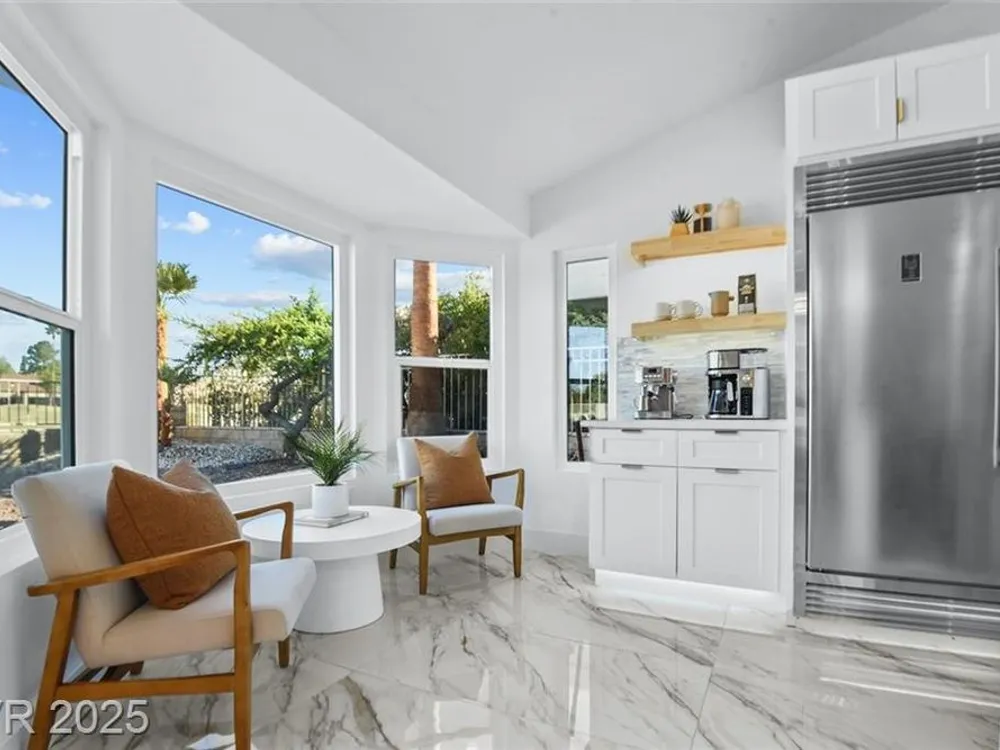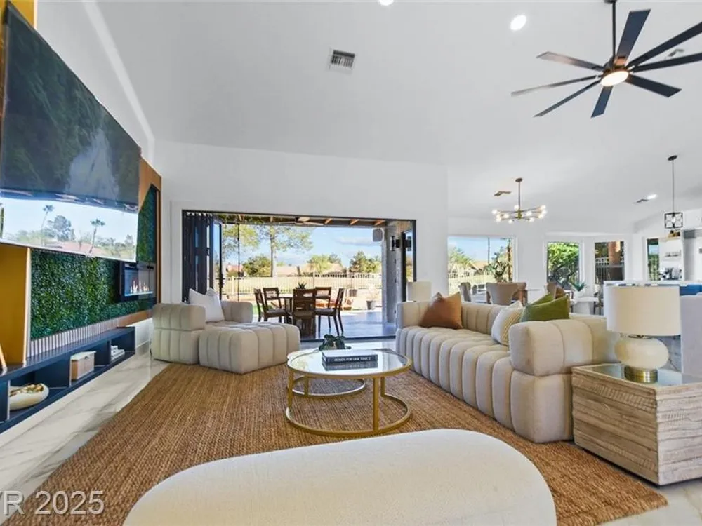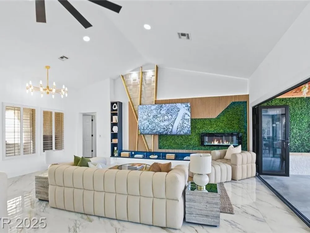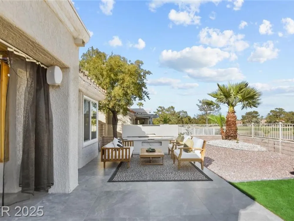 Boxwood on Golfside Dr by Michael Mair Luxury is a one-of-a-kind, fully custom 2 bed, 2 bath modern remodel on the Palm Valley Golf Course in Sun City Summerlin. Designed over 9 months with high-end finishes, this 1,653 sq ft home features porcelain tile flooring, designer lighting, new windows, and an open layout made for entertaining. The custom entertainment wall includes acoustic wood paneling, 85” TV, electric fireplace, floating shelves, and LED lighting. The chef’s kitchen boasts luxury appliances, walk-thru pantry, multifunction sink, reverse osmosis, and in-cabinet lighting. Spa-like primary bath with floating double vanity, deep soaking tub, black river rock, and LED accents. Golf course patio includes a fire/waterfall feature, artificial turf, boxwood privacy wall, and shaded west-facing exposure. 2-car garage with golf cart space and silent opener. Truly a standout in design and function. You won't find another home like it!