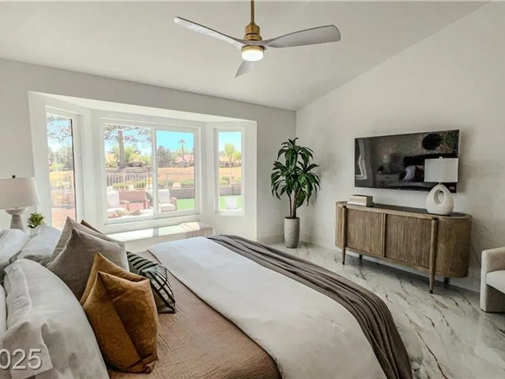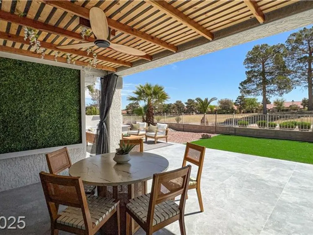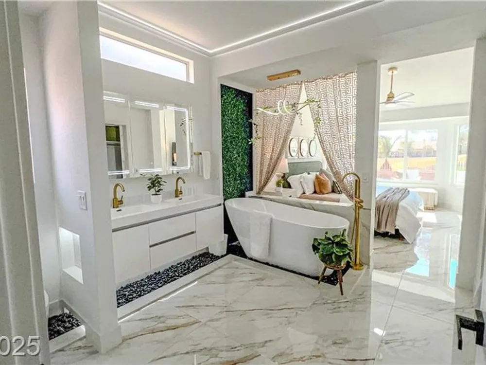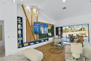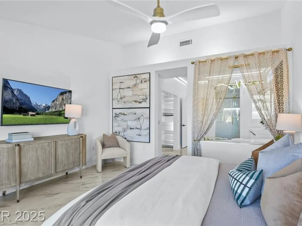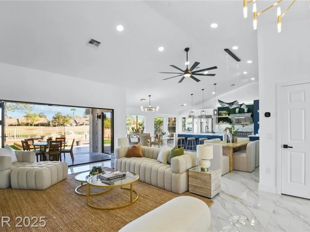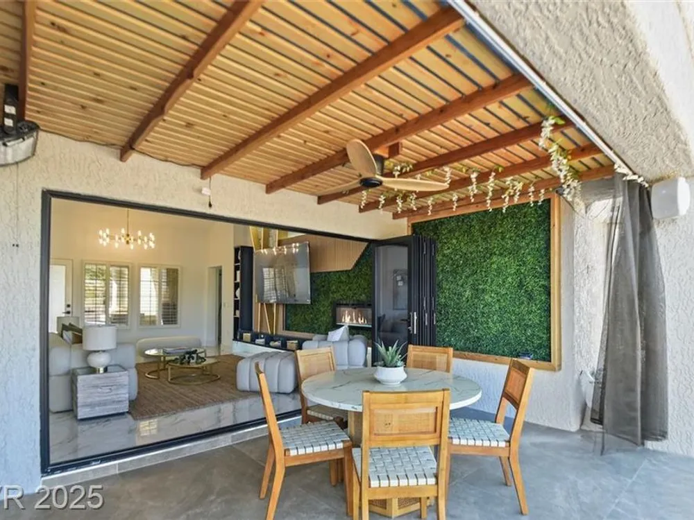 Boxwood on Golfside Dr by Michael Mair Luxury is a one-of-a-kind, fully custom 2 bed, 2 bath modern remodel on the Palm Valley Golf Course in Sun City Summerlin. Designed over 9 months with high-end finishes, this 1,653 sq ft home features porcelain tile flooring, designer lighting, new windows, and an open layout made for entertaining. The custom entertainment wall includes acoustic wood paneling, 85” TV, electric fireplace, floating shelves, and LED lighting. The chef’s kitchen boasts luxury appliances, walk-thru pantry, multifunction sink, reverse osmosis, and in-cabinet lighting. Spa-like primary bath with floating double vanity, deep soaking tub, black river rock, and LED accents. Golf course patio includes a fire/waterfall feature, artificial turf, boxwood privacy wall, and shaded west-facing exposure. 2-car garage with golf cart space and silent opener. Truly a standout in design and function. You won't find another home like it!