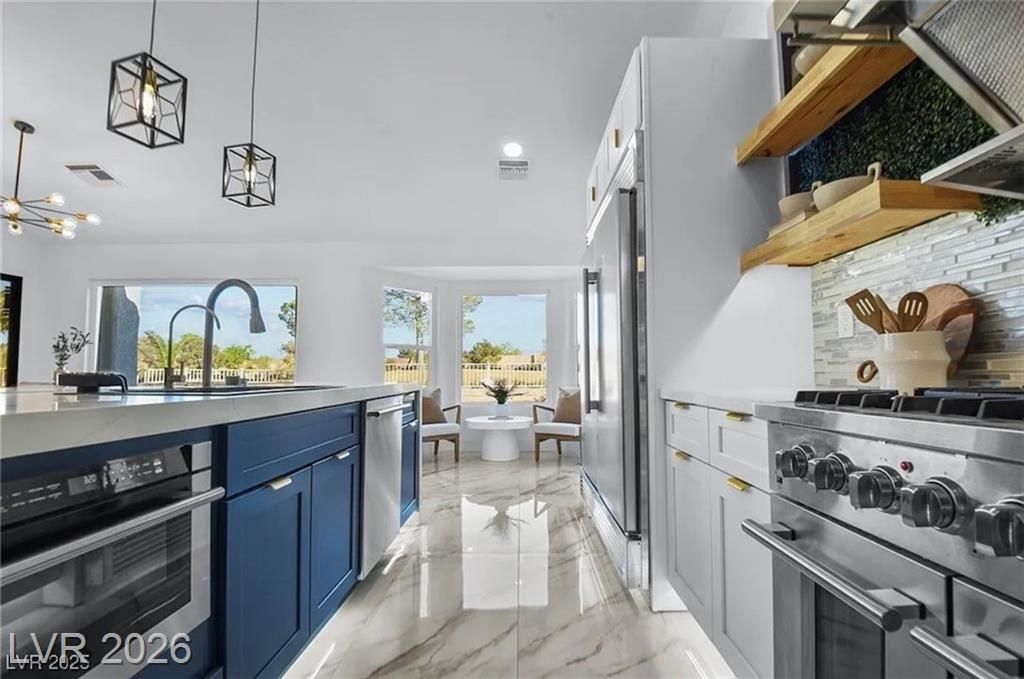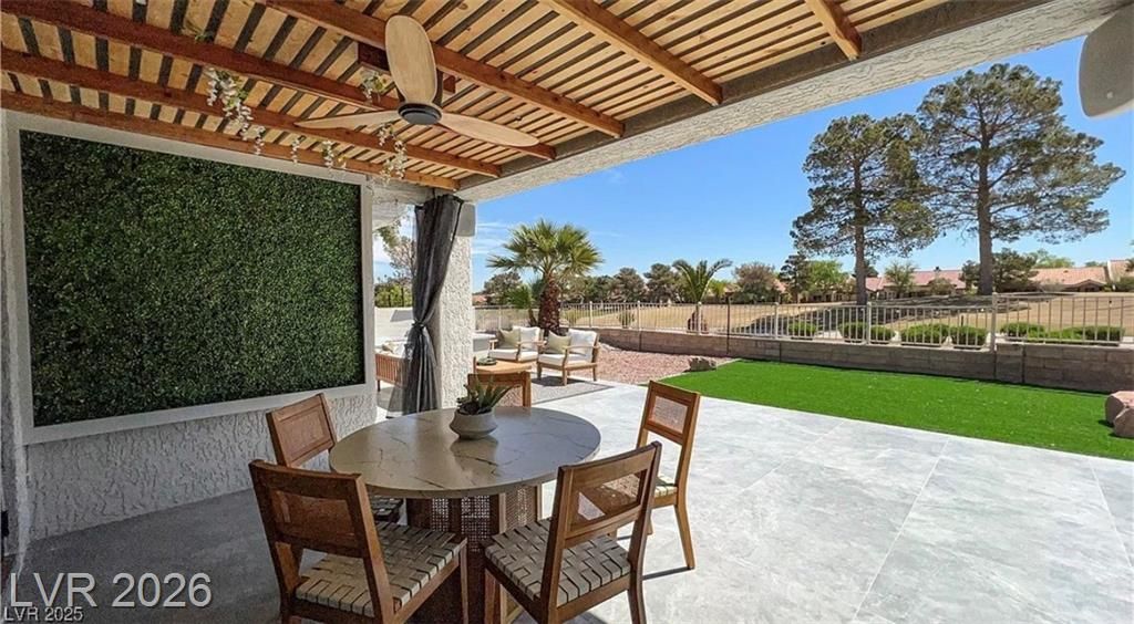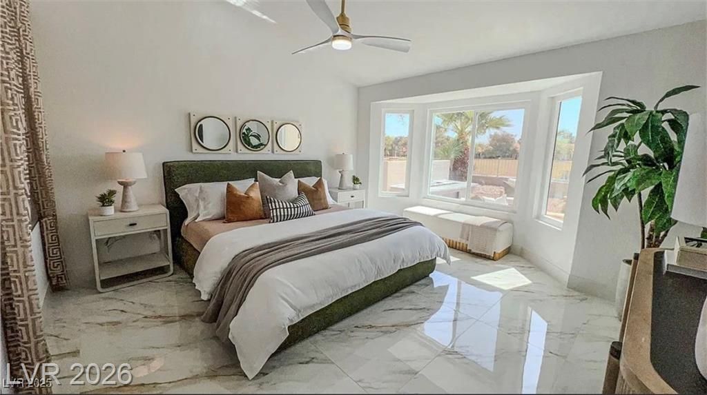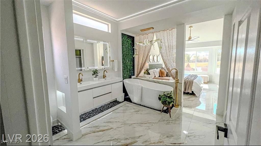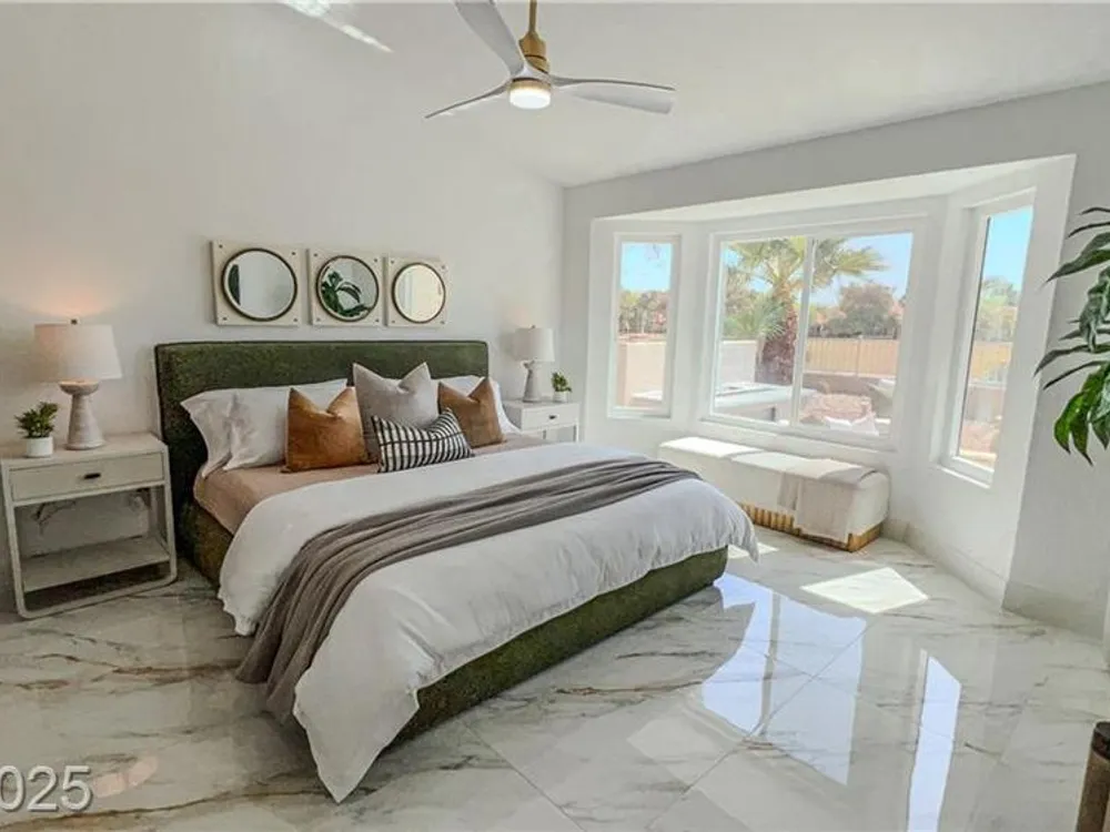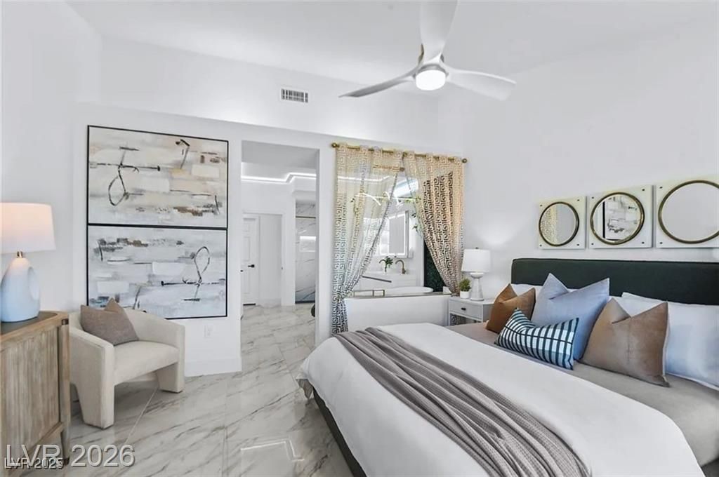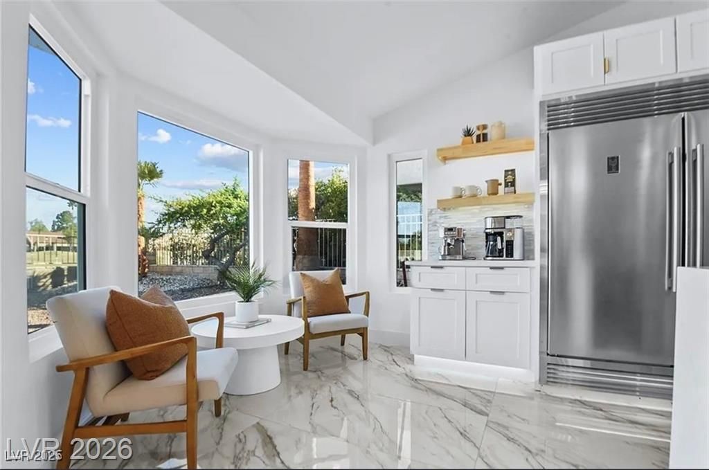 Boxwood on Golfside Dr by Michael Mair Luxury is a one-of-a-kind, fully custom 2 bed, 2 bath modern remodel on the Palm Valley Golf Course in Sun City Summerlin. Designed over 9 months with high-end finishes, this 1,653 sq ft home features porcelain tile flooring, designer lighting, new windows, and an open layout made for entertaining. The custom entertainment wall includes acoustic wood paneling, 85” TV, electric fireplace, floating shelves, and LED lighting. The chef’s kitchen boasts luxury appliances, walk-thru pantry, multifunction sink, reverse osmosis, and in-cabinet lighting. Spa-like primary bath with floating double vanity, deep soaking tub, black river rock, and LED accents. Golf course patio includes a fire/waterfall feature, artificial turf, boxwood privacy wall, and shaded west-facing exposure. 2-car garage with golf cart space and silent opener. Truly a standout in design and function. You won't find another home like it!