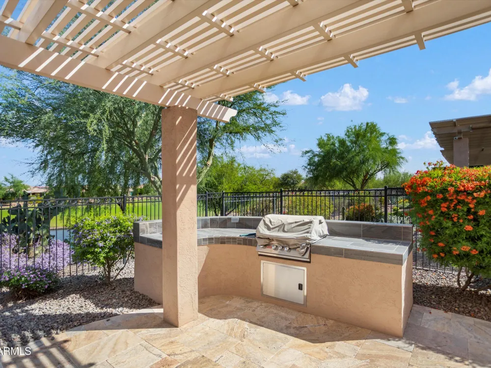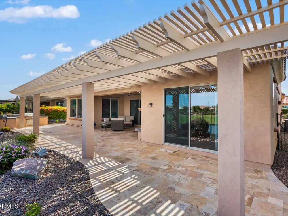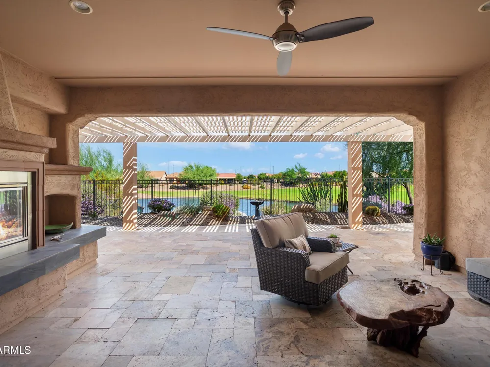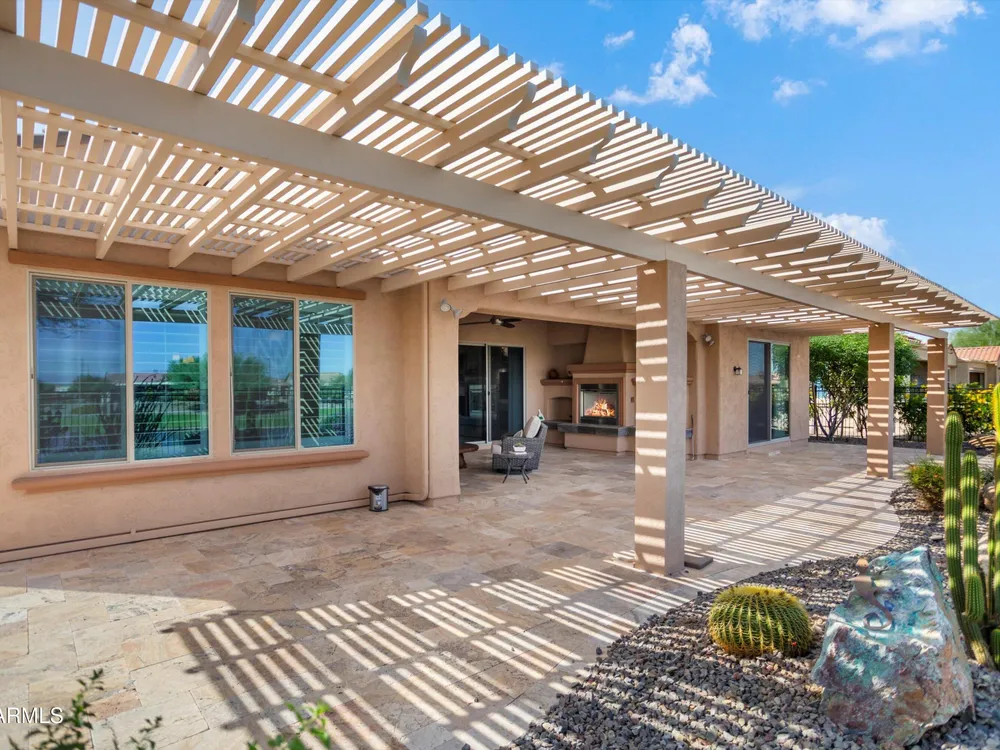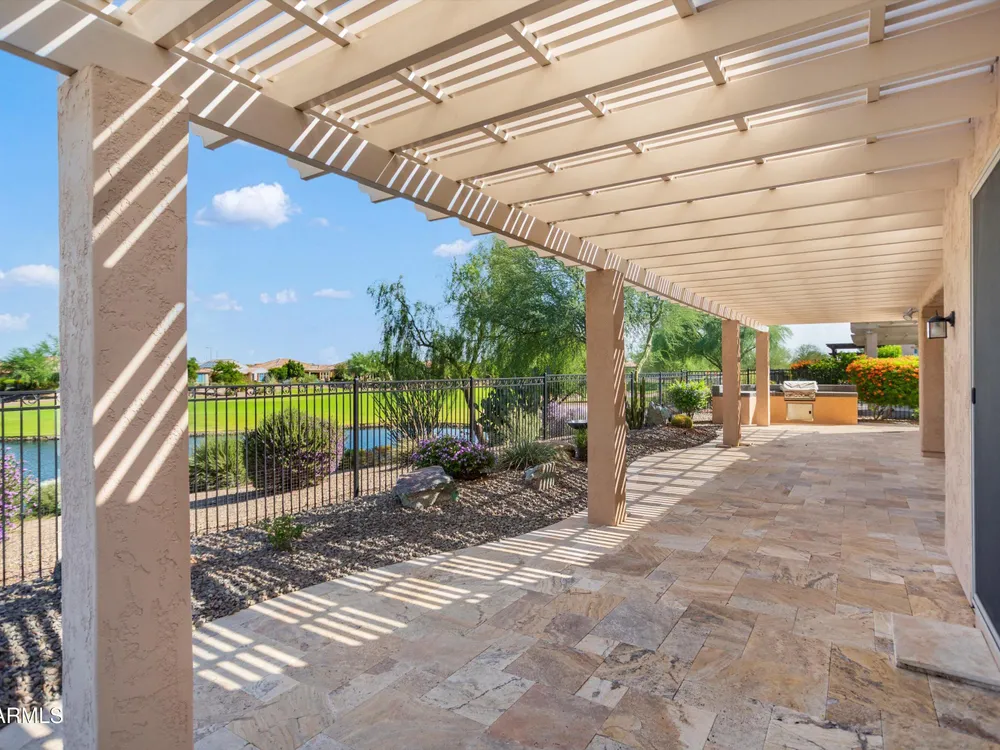 Golf Course Endeavor with Cart Garage! Travertine steps lead to a gated courtyard. Tile & MFG Wood floors, + Plantation Shutters throughout. Great Room media wall w\fireplace & center sliding door. Kitchen features granite counters & backsplash, an additional wall of cabinets & counter space with a built-in beverage fridge, electric cooktop, pull-out shelves, island, pendant lights, dining area, Butler's Pantry area, & walk-in pantry. Owner's Suite w\sliding door to patio, dual granite vanities, walk-in tile & glass rain shower w\seat, & walk-in closet. Laundry w\lots of cabinets! Guest Room with ensuite bath! Ext garage w\cabinets, workbench, sink, & softener. Fenced backyard overlooking a pond & golf course, with ext travertine patio, Pergola, fireplace, & built-in BBQ area! Must See!
