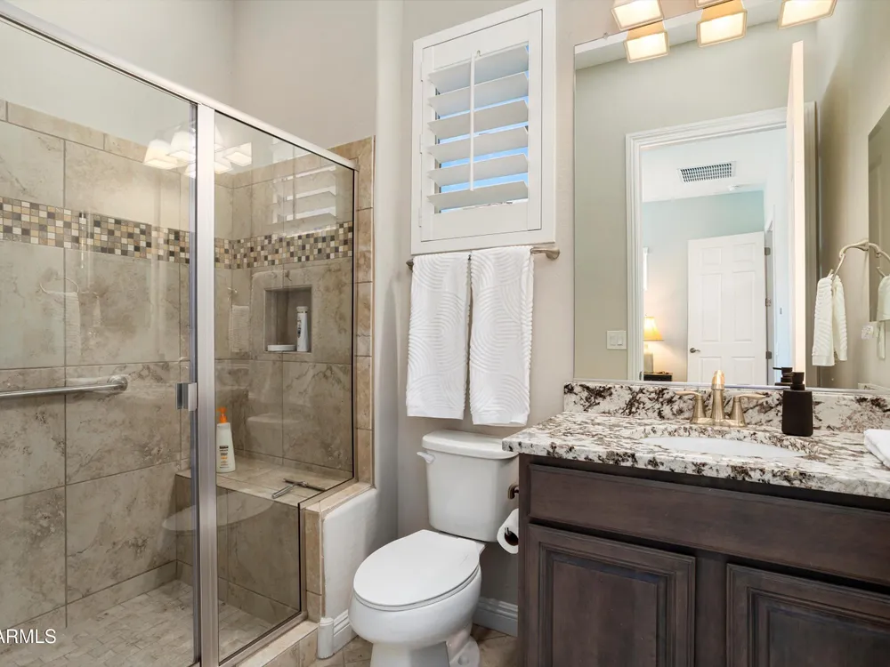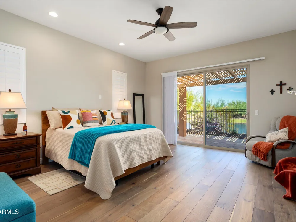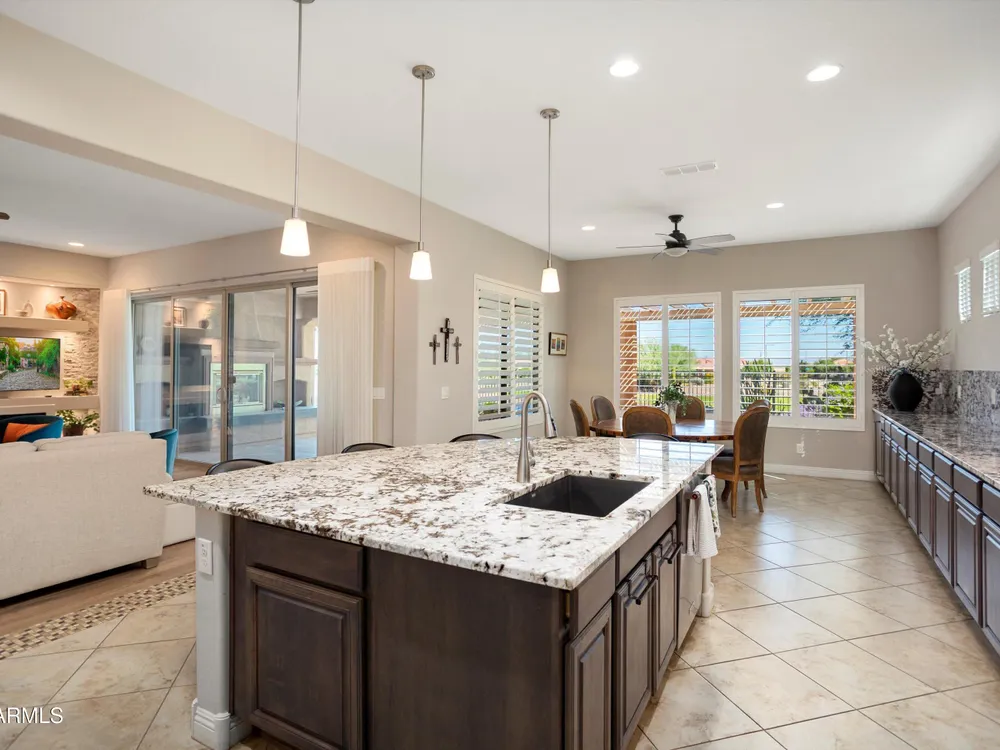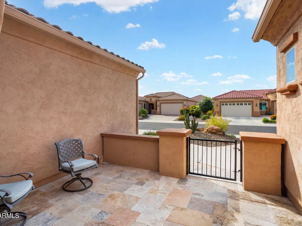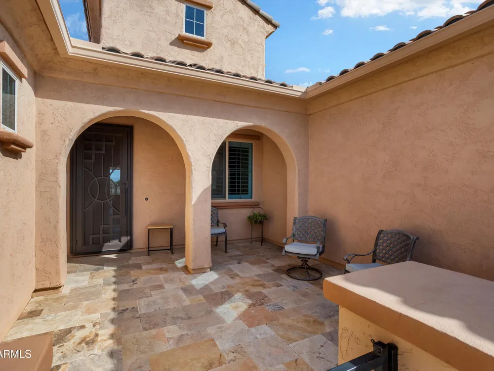 Golf Course Endeavor with Cart Garage! Travertine steps lead to a gated courtyard. Tile & MFG Wood floors, + Plantation Shutters throughout. Great Room media wall w\fireplace & center sliding door. Kitchen features granite counters & backsplash, an additional wall of cabinets & counter space with a built-in beverage fridge, electric cooktop, pull-out shelves, island, pendant lights, dining area, Butler's Pantry area, & walk-in pantry. Owner's Suite w\sliding door to patio, dual granite vanities, walk-in tile & glass rain shower w\seat, & walk-in closet. Laundry w\lots of cabinets! Guest Room with ensuite bath! Ext garage w\cabinets, workbench, sink, & softener. Fenced backyard overlooking a pond & golf course, with ext travertine patio, Pergola, fireplace, & built-in BBQ area! Must See!