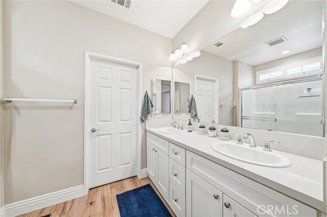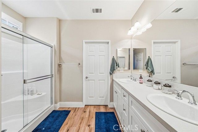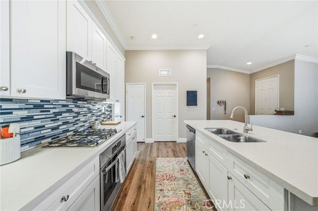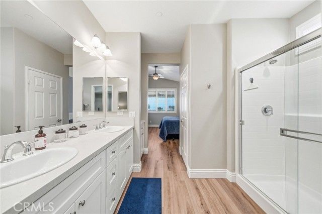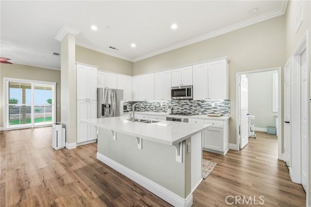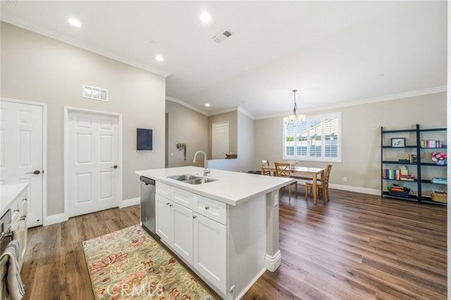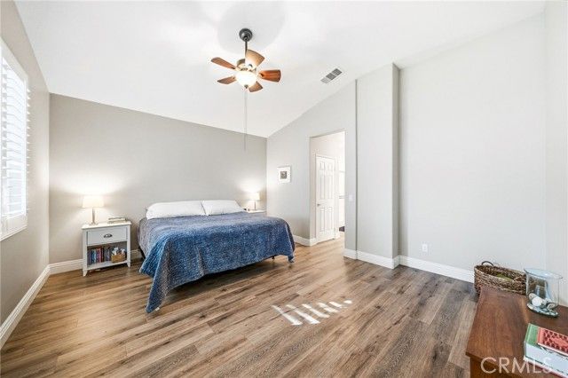 Welcome to this turnkey residence on a prime cul-de-sac location! 26535 Rim Creek Pathway is a truly gorgeous 3-bedroom, 2-bathroom single-family home located on a prime cul-de-sac in a desirable Menifee community. This home is packed with high-end upgrades, making it fully turnkey. Interior features include vinyl flooring throughout, shutters on all windows, crown molding, upgraded baseboards, and ceiling fans in every room. The kitchen and bathrooms boast quartz countertops and soft-closing drawers. Kitchen also includes a custom backsplash, stainless steel appliances, and pull-out lower shelves in the kitchen/pantry. The third bedroom features built-in desk and cabinets. When it comes to utility and efficiency, it is equipped with a Tankless Water Heater and a Quiet Cool Whole House Fan. The inside laundry room includes a sink for your convenience. Outside is a backyard featuring an Alumawood patio cover with ceiling fans and gutters. HOA amenities include a Swimming Pool, Spa, Exercise Room, BBQ area, and Tennis/Pickleball Court. Conveniently located near schools, shopping, and commuter access, this home truly represents the pinnacle of upgraded, comfortable living in a prime Menifee location. This is the complete package. Don't let this opportunity to secure your fully upgraded dream home pass you by! Schedule your showing today!