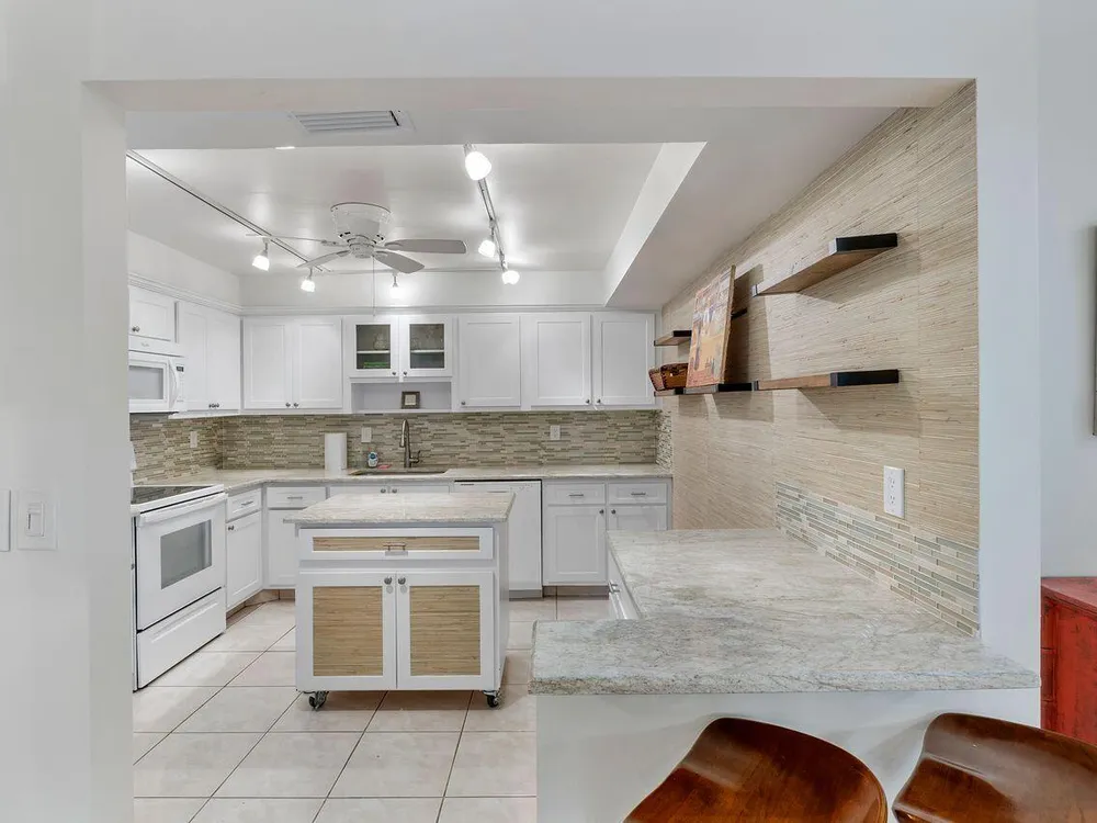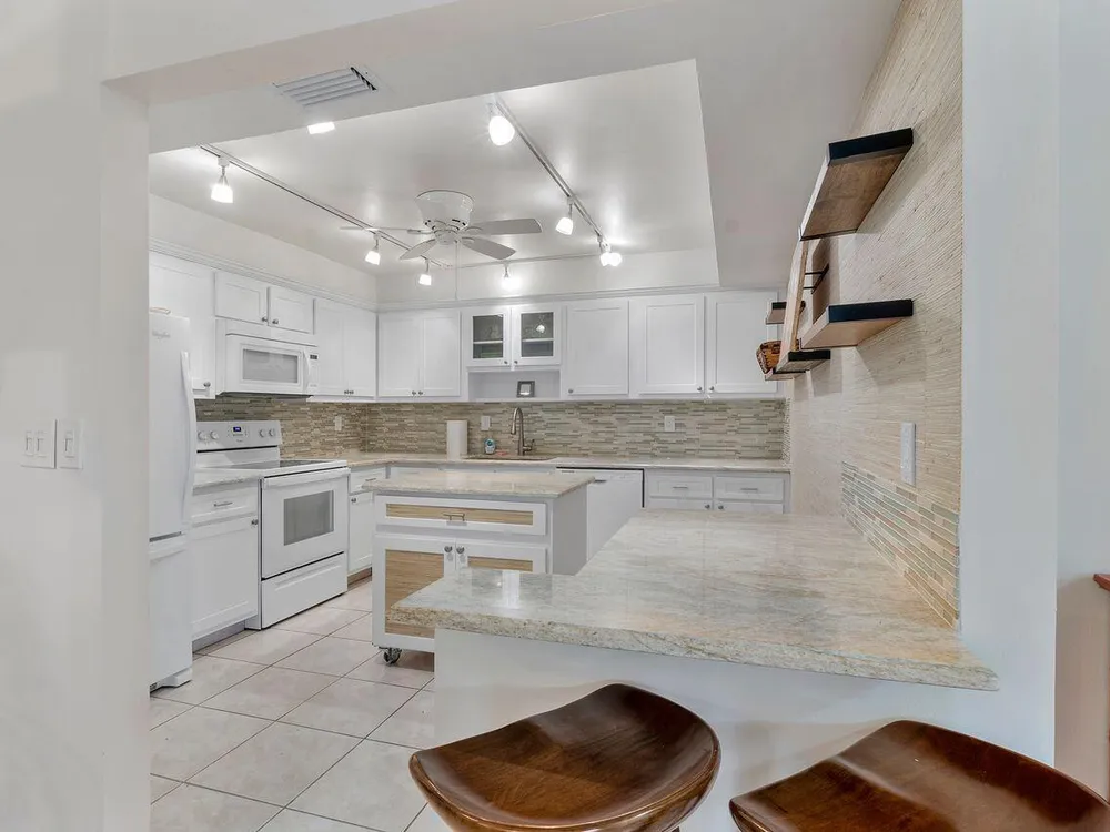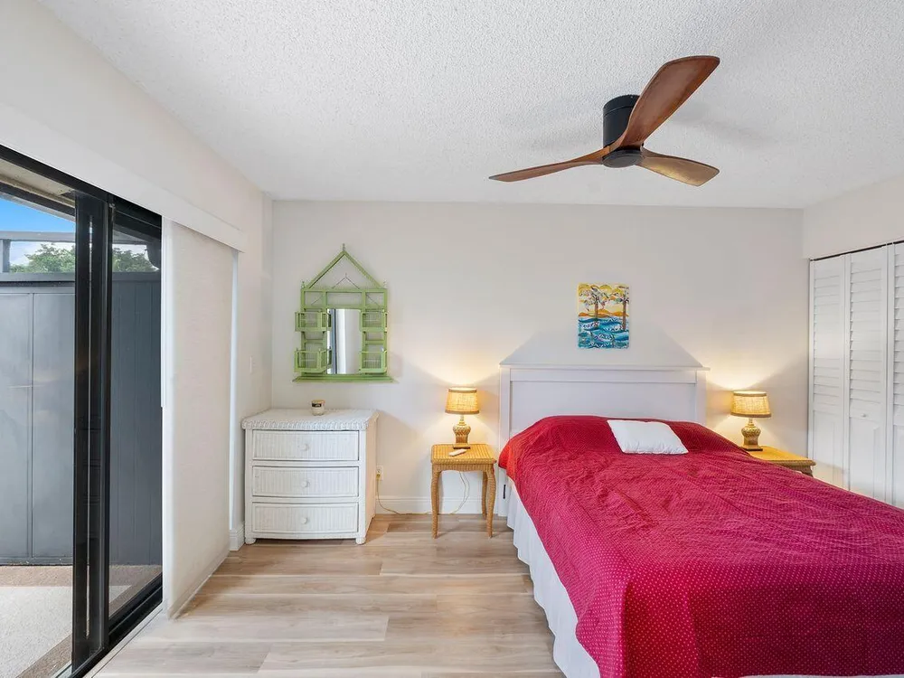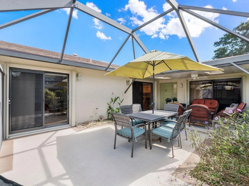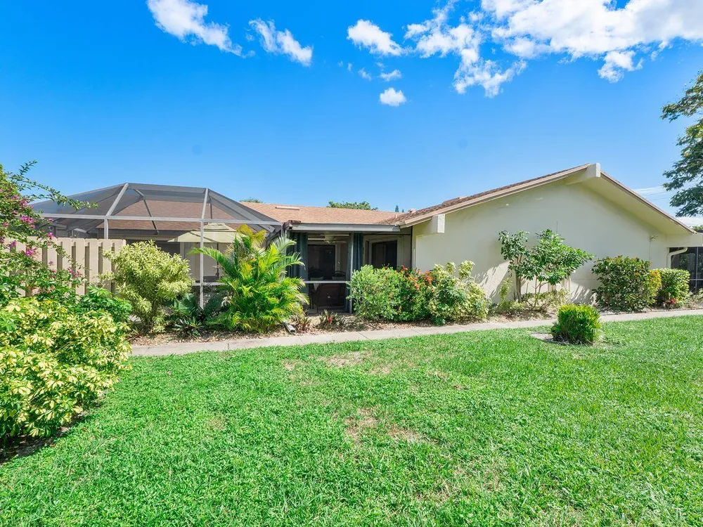 This beautifully renovated 2 BR 2 BA villa is located in gated Rainberry Bay, a 55+ vibrant community with walking trails around the central lake. Some great features include an updated kitchen w/ white wood Shaker cabinetry, granite countertops, white appliances, updated bathrooms, stack washer/dryer, newer electric panel & a beautiful screened patio w/ both a shaded & open sunny area. This light, bright villa is close to the area pool & the main clubhouse with all the amenities is just steps away. Rainberry Bay offers tons of activities for your Florida lifestyle including a gym, 5 pools, tennis, pickleball, bocce ball & a large free standing theater. Centrally located west of Congress Ave., it's a short drive to downtown Delray Atlantic Ave. shops, restaurants and beaches.