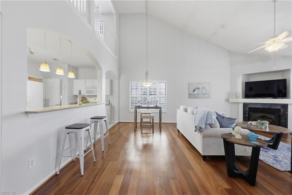 Welcome to one of Virginia Beach's premier 55+ communities. This well maintained 3 bedroom, 2 bath home features a desirable first floor primary suite. The bright and open floor plan showcases soaring cathedral ceilings, a cozy gas fireplace, and a spacious layout great for everyday living and entertaining. The primary suite includes a fully renovated bathroom with modern finishes. Upstairs offers a versatile loft overlooking the main living area, good for guests, a home office, or hobbies. Enjoy relaxing on your private deck. Additional highlights include a roof replaced in 2022, all conveniently located near shopping, dining, and community amenities including a pool and clubhouse, offering comfort and low maintenance living in a sought after neighborhood.
