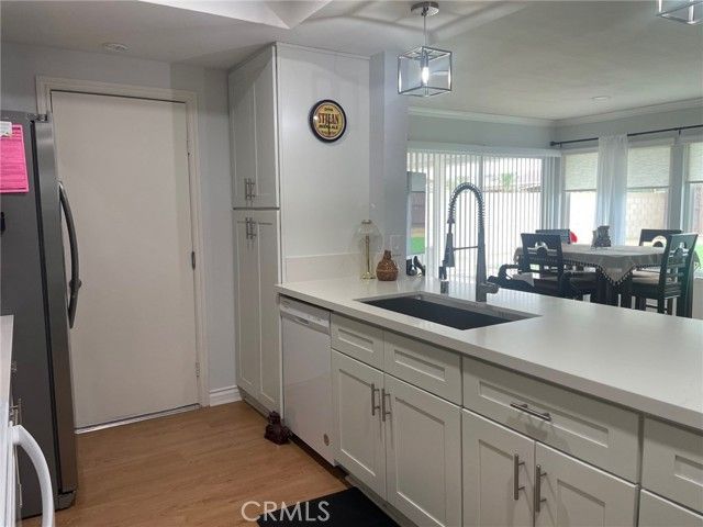 Welcome to easy, elegant living in this beautifully remodeled single-story home located in a desirable 55+ senior community. Designed for comfort, convenience, and efficiency, this move-in ready residence offers modern upgrades and spacious living areas perfect for relaxing or entertaining. Step inside to find attractive laminate flooring and dual-paned windows throughout, creating a bright and energy-efficient environment. The thoughtfully updated kitchen features crisp white shaker cabinetry, sleek quartz countertops, a large stainless steel sink, and ample prep space-ideal for everyday cooking and hosting family and friends. The home offers both a formal living room and a separate family room, providing flexible space to suit your lifestyle. The generously sized primary bedroom includes two closets and electronic window shades for added comfort and privacy. The secondary bedroom features a walk-in closet, making it perfect for guests or a home office. Both bathrooms have been tastefully remodeled with white shaker-style vanities, white countertops, and tile flooring, delivering a clean, timeless finish. Additional highlights include a direct-access two-car garage for convenience and storage, as well as an expansive backyard designed for low-maintenance enjoyment. The backyard