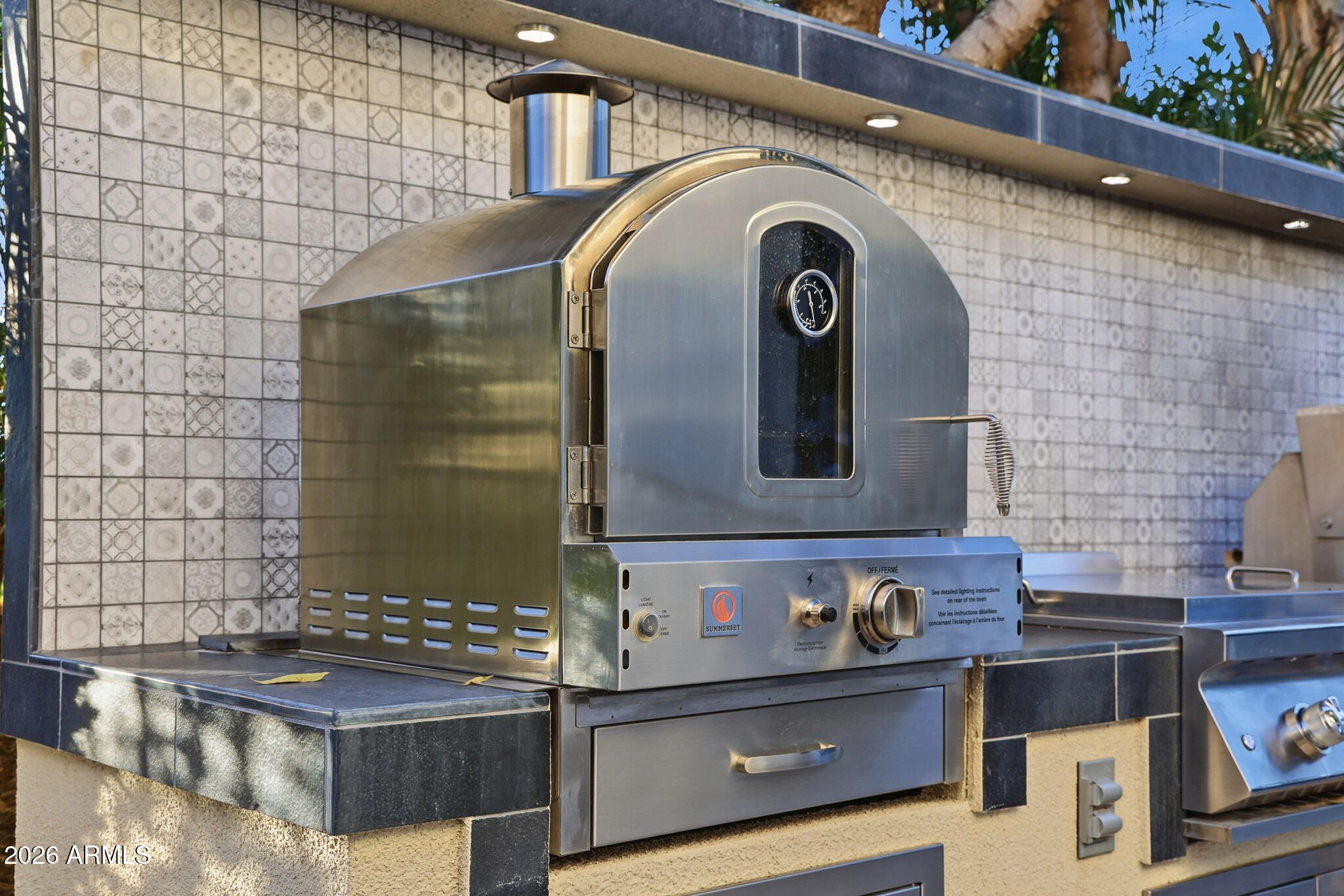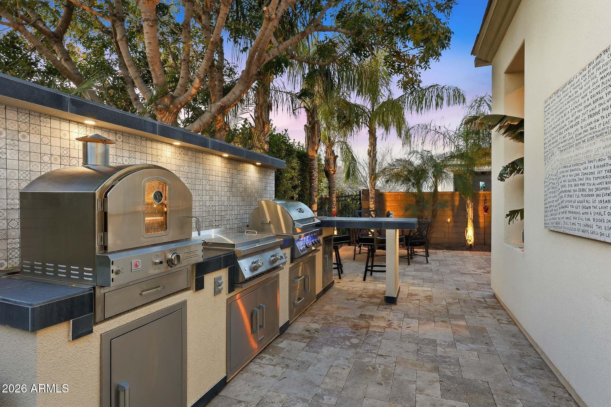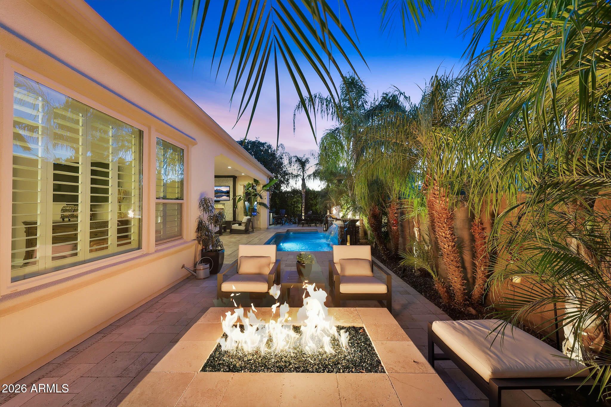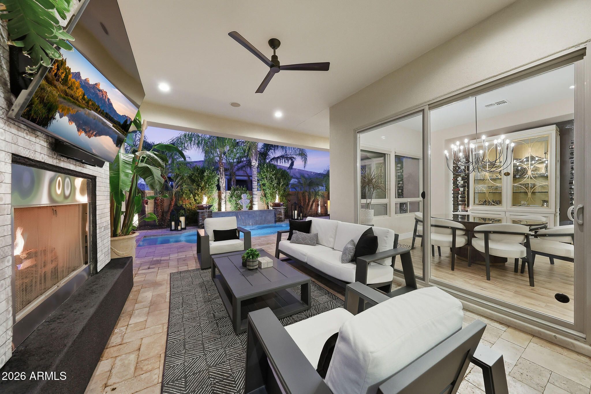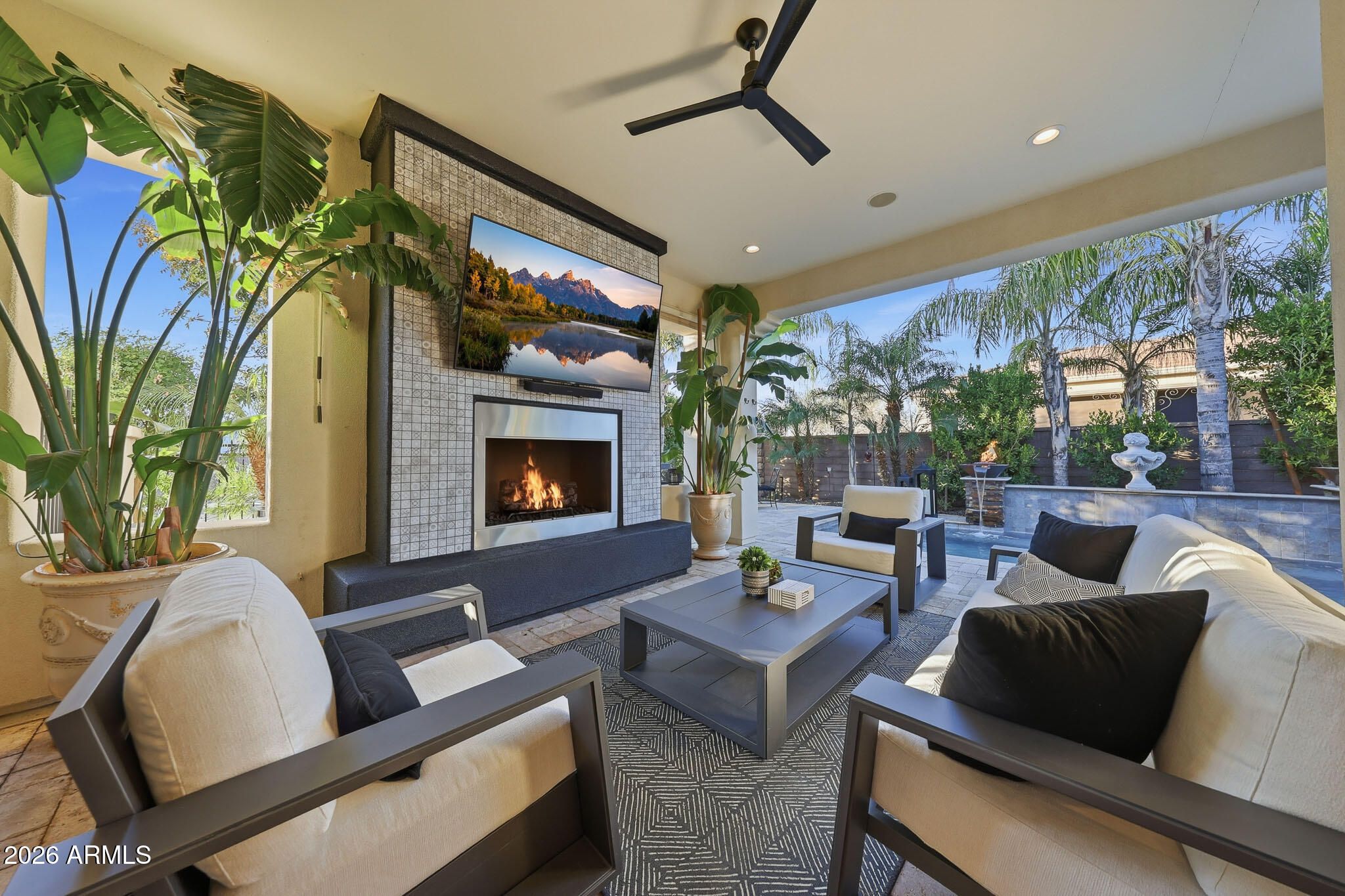 Welcome to this expansive corner-lot home featuring a heated and jetted spool with fire bowls, perfect for resort-style living. This 2-bedroom, 2.5-bath home with a versatile den is located in the guard-gated Trilogy® at Encanterra, offering golf, pools, restaurants, spa, and stunning Superstition and San Tan Mountain views. The open floor plan includes high ceilings, tile flooring, plantation shutters, and surround sound. The chef's kitchen features gas cooking, granite counters, and an oversized island. Recent upgrades include flooring and primary bath remodel, outdoor kitchen & bar, landscape and irrigation upgrades, new HVAC, pool pump, and dishwasher. A covered patio with fireplace completes this exceptional retreat.