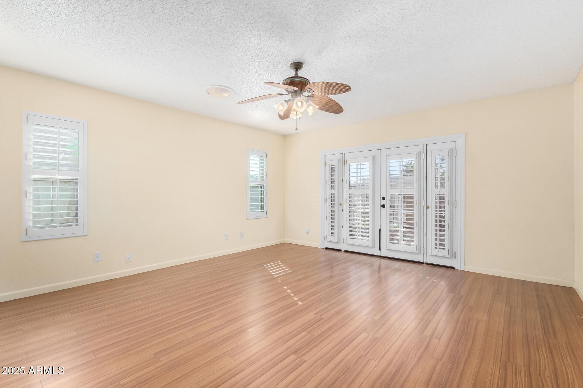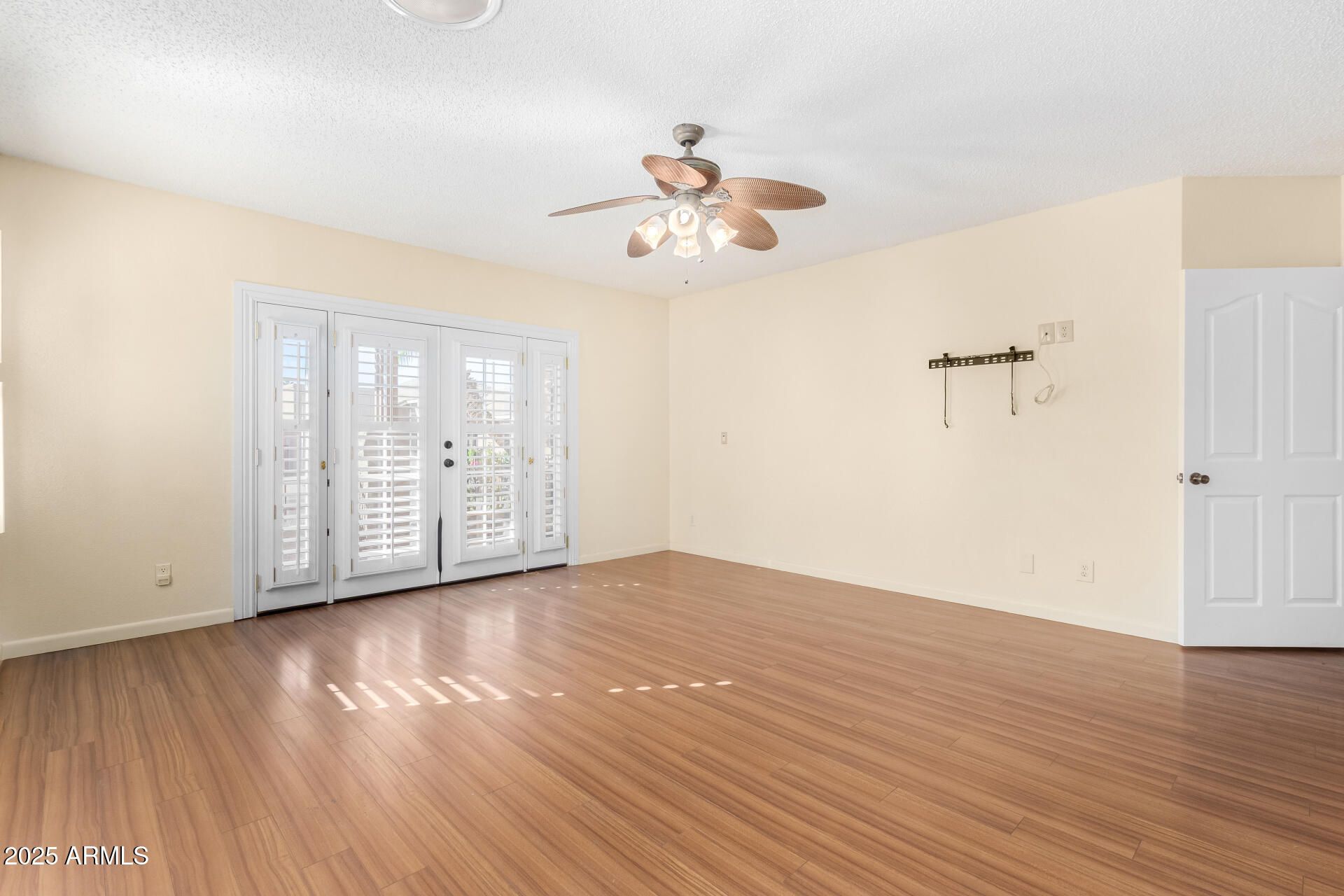 A MUST SEE! Located in the desired Cottonwood Active Adult Community, this beautiful home features 3 bedrooms in total, comprising of 2 Master bedrooms, one of which can be used as a Den, plus a third spacious bedroom. This wonderful home is located on a quiet cul-de-sac with a gorgeous sparkling pool! With great curb appeal. Enjoy the desert landscaping, 2-car garage, & a private oasis in the backyard. Nice floor plan inside. The interior design features an open layout enhanced by vaulted ceilings, new laminate flooring, new baseboards, freshly painted interior in the main living spaces, plantation shutters, a 2-sided gas fireplace, and a stylish wet bar. The living and dining area is the perfect place for entertaining friends and family. Don't miss out on the lovely kitchen that boast lots of cabinetry, granite counters, SS appliances, & a breakfast bar for casual dining, with plenty of space for a table. The large primary bedroom features French doors to the front patio, plus there is a spacious walk-in closet that has been finished for a well-organized space, an ensuite bathroom with dual vanities, and a large tiled shower with a glass door. The 2nd spacious master/Den includes a walk-in closet and shares the hallway bathroom. Laundry room is located inside. There is also a workshop in the garage with a sink. This exceptional home offers a unique blend of elegance and comfort, in one of the most desirable adult communities. The peaceful backyard oasis showcases a refreshing pool, generous open space for relaxing, & a covered patio w/extended sunshade. Don't miss out! This gem will not last long!