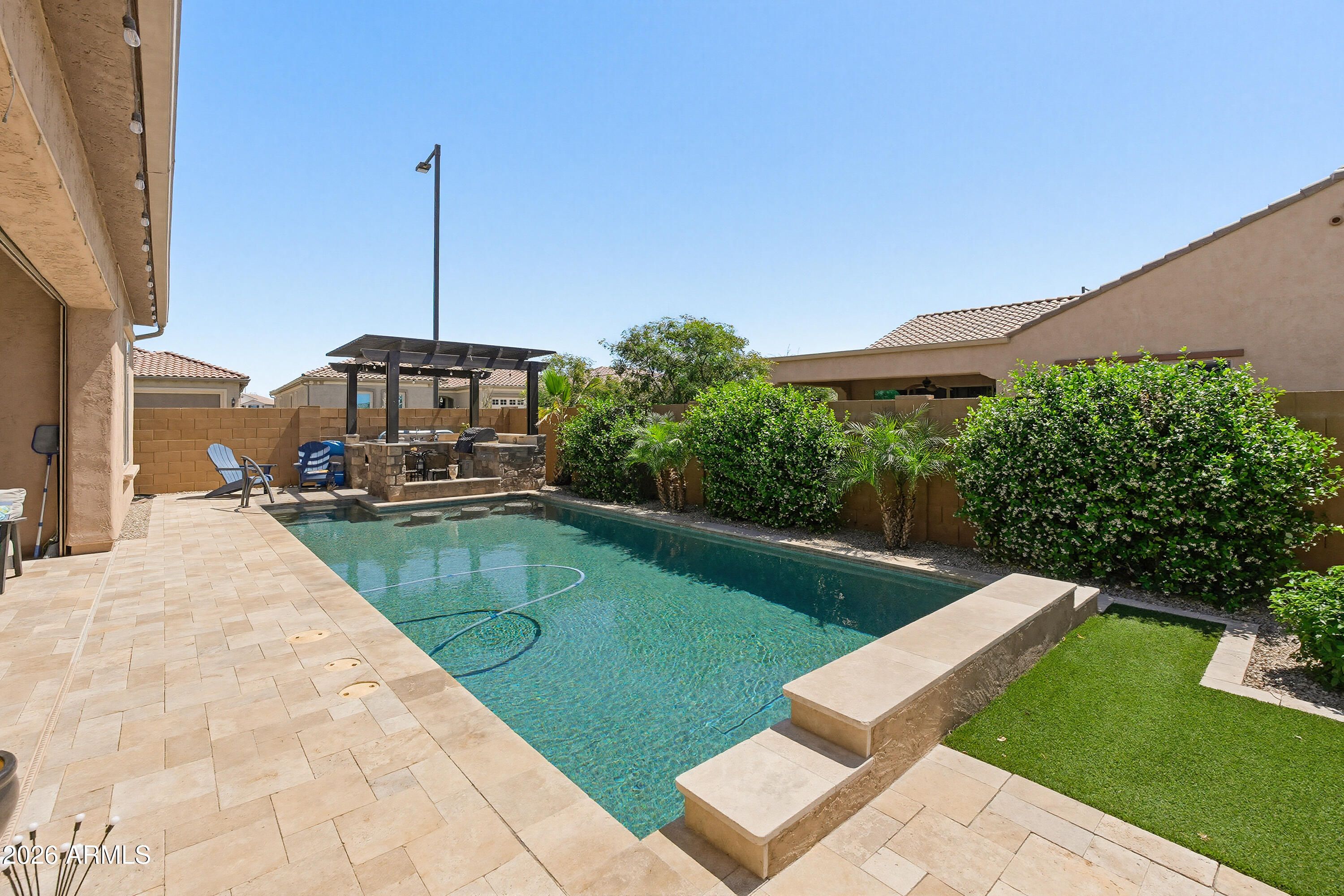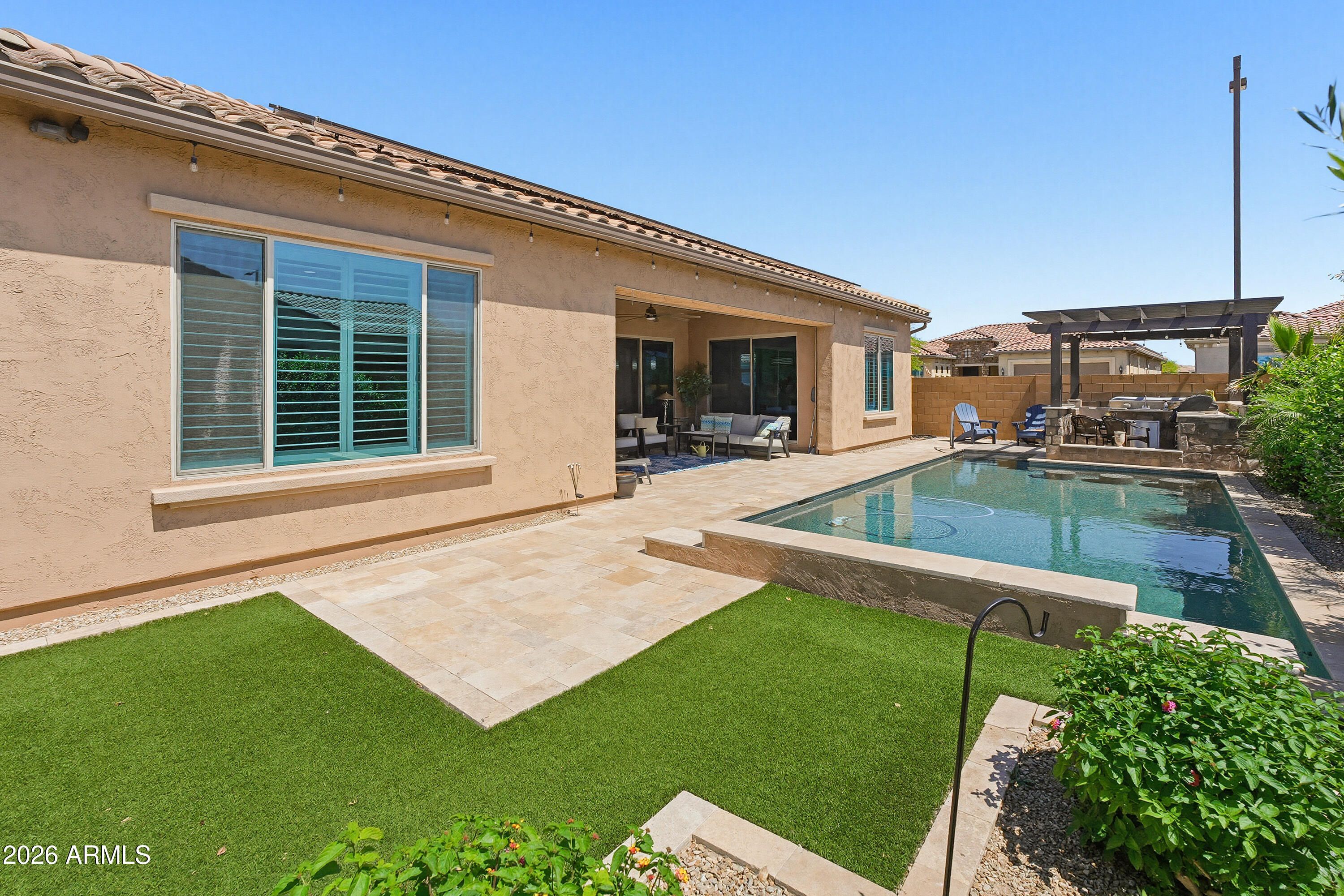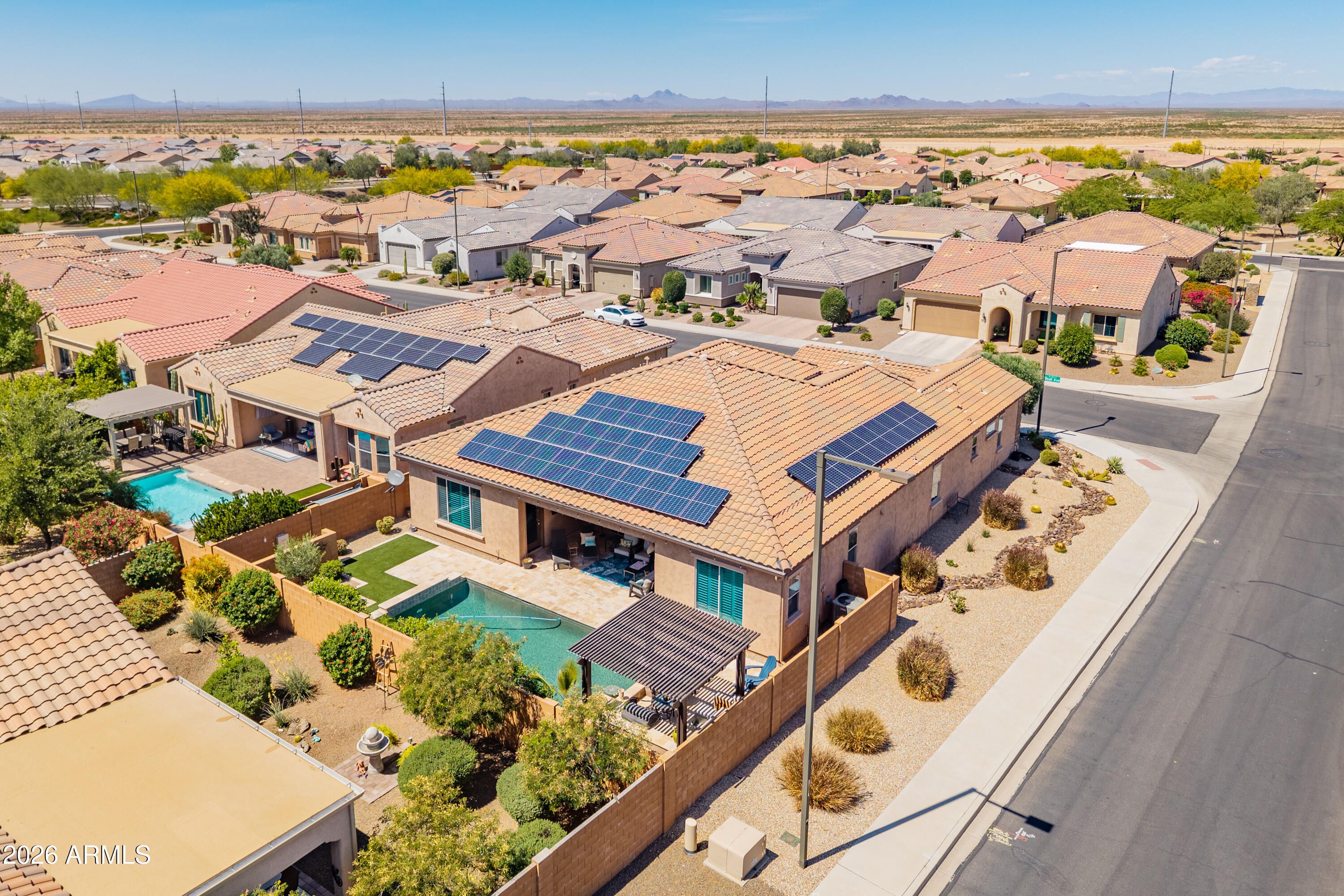 The Voyage plan w/ OWNED SOLAR--offering 3 bedrooms + den/office & 3.5 baths w/ a split layout that just makes sense--primary suite tucked away for privacy while both guest rooms feature their own en suite baths. Primary also includes a rare pass-through to the laundry room & separate his & her closets. Open kitchen/great room setup--gas cooktop, built-in oven/micro, quartz countertops & custom dry bar, all overlooking the great room w/ A/V wall, fireplace & dbl sliding gloss doors bringing the outside in. Backyard is the showpiece--sparkling pool, pergola-covered BBQ area, misting system & motorized shade screen at covered patio...set up right for Arizona living. Premium corner lot w/ a custom gated front courtyard. An epoxy 3-car garage w/ built-in storage cabinets...a diamond indeed!