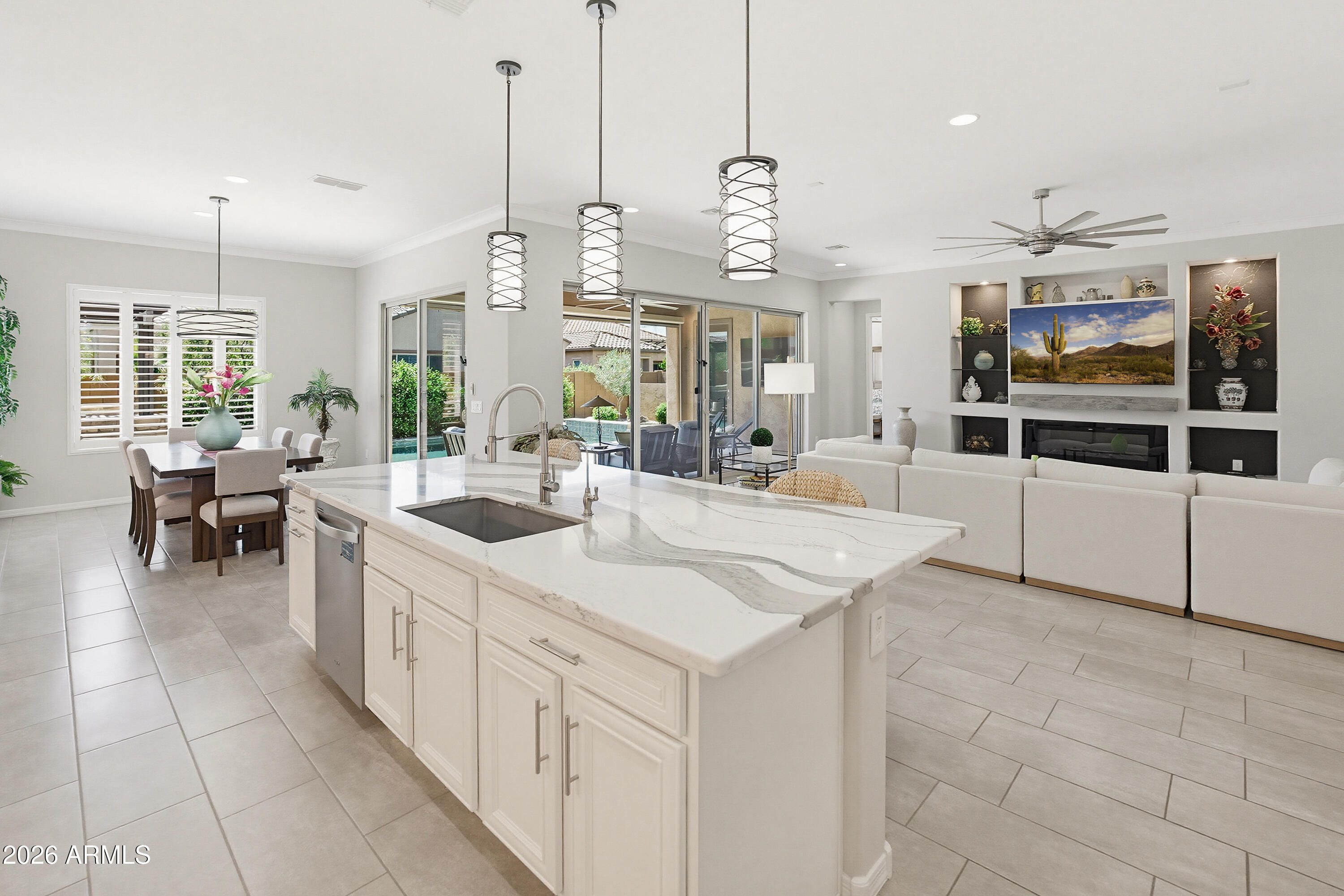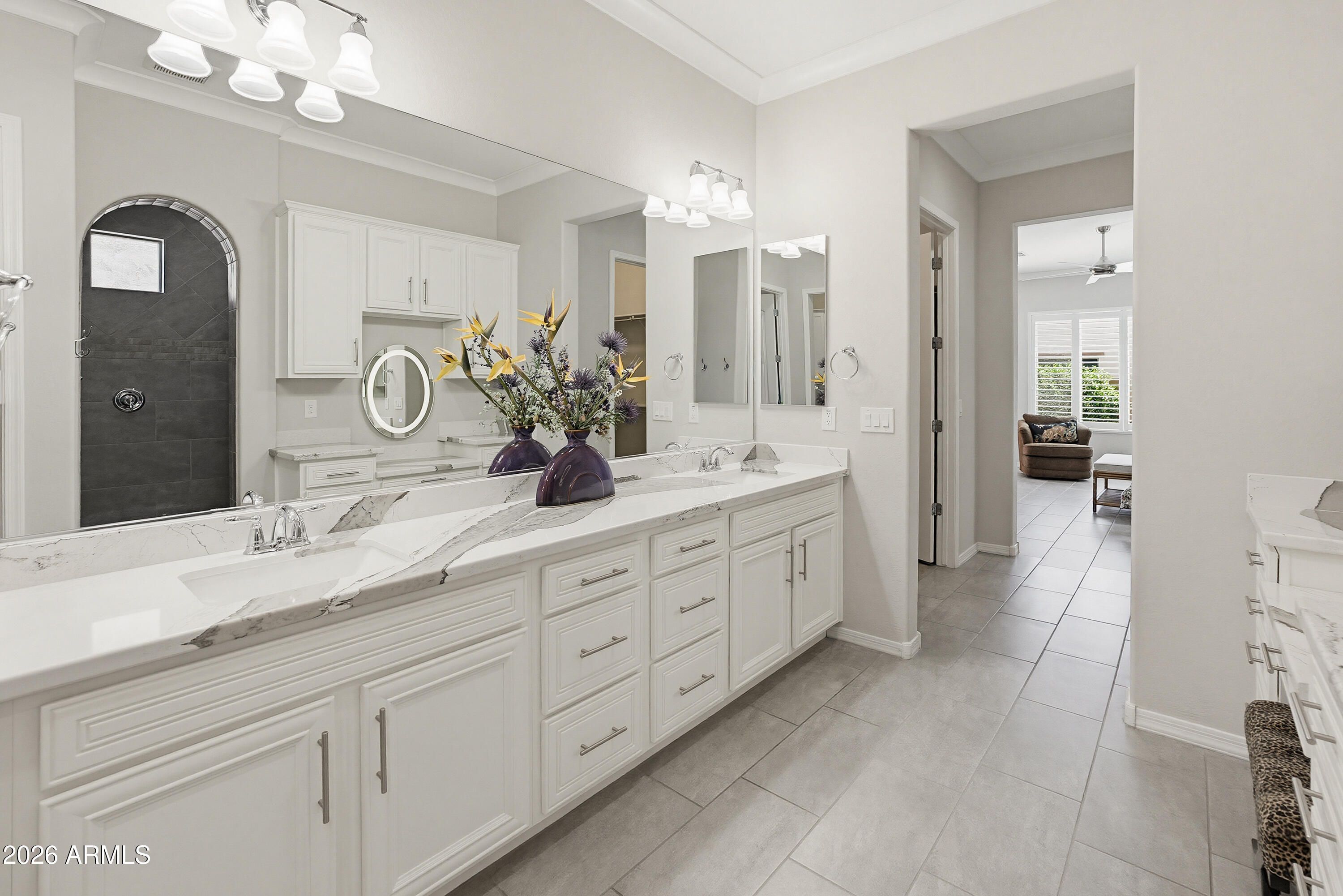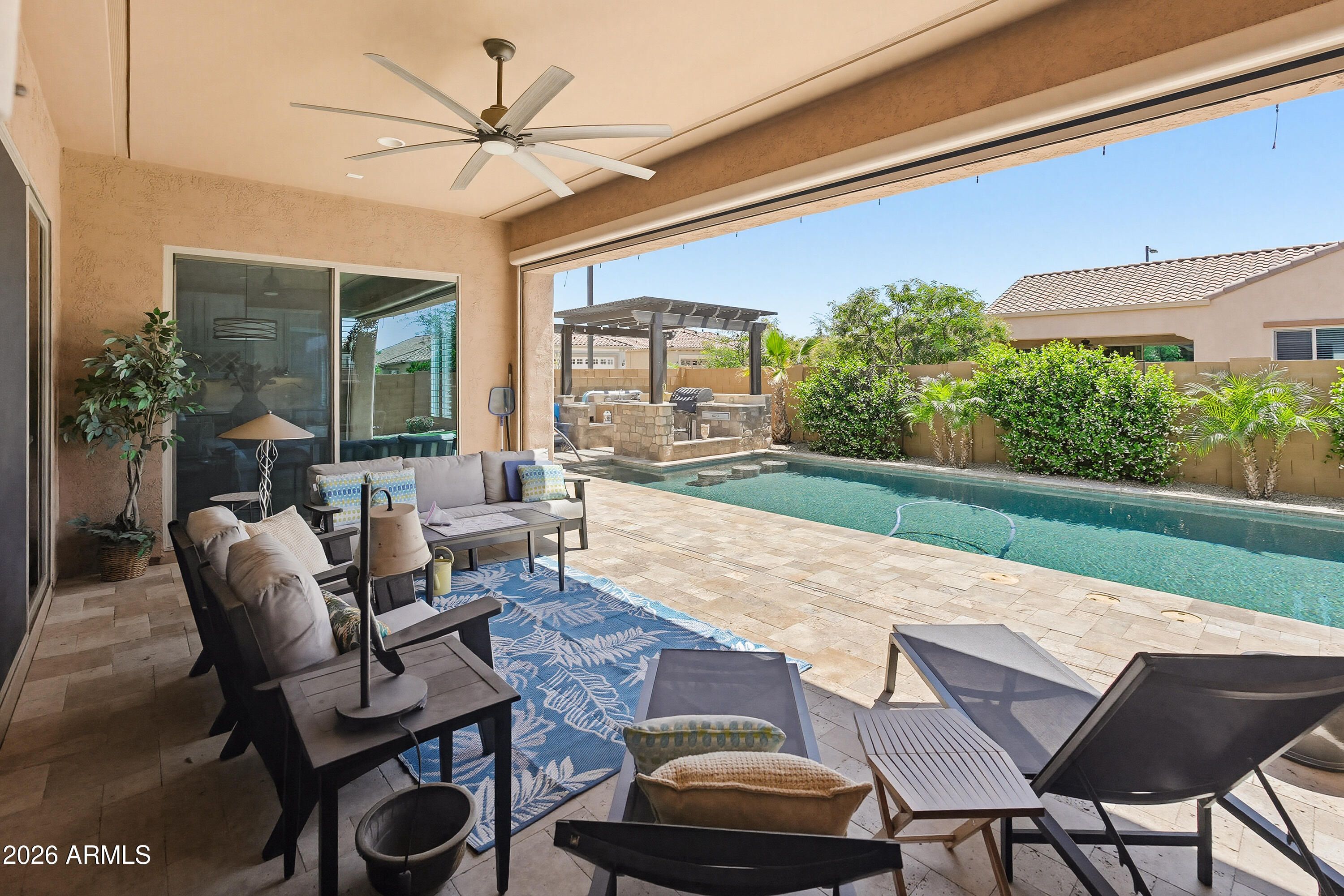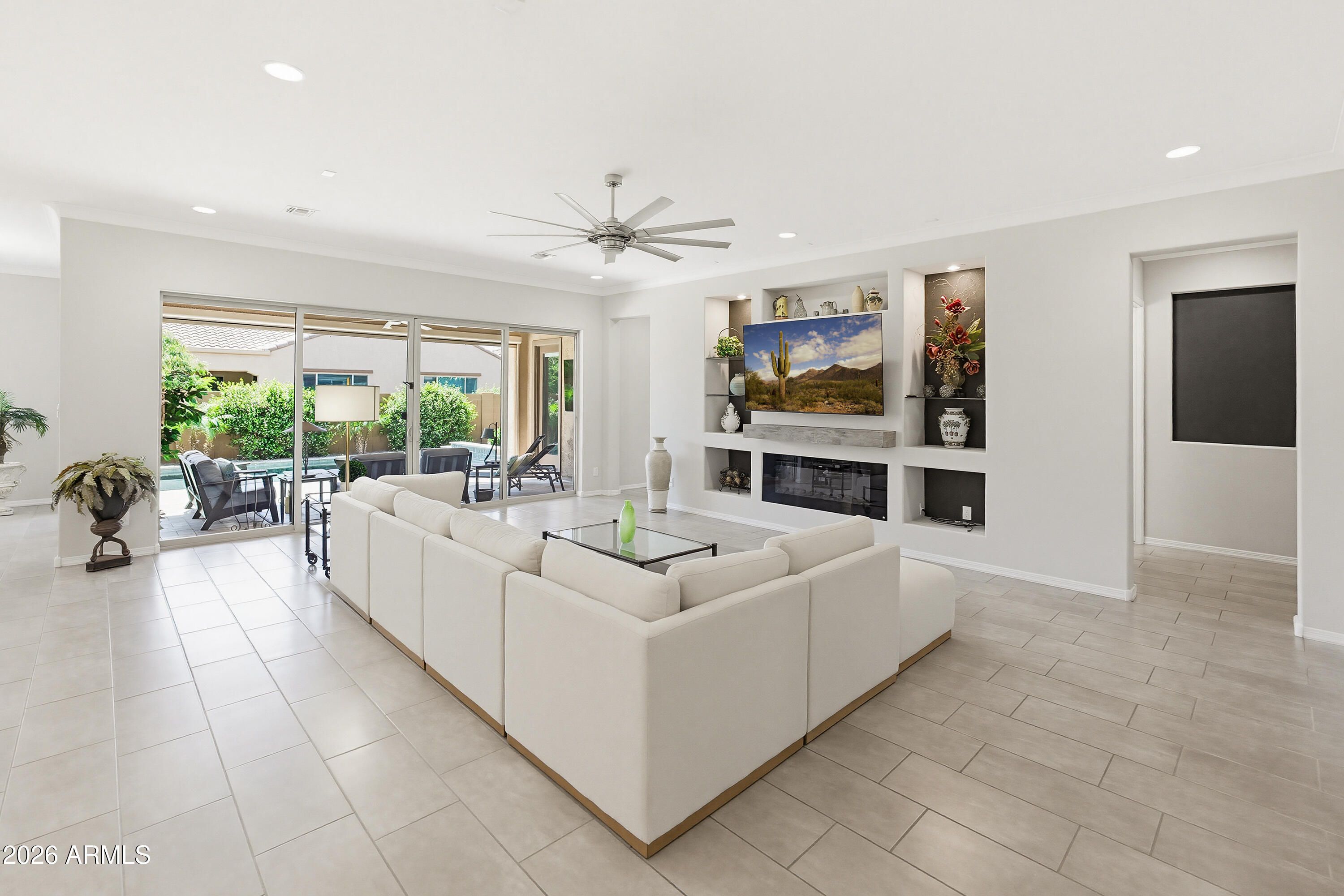 The Voyage plan w/ OWNED SOLAR--offering 3 bedrooms + den/office & 3.5 baths w/ a split layout that just makes sense--primary suite tucked away for privacy while both guest rooms feature their own en suite baths. Primary also includes a rare pass-through to the laundry room & separate his & her closets. Open kitchen/great room setup--gas cooktop, built-in oven/micro, quartz countertops & custom dry bar, all overlooking the great room w/ A/V wall, fireplace & dbl sliding gloss doors bringing the outside in. Backyard is the showpiece--sparkling pool, pergola-covered BBQ area, misting system & motorized shade screen at covered patio...set up right for Arizona living. Premium corner lot w/ a custom gated front courtyard. An epoxy 3-car garage w/ built-in storage cabinets...a diamond indeed!