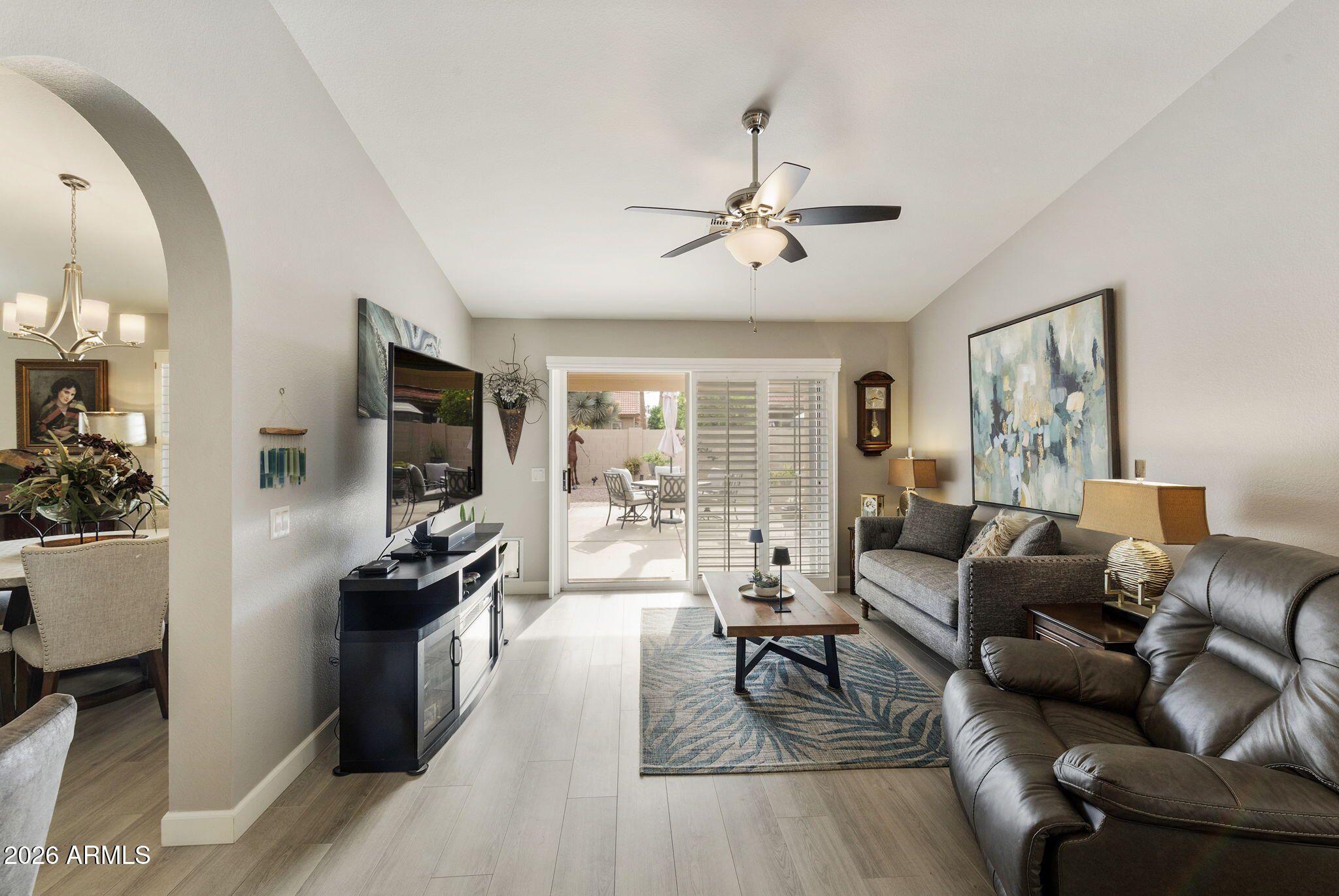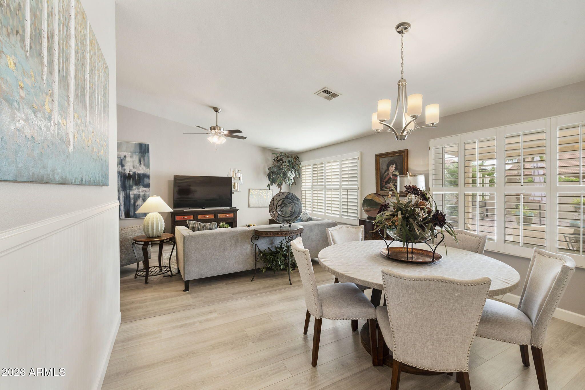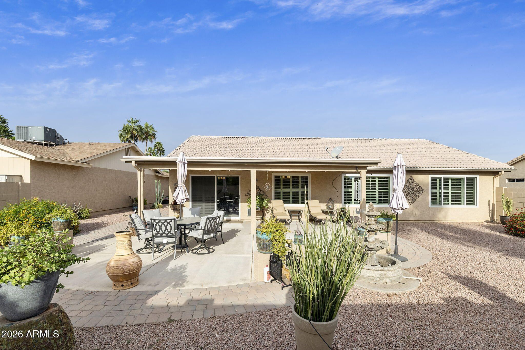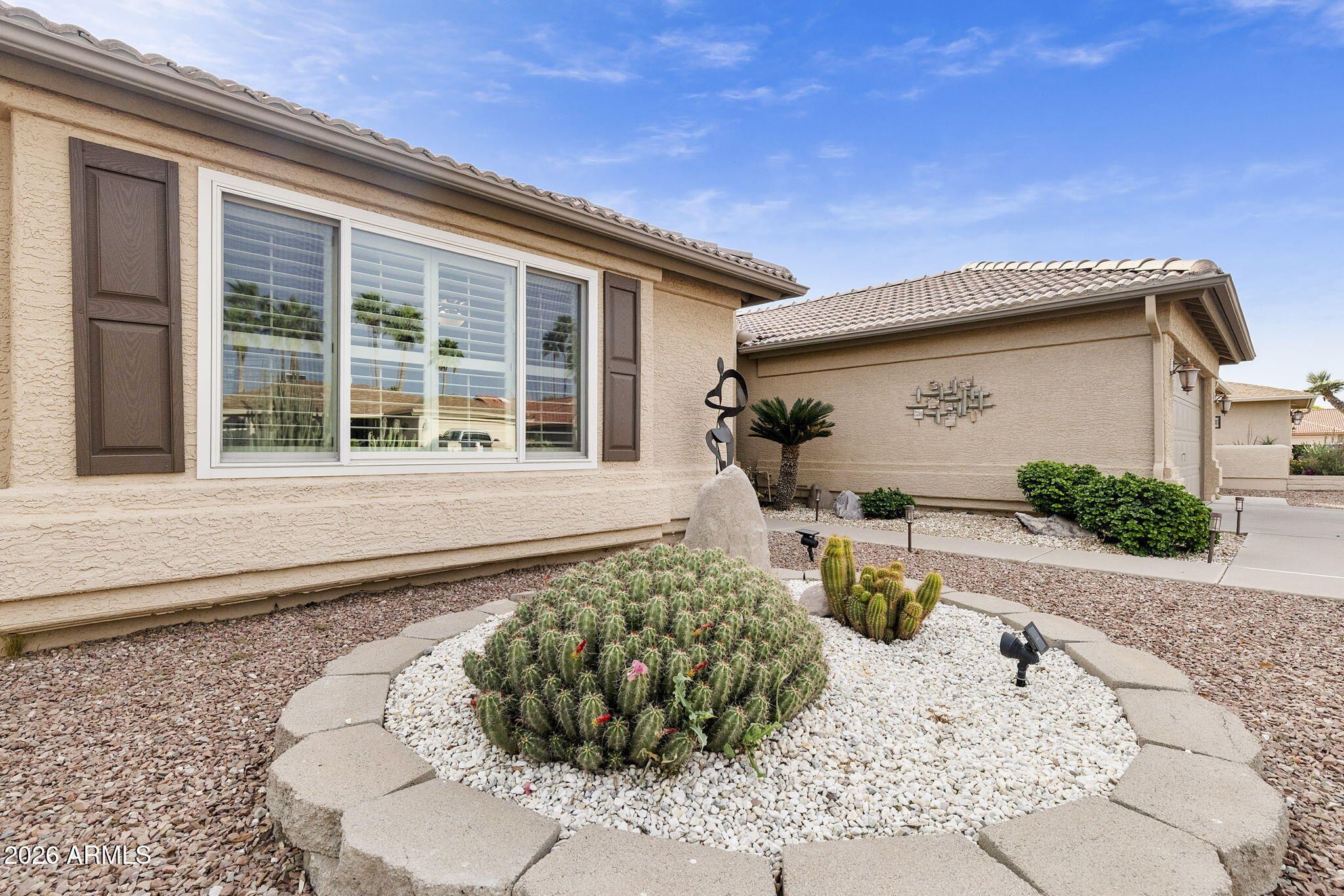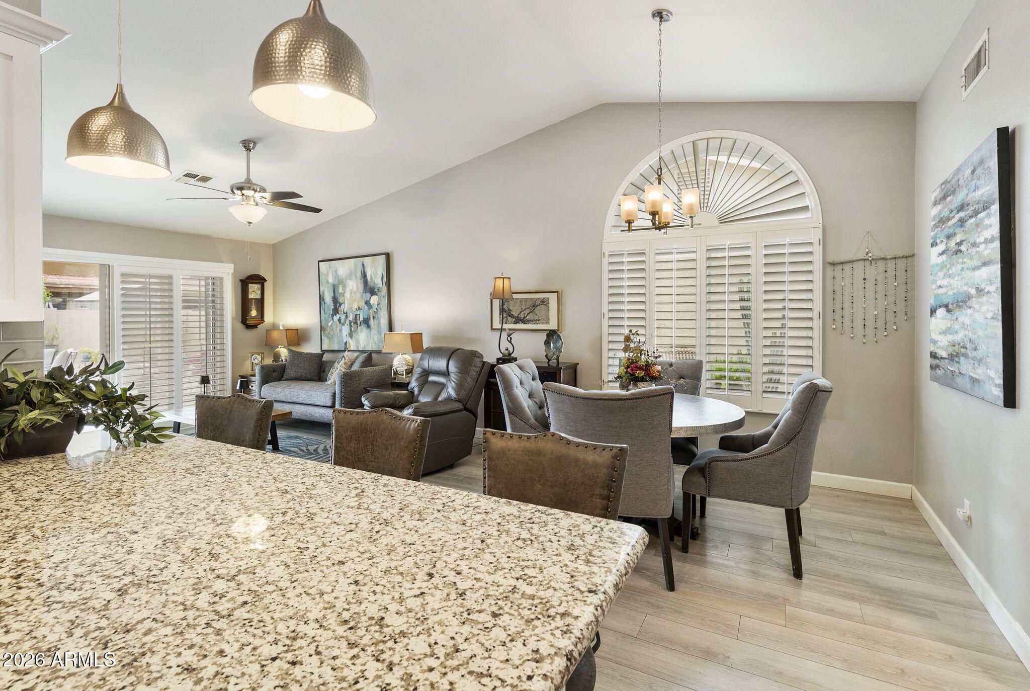 Updated 2BR, 2BA Palacia model in the highly desirable active adult community of Cottonwood at Sun Lakes. Great curb appeal w/designer steel door. Great room with amazing light, vaulted ceilings, ceramic plank tile flooring throughout the entire house and plantation shutters. Kitchen features updated shaker cabinets, granite counters, subway tile backsplash, and SS appliances. Family room off kitchen w/slider to the immaculate and charming backyard with extended patio bordered by a pavered strip that extends along the side of the house. Spacious primary suite w/vaulted ceilings, updated cabinets, granite counters and a walk-in shower. All but 3 windows are new Anderson windows! New drip system in backyard. This one is truly move-in ready. Start enjoying the amazing amenities of SEE MORE Cottonwood with golf, tennis, pickleball, pools, fitness, a great restaurant, and so many clubs!