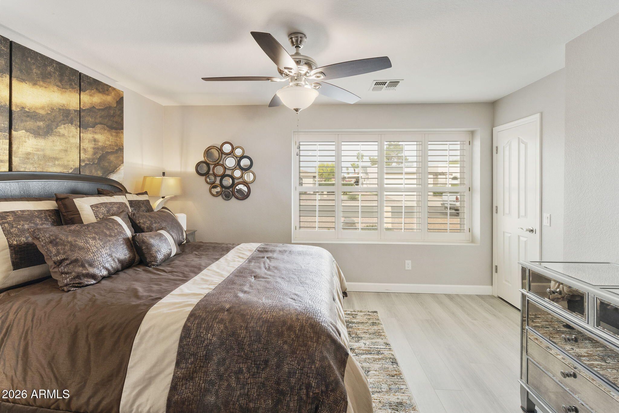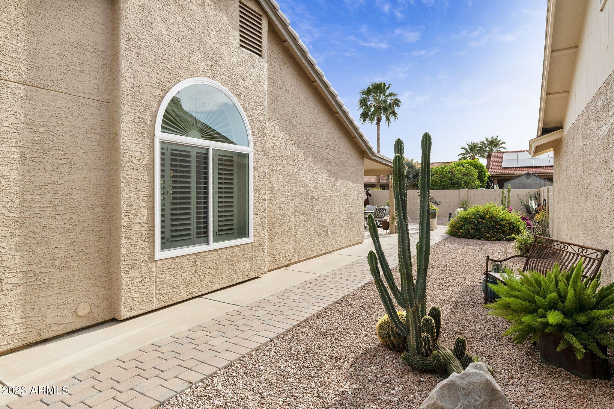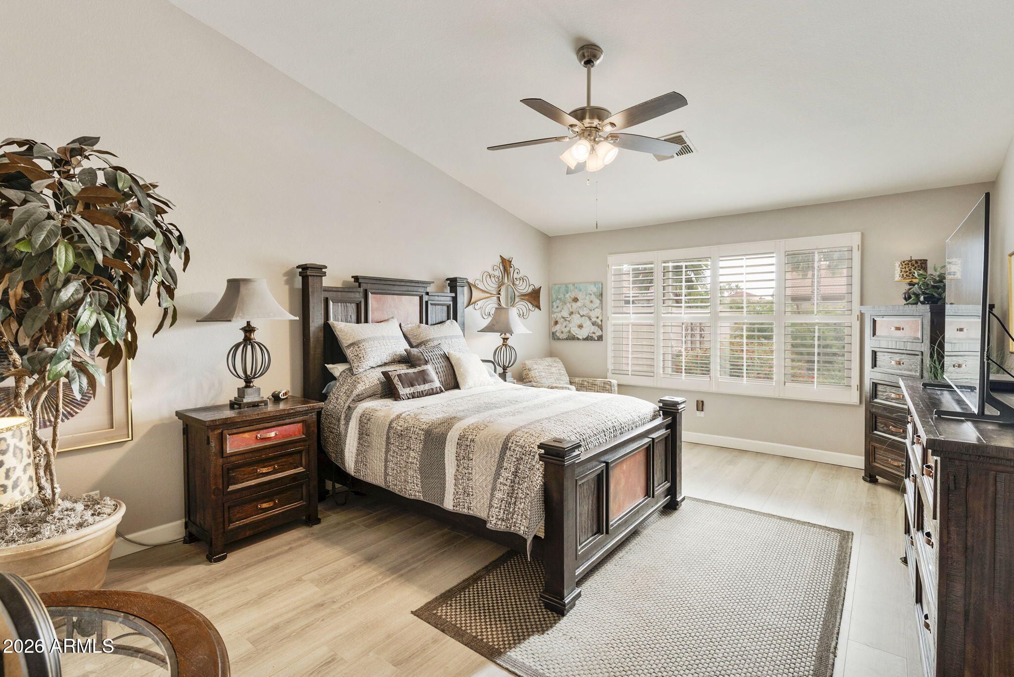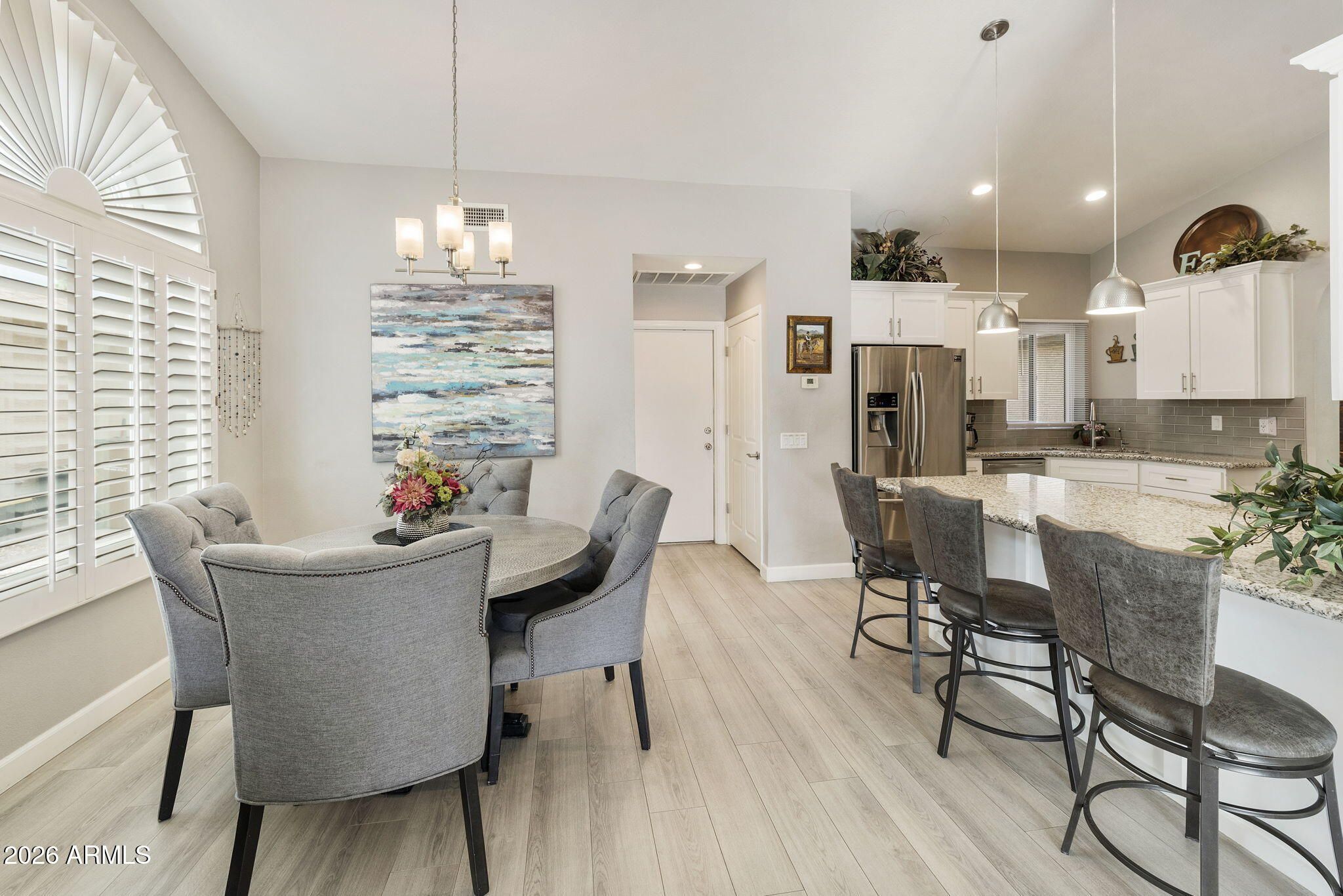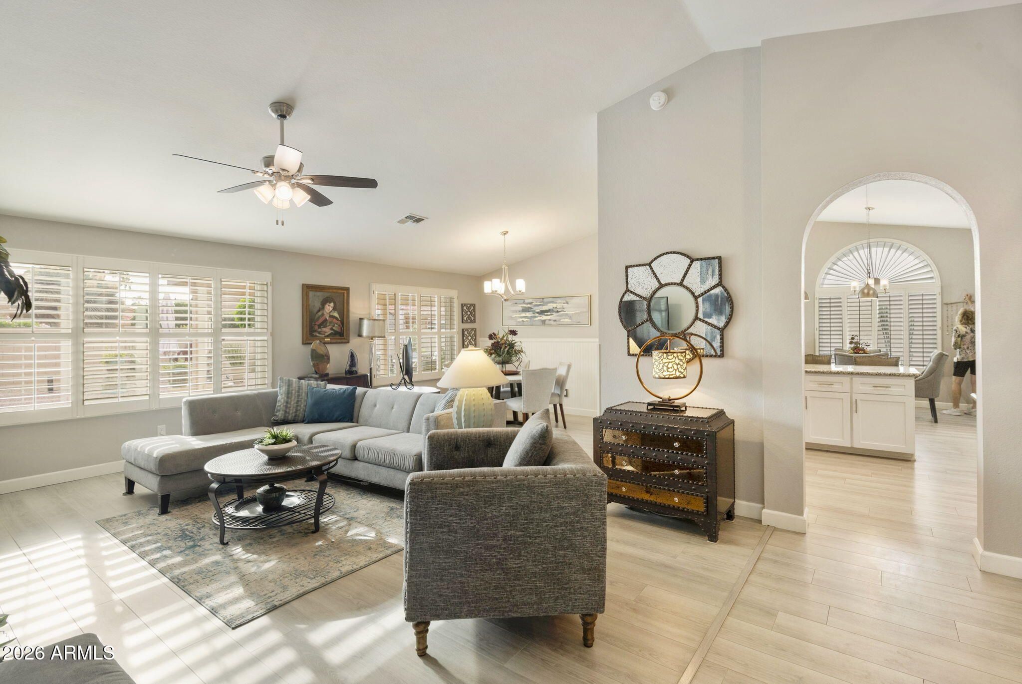 Updated 2BR, 2BA Palacia model in the highly desirable active adult community of Cottonwood at Sun Lakes. Great curb appeal w/designer steel door. Great room with amazing light, vaulted ceilings, ceramic plank tile flooring throughout the entire house and plantation shutters. Kitchen features updated shaker cabinets, granite counters, subway tile backsplash, and SS appliances. Family room off kitchen w/slider to the immaculate and charming backyard with extended patio bordered by a pavered strip that extends along the side of the house. Spacious primary suite w/vaulted ceilings, updated cabinets, granite counters and a walk-in shower. All but 3 windows are new Anderson windows! New drip system in backyard. This one is truly move-in ready. Start enjoying the amazing amenities of SEE MORE Cottonwood with golf, tennis, pickleball, pools, fitness, a great restaurant, and so many clubs!