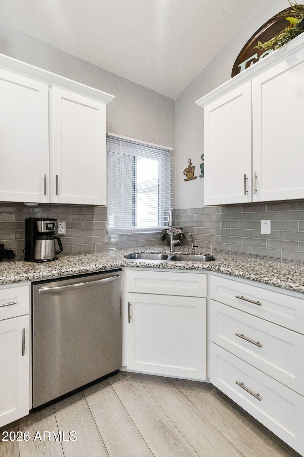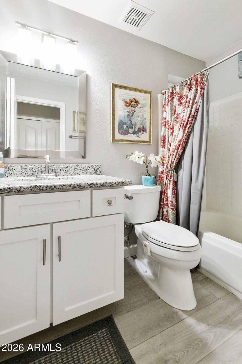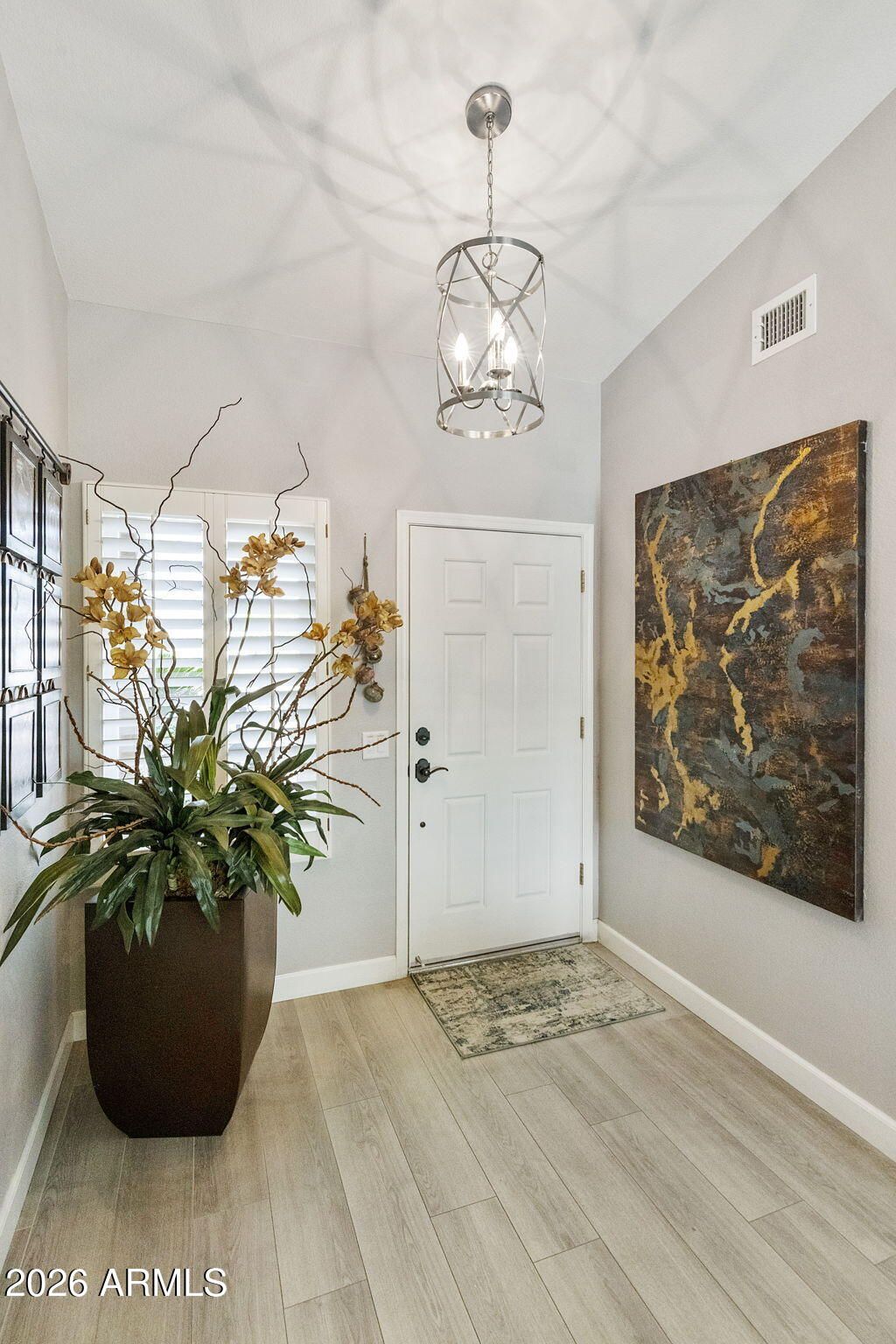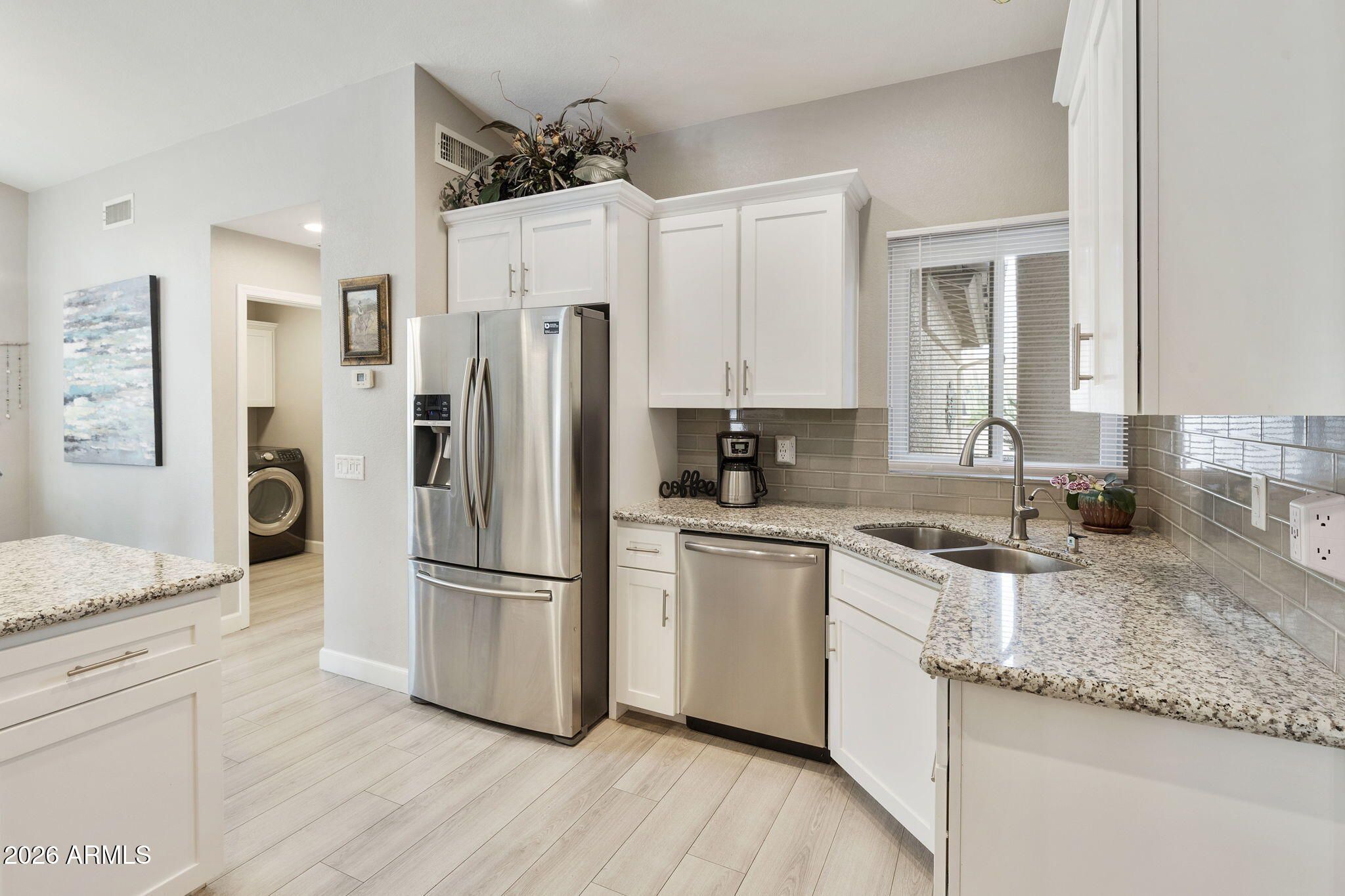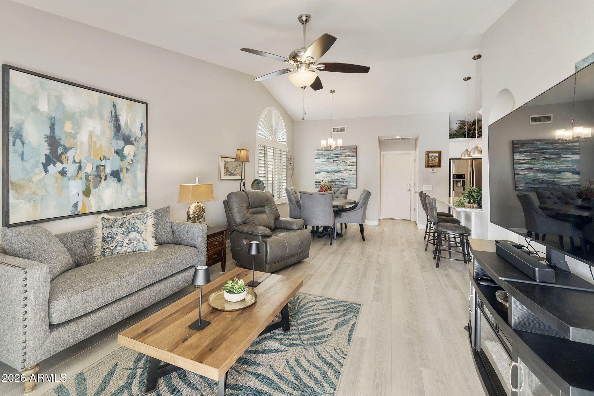 Updated 2BR, 2BA Palacia model in the highly desirable active adult community of Cottonwood at Sun Lakes. Great curb appeal w/designer steel door. Great room with amazing light, vaulted ceilings, ceramic plank tile flooring throughout the entire house and plantation shutters. Kitchen features updated shaker cabinets, granite counters, subway tile backsplash, and SS appliances. Family room off kitchen w/slider to the immaculate and charming backyard with extended patio bordered by a pavered strip that extends along the side of the house. Spacious primary suite w/vaulted ceilings, updated cabinets, granite counters and a walk-in shower. All but 3 windows are new Anderson windows! New drip system in backyard. This one is truly move-in ready. Start enjoying the amazing amenities of SEE MORE Cottonwood with golf, tennis, pickleball, pools, fitness, a great restaurant, and so many clubs!